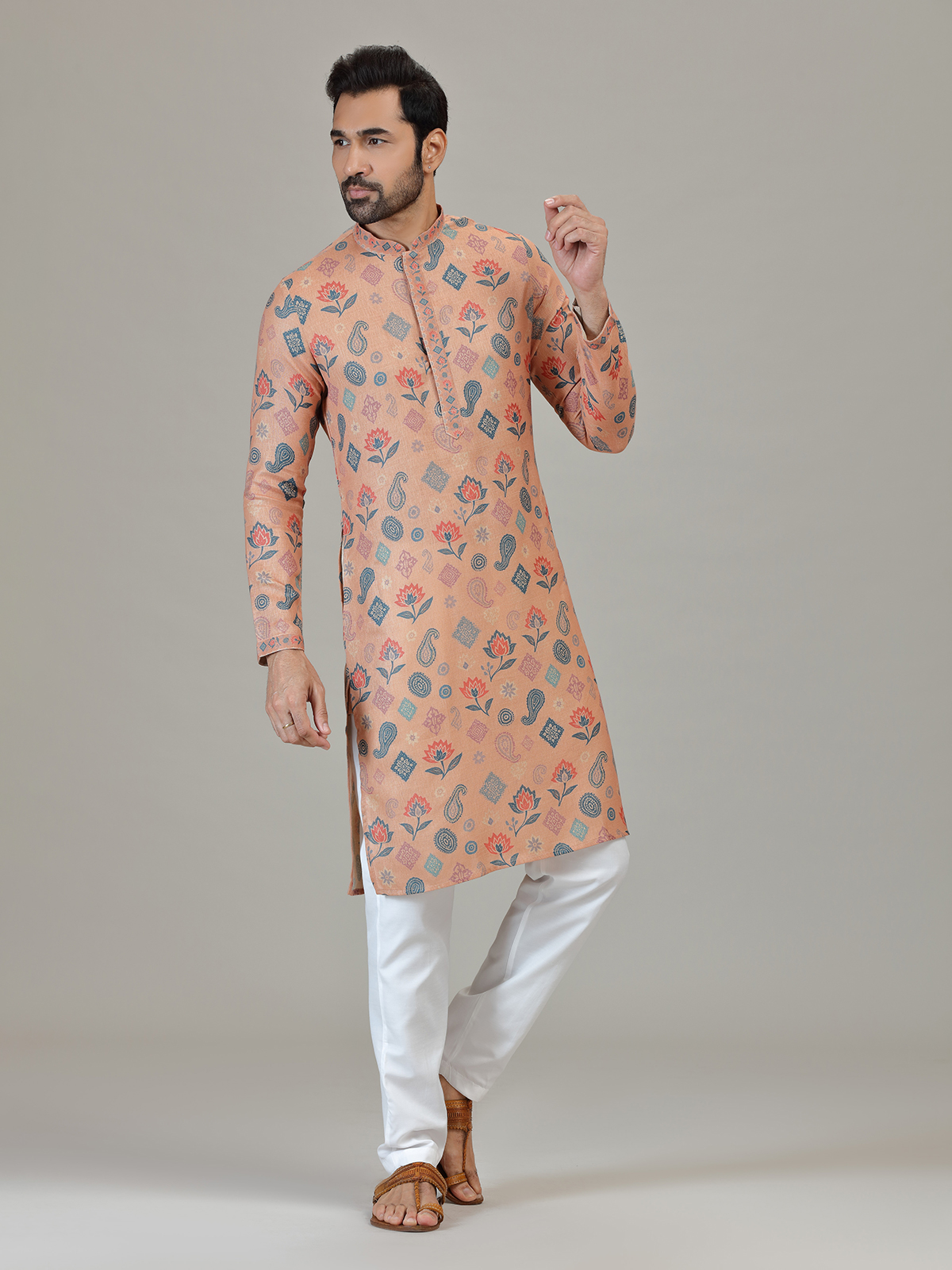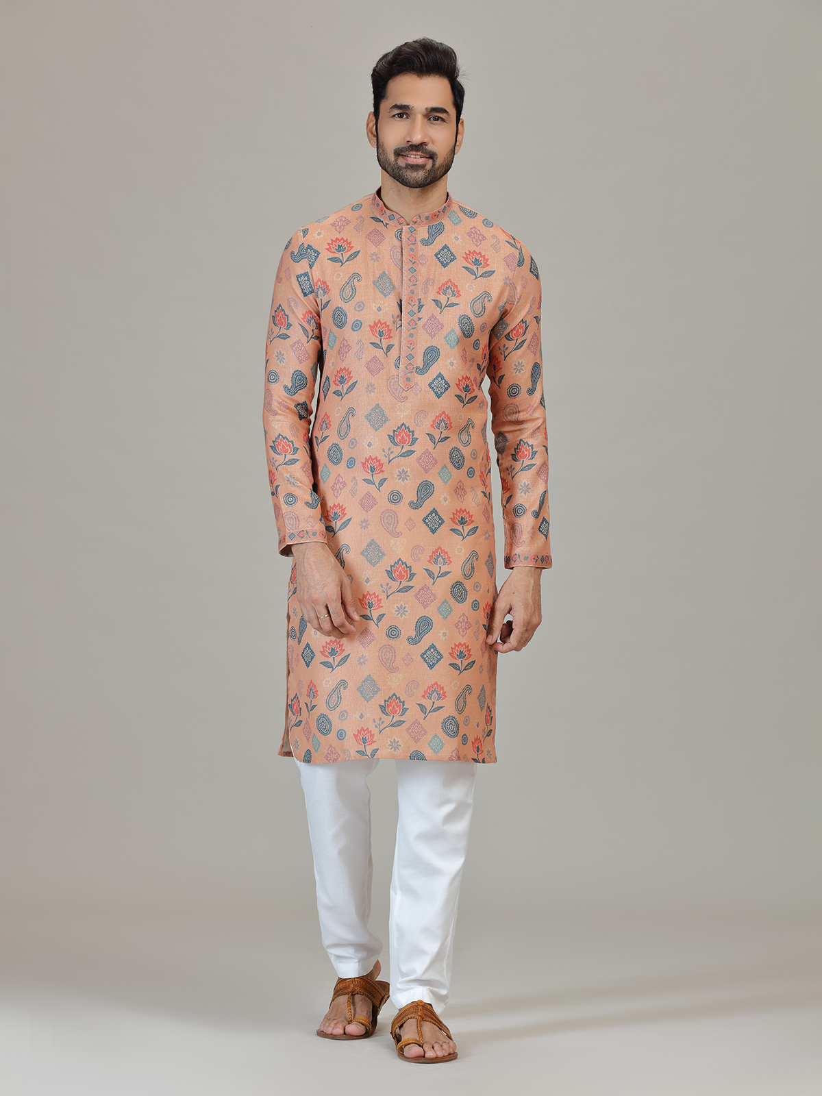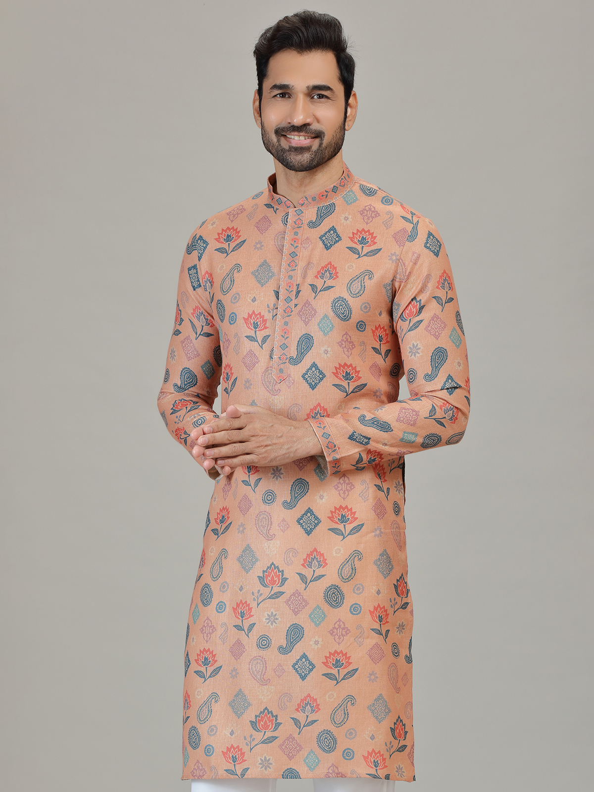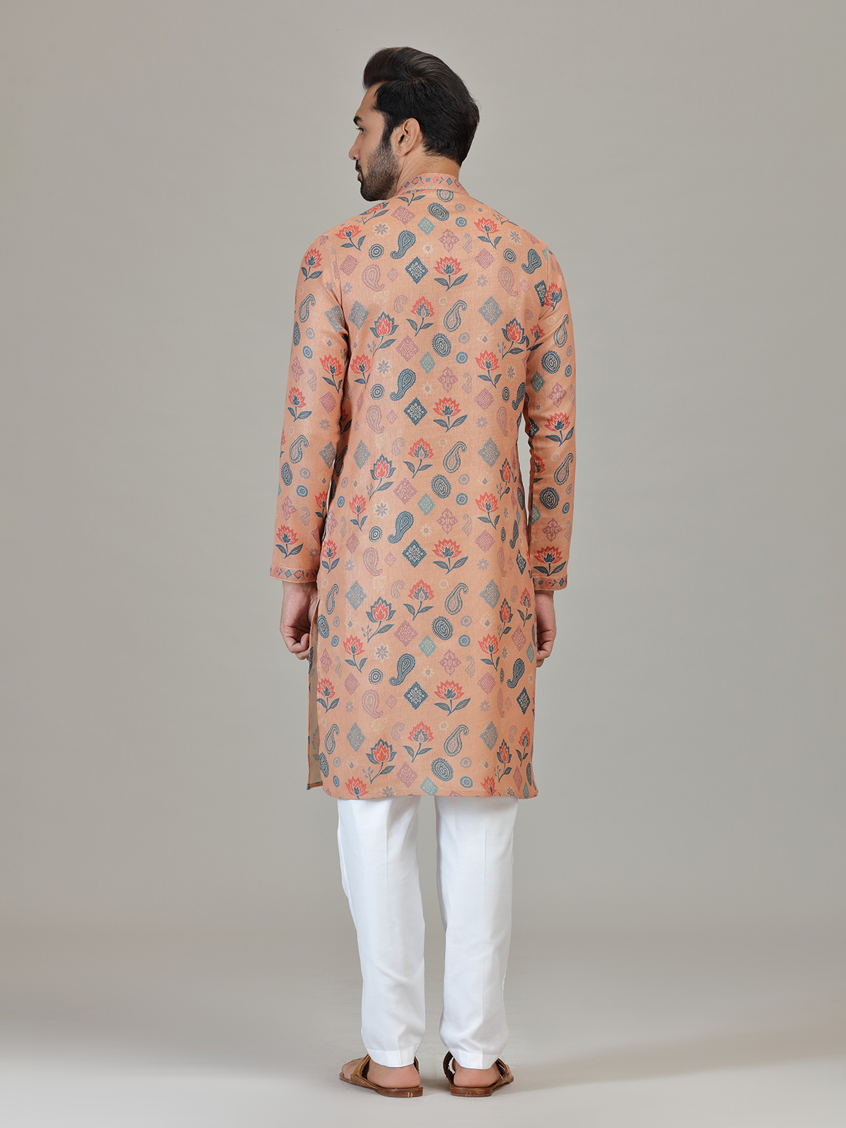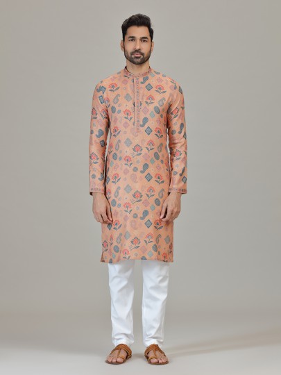 Made from peach linen featuring paisley and floral ethnic motifs in blue and rust tones. Styled with a Chinese collar, full sleeves and straight pants, suitable for wedding and celebrations.