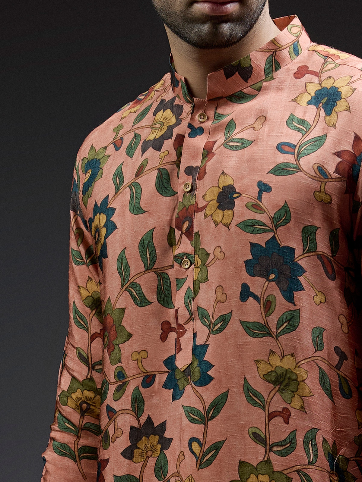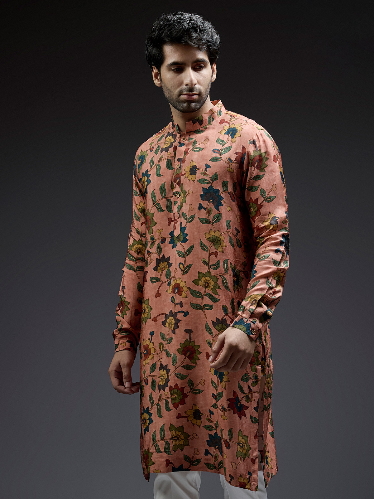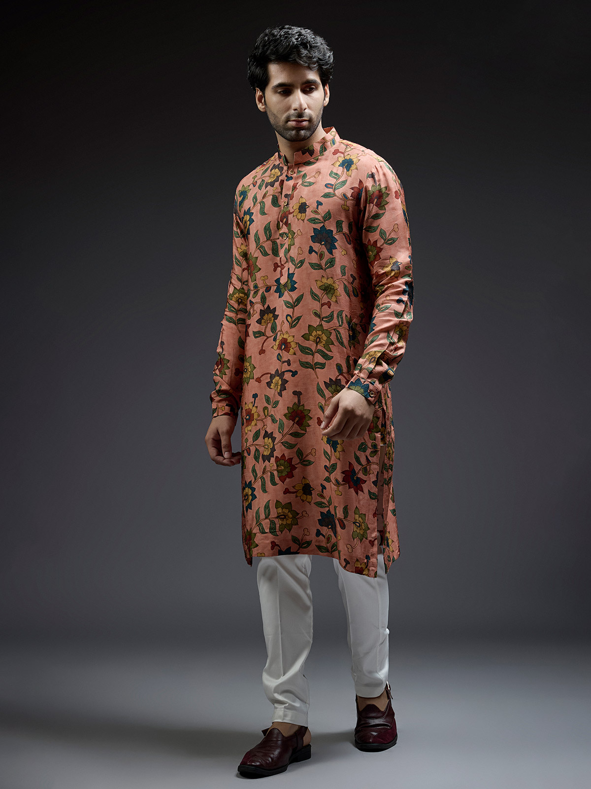 For any special occasion, this peach kurta suit is a chic option. It is embellished with a subtle pataudi design and is made of silky silk fabric. The white bottom completes the style, and the mandarin collar provides comfort.