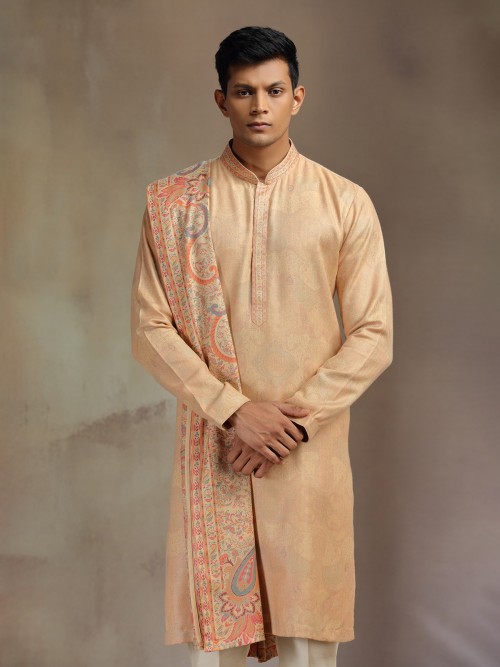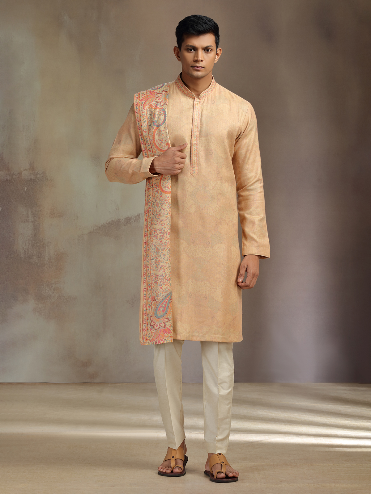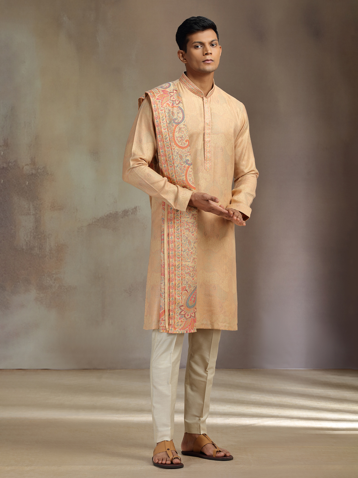 Peach Printed Pashmina Silk Kurta Pajama With Dupatta For Men