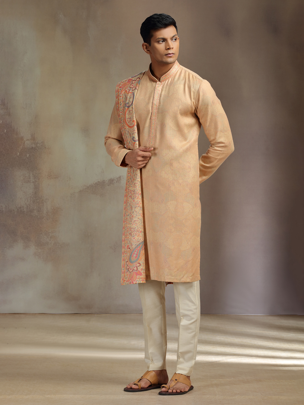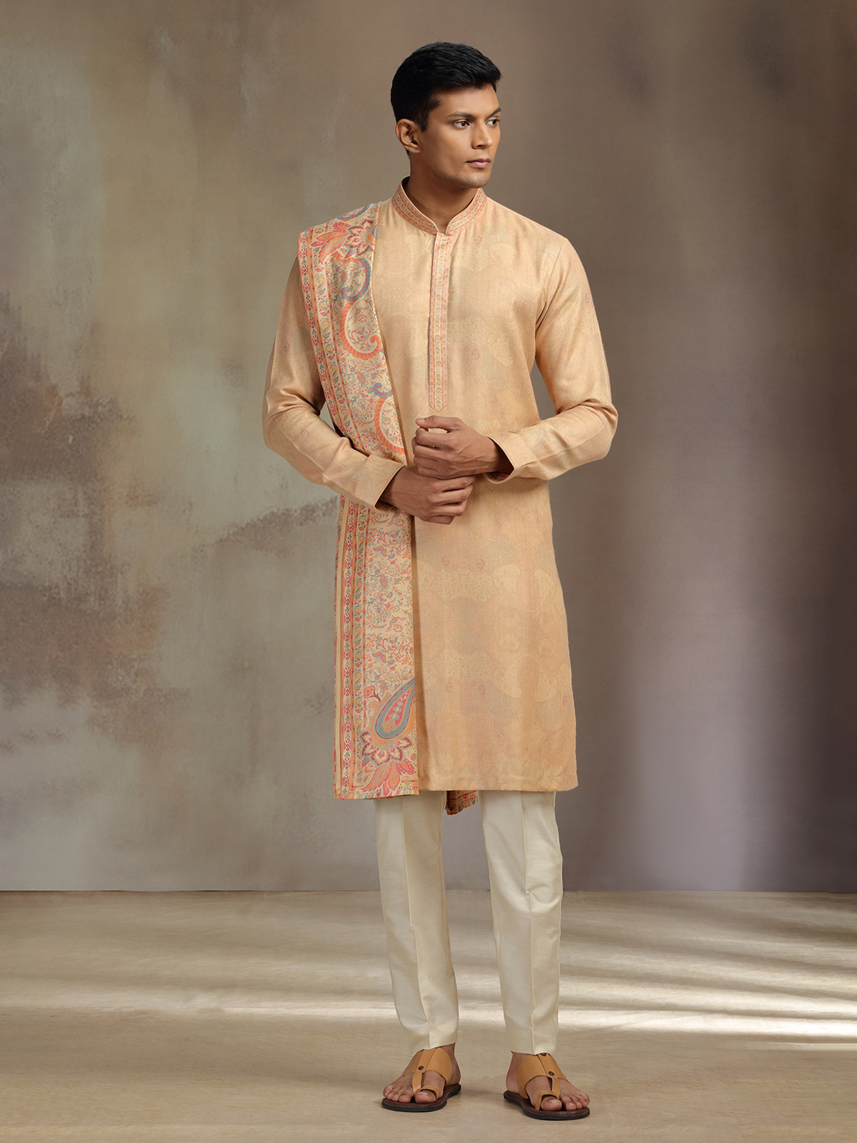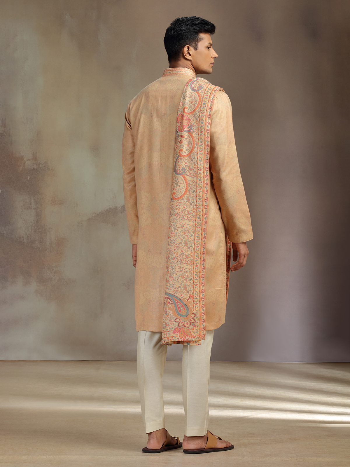 Peach Printed Pashmina Silk Kurta Pajama With Dupatta For Men