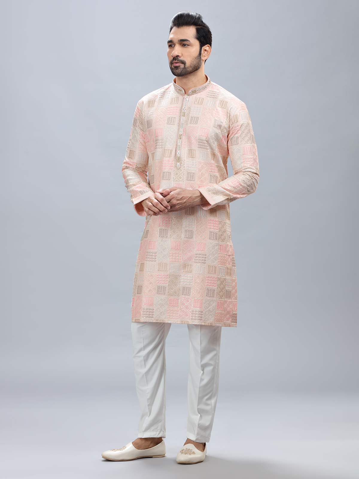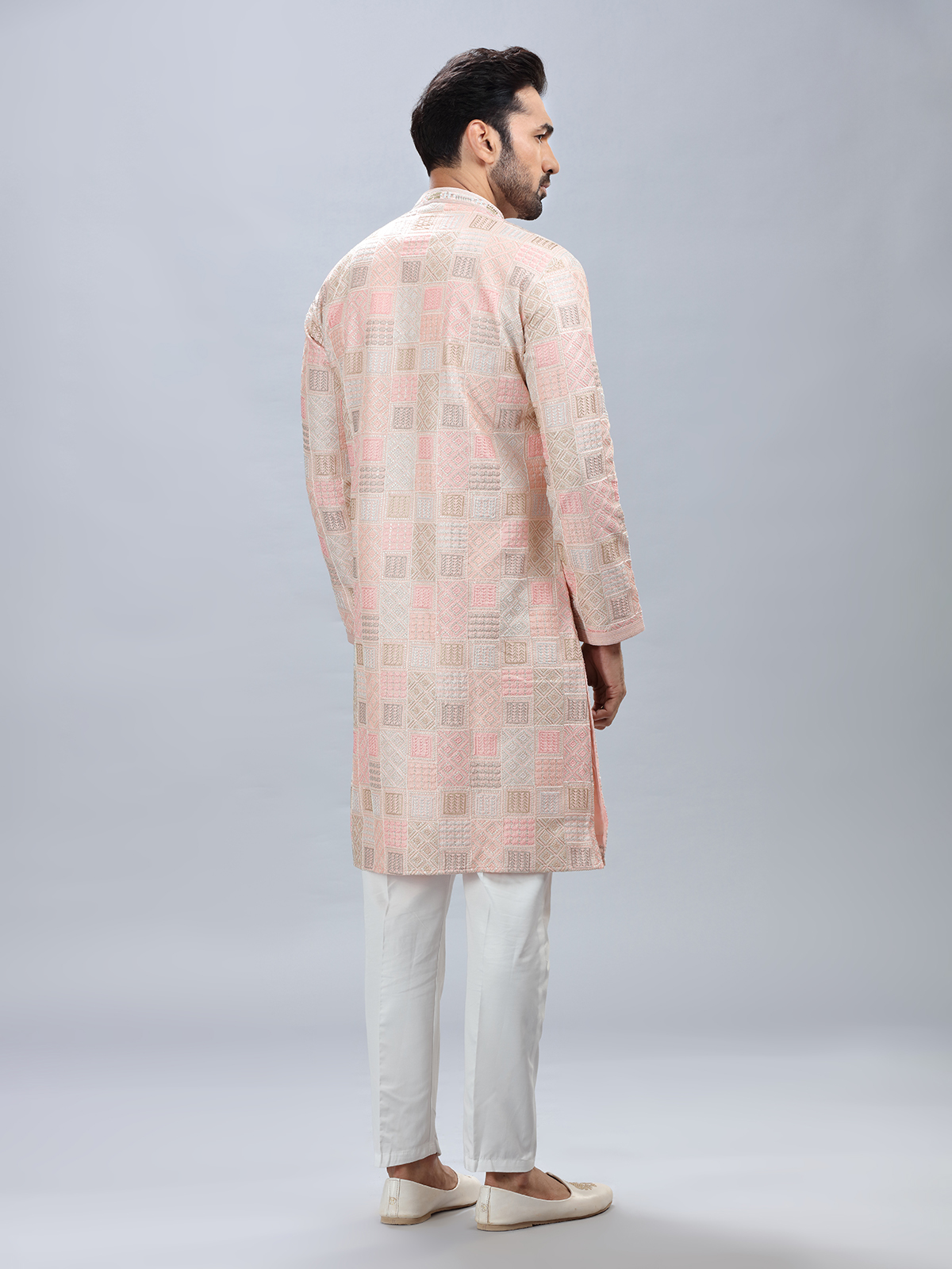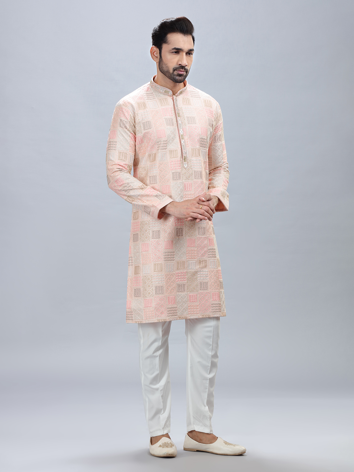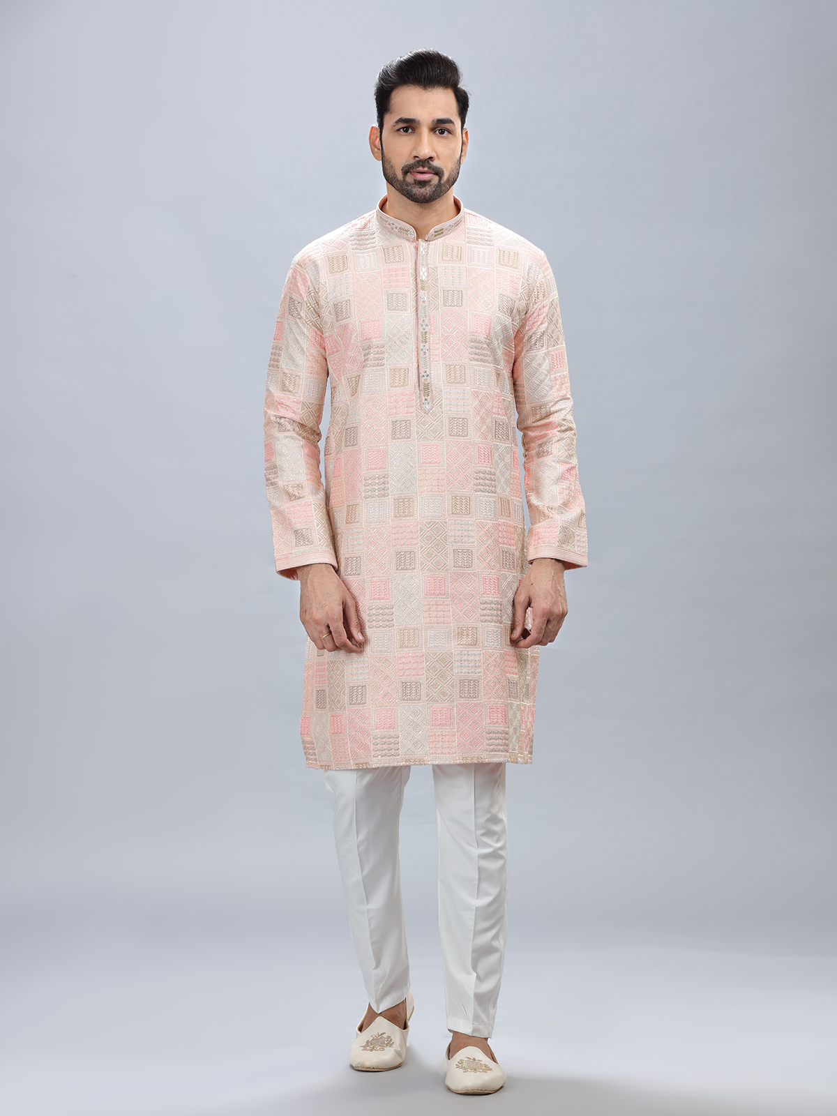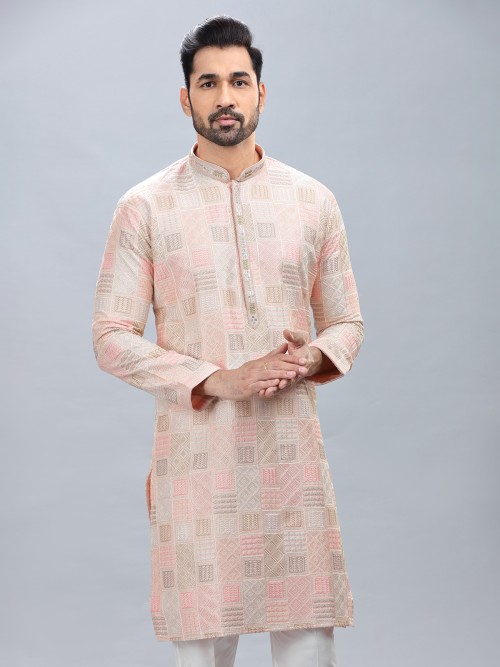 The unique patterns on this peach silk kurta ensemble will wow your friends. All you need for the festive occasion is this silk kurta set with sequins, resham, and embroidery all over it. designed with a mandarin collar, long sleeves, and a bottom.