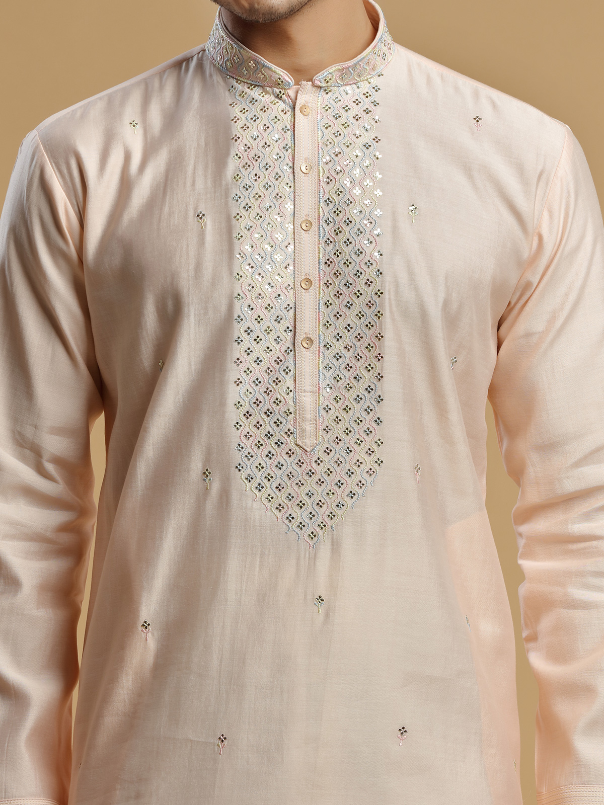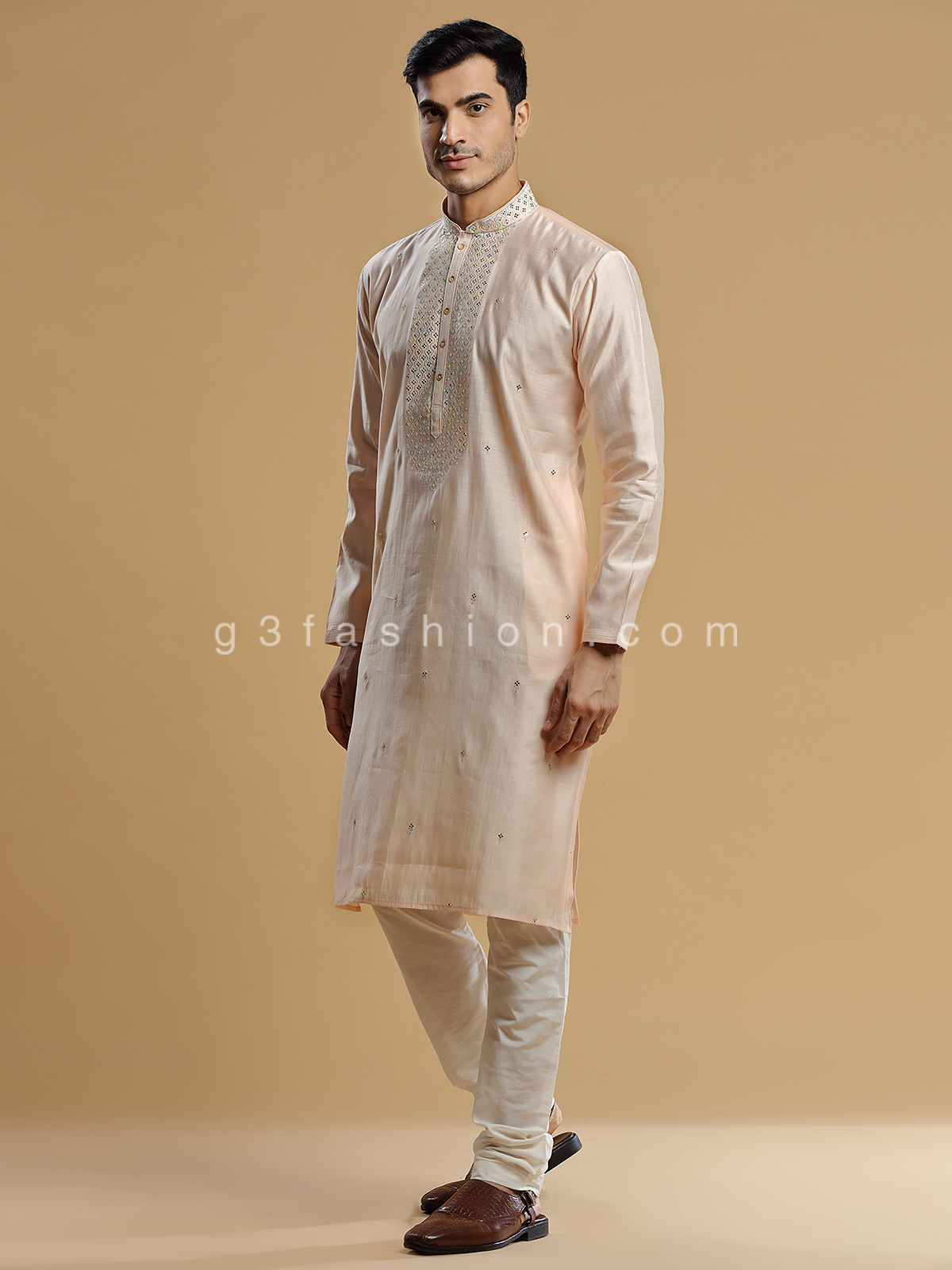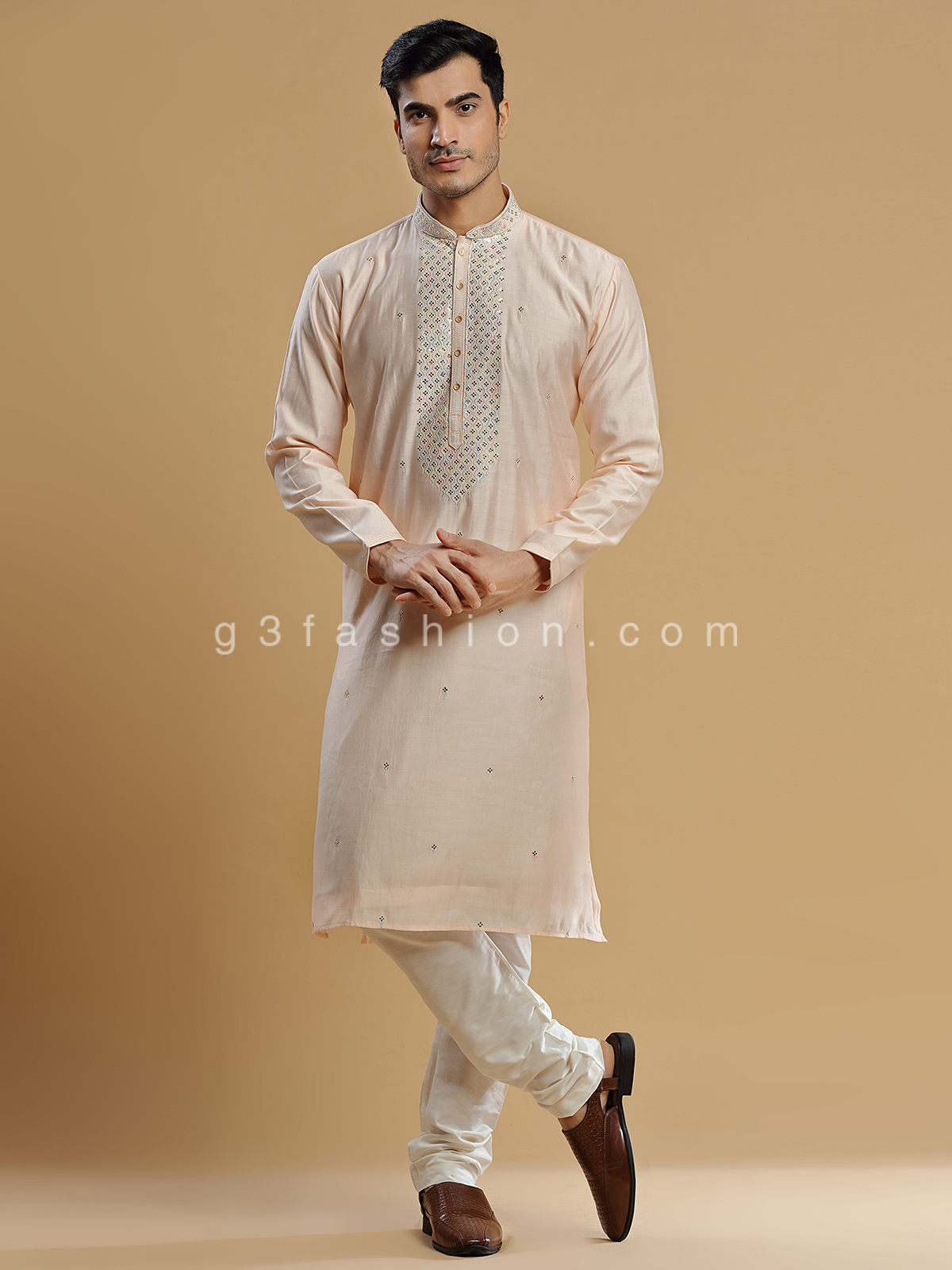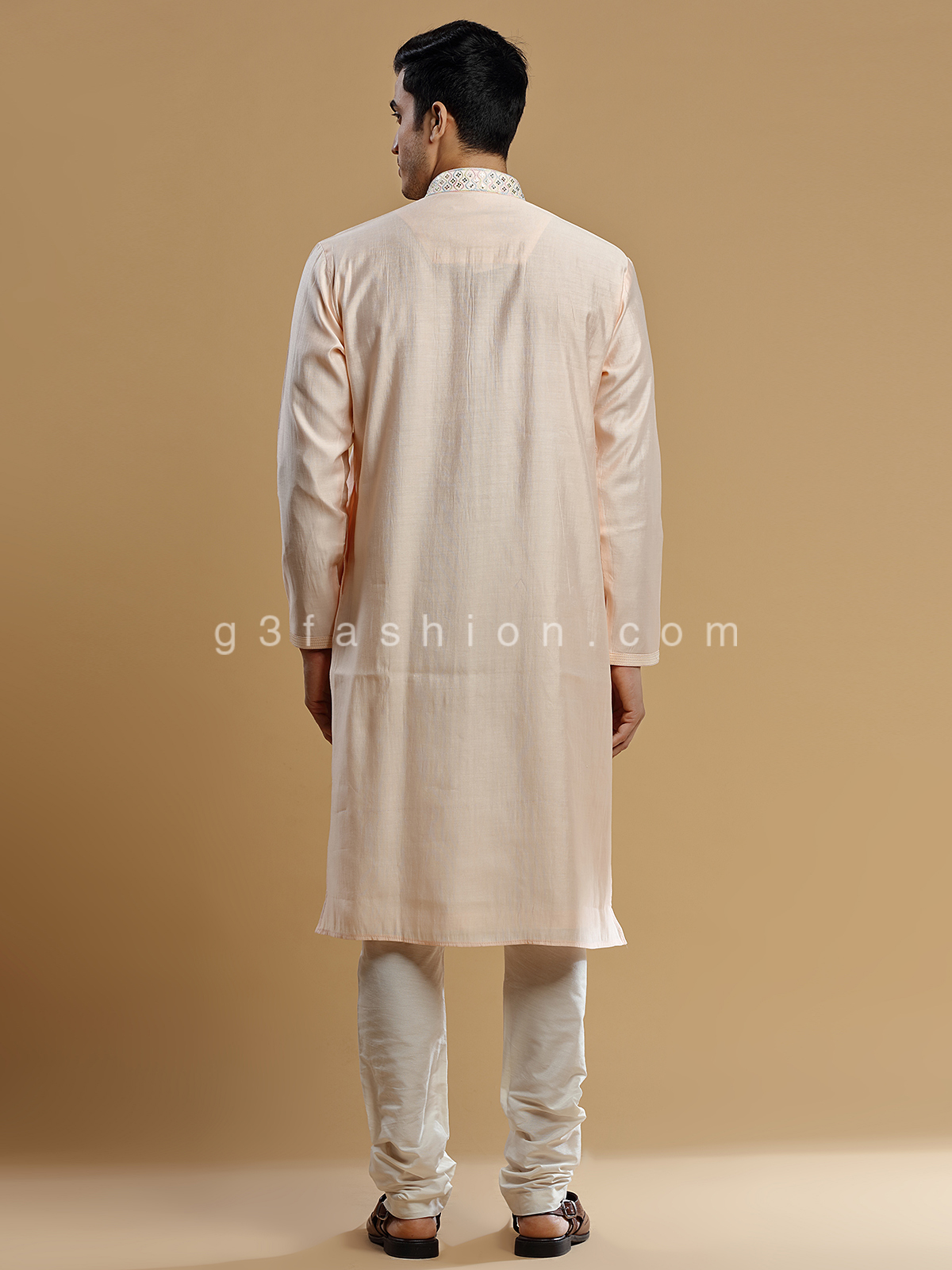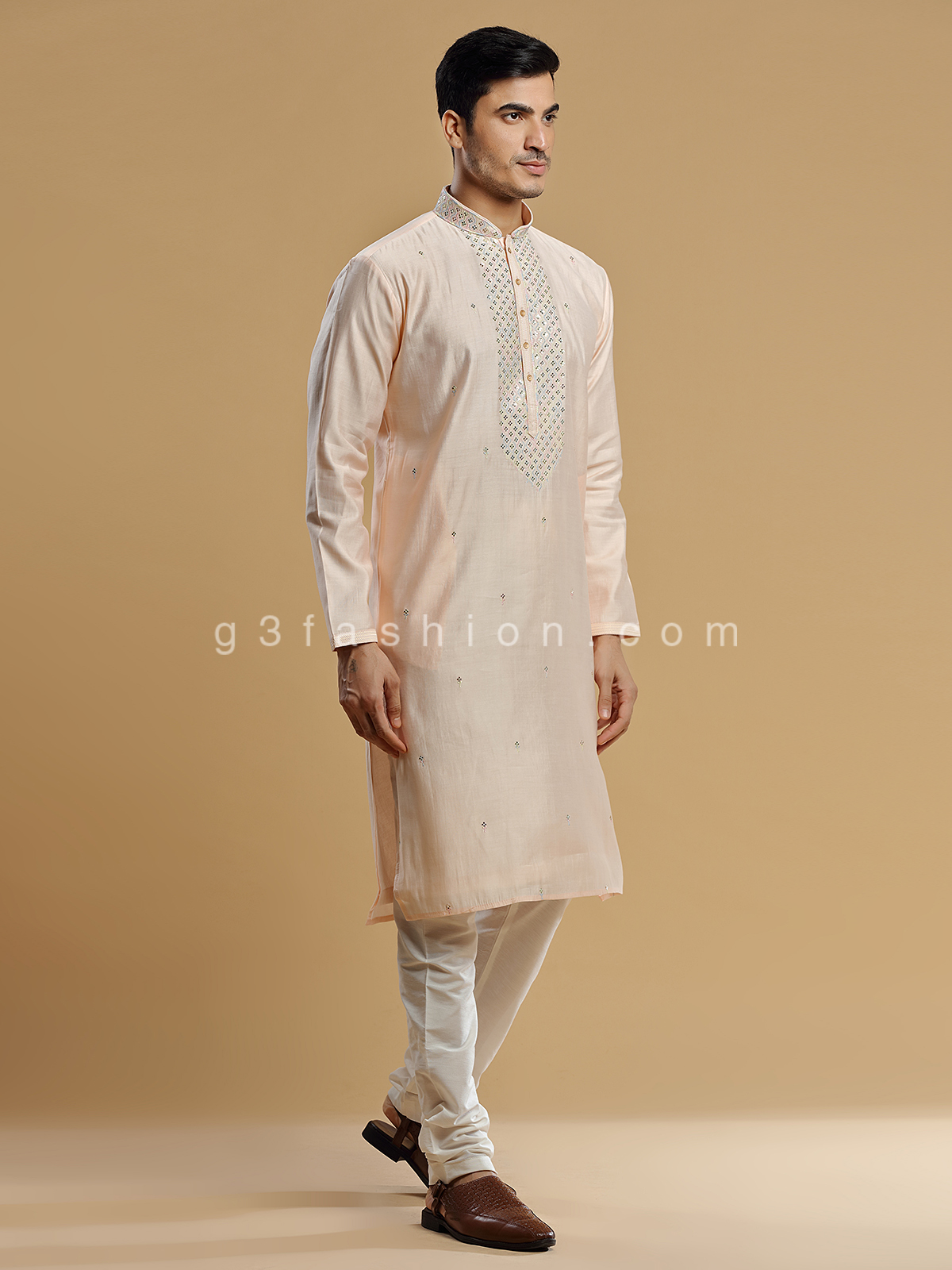 Get ready for the festive season with this amazing peach silk kurta suit. This outfit is a perfect blend of style and elegance. Adorned with sequins and thread work, it features a stand collar, half button placket, and full sleeves. It comes with a bottom.