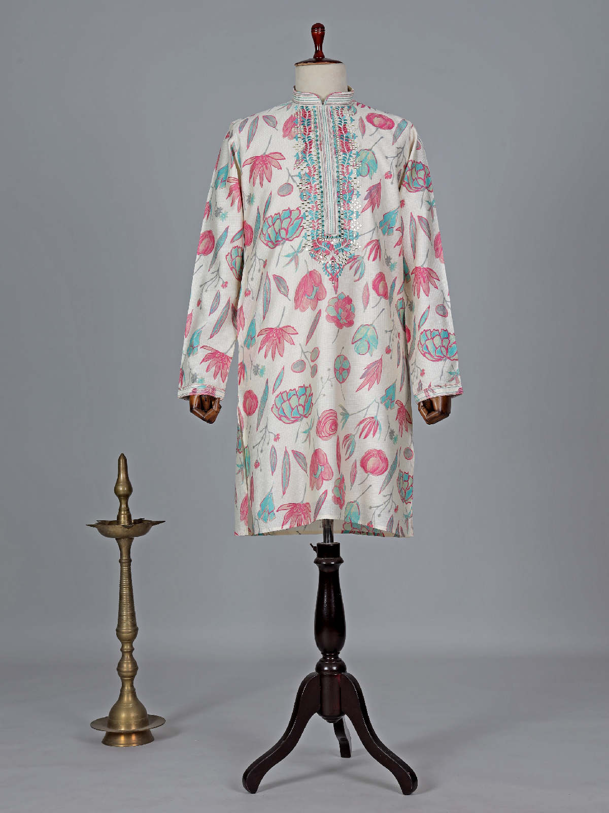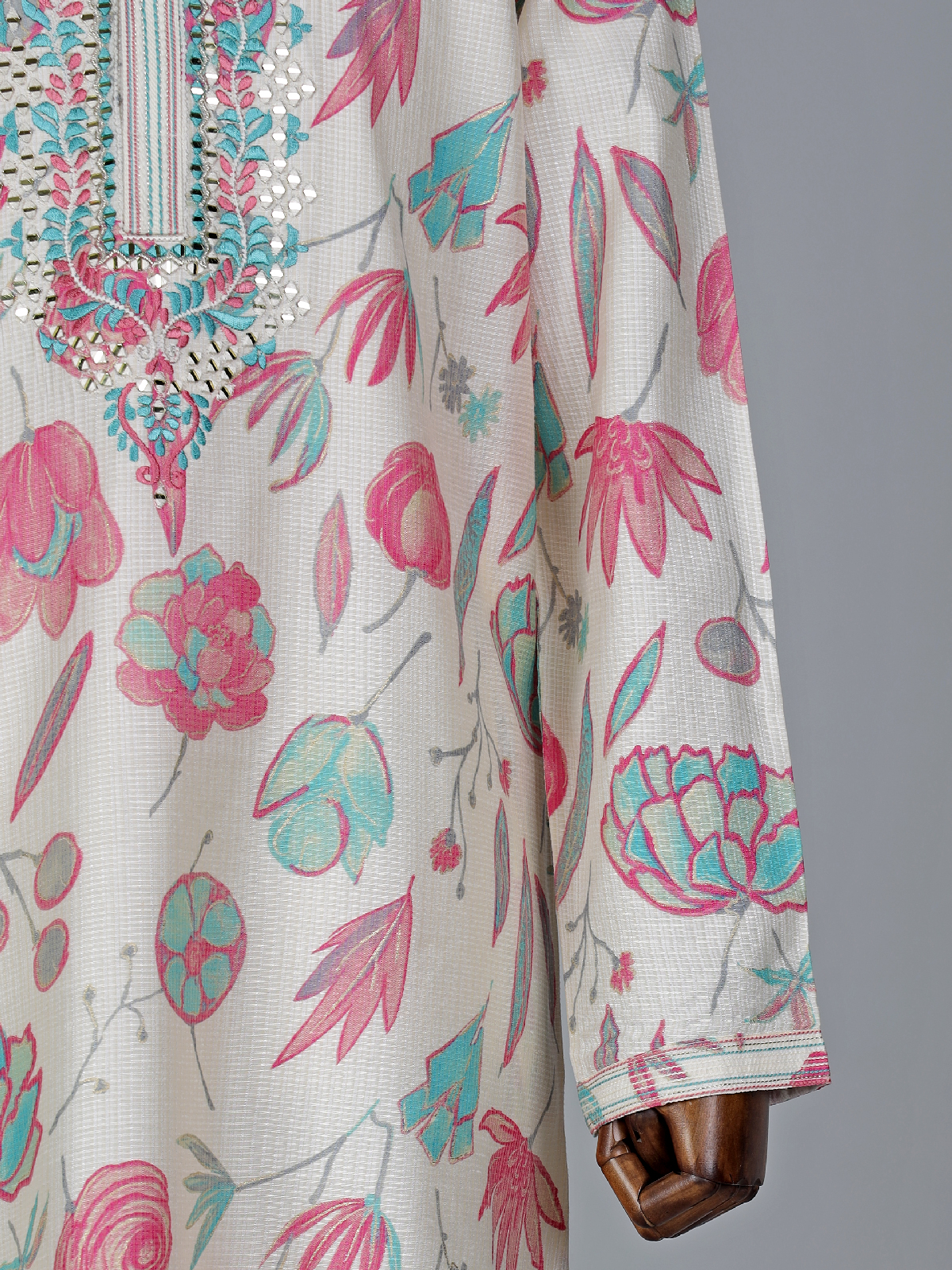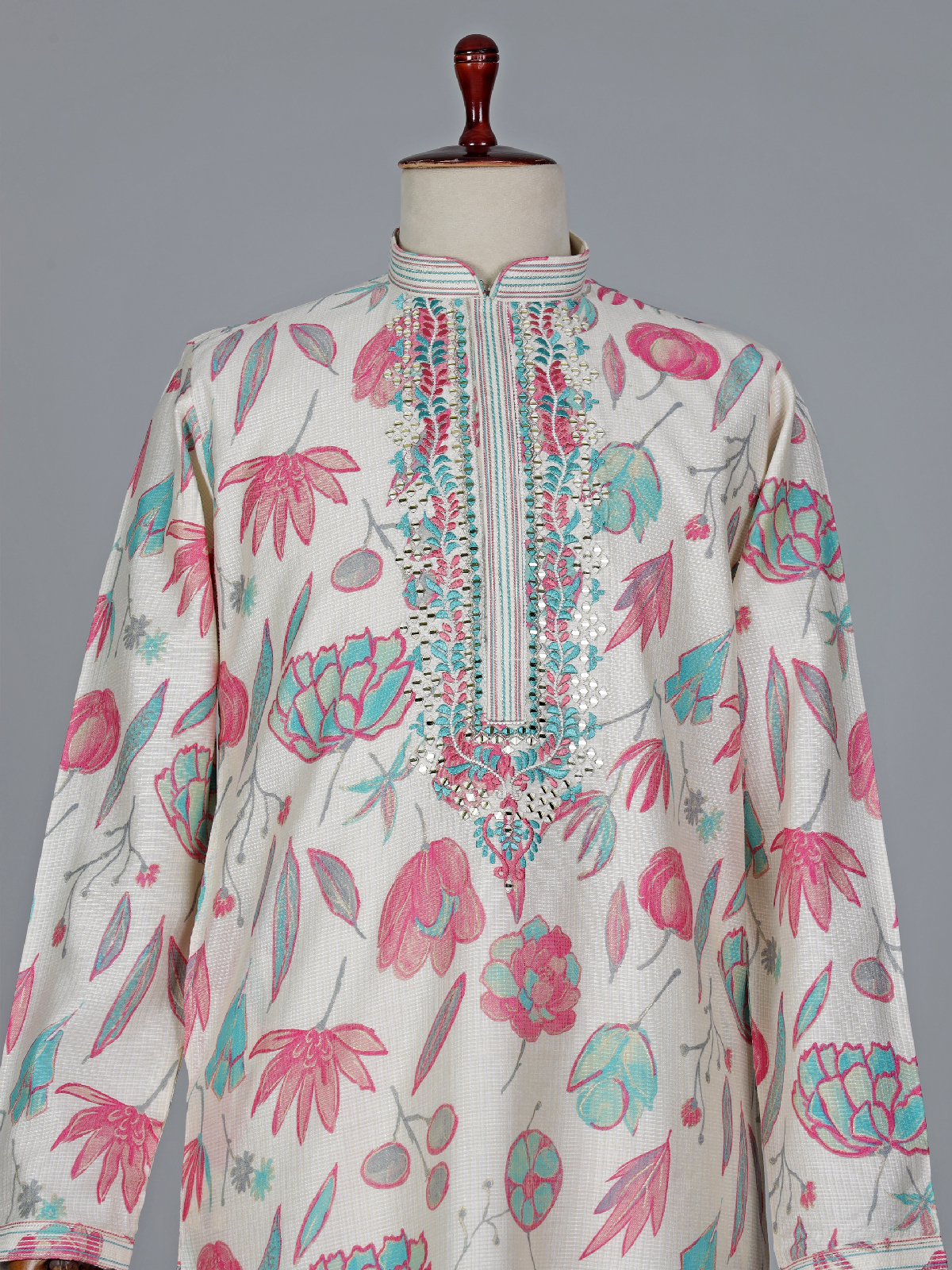 This off white and pink printed cotton silk kurta suit suit is artfully designed with mirror and embroidery work pattern. It features a mandarin collar and full sleeves. Comes with a bottom for an elegant ensemble.