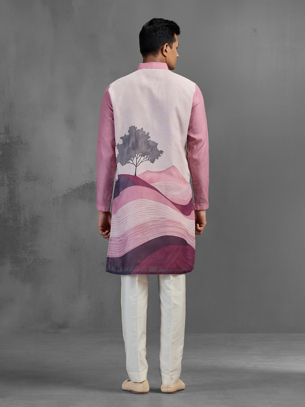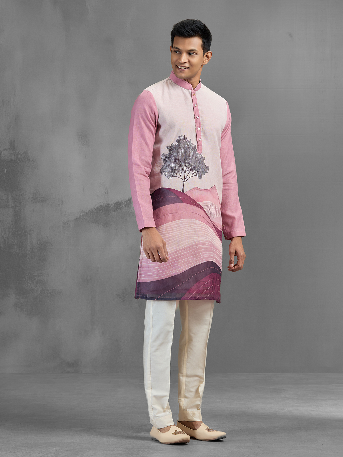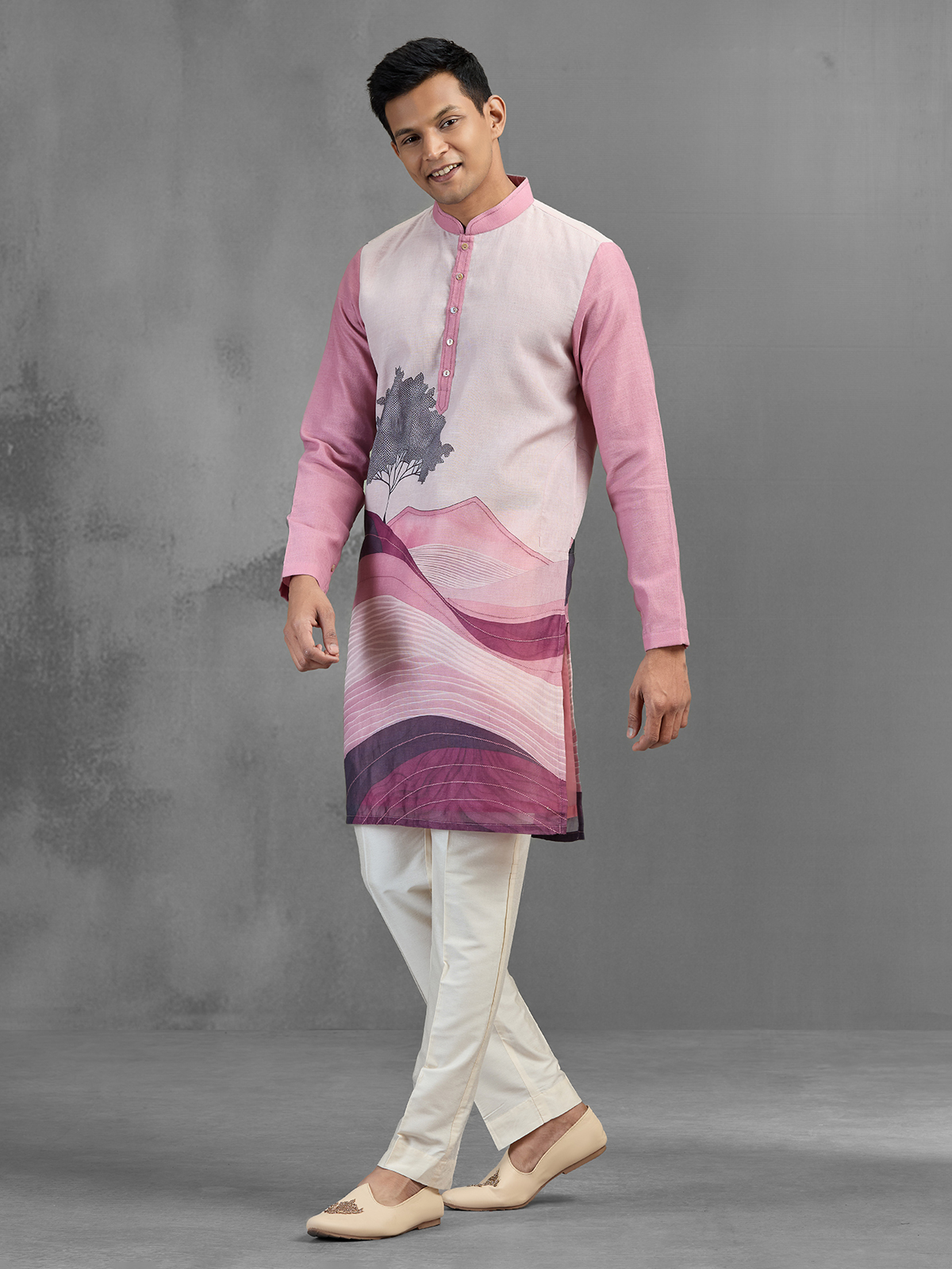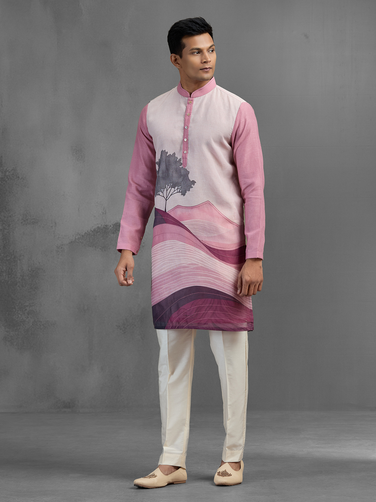 Modern and artistic, this pink cotton linen kurta pajama features a unique digital floral print with an ombre effect and tree-inspired design. The lightweight fabric ensures comfort, while the chinese collar and full sleeves add elegance. Paired with pants, it is a stylish choice for festive and reception wear.