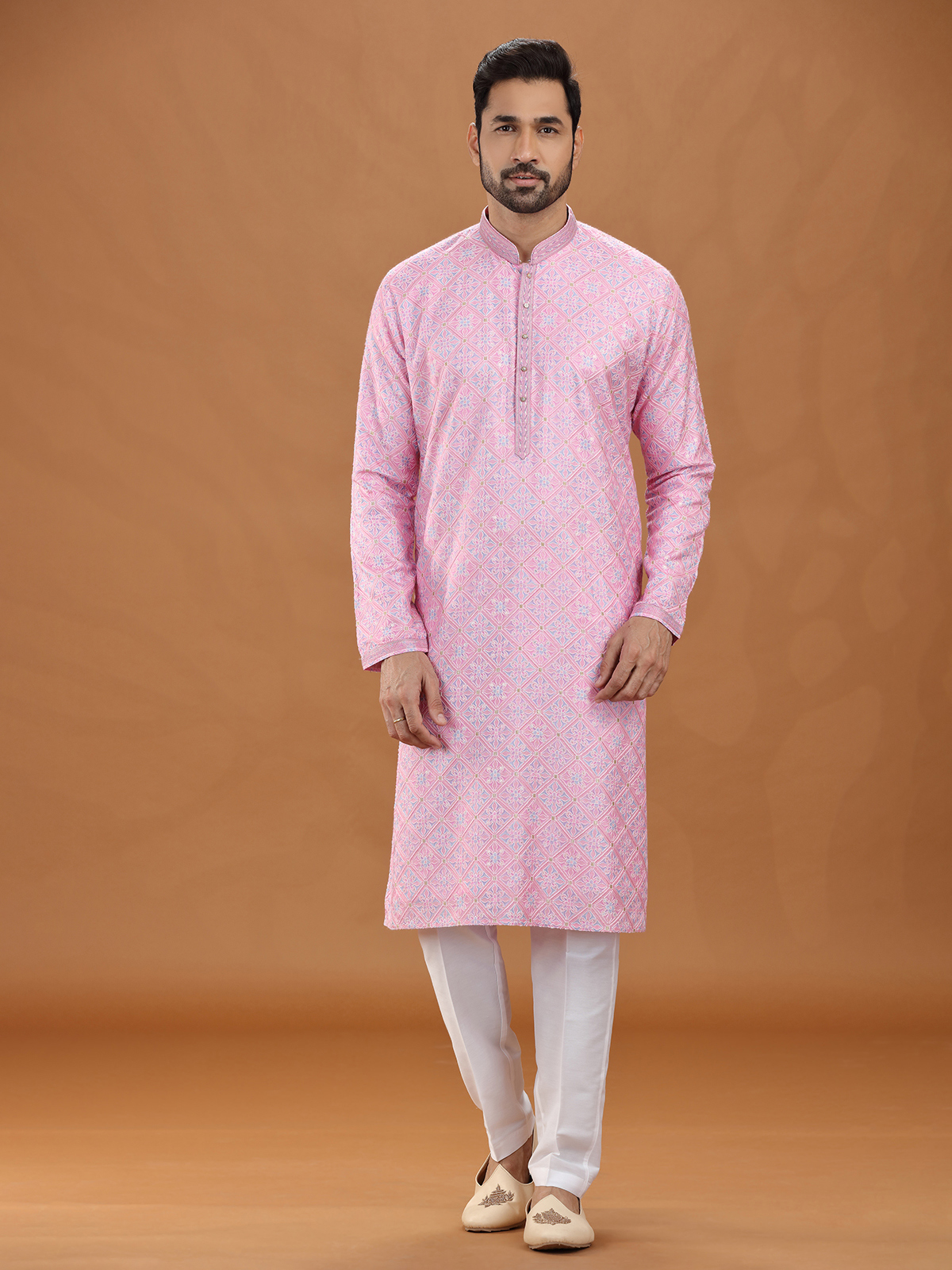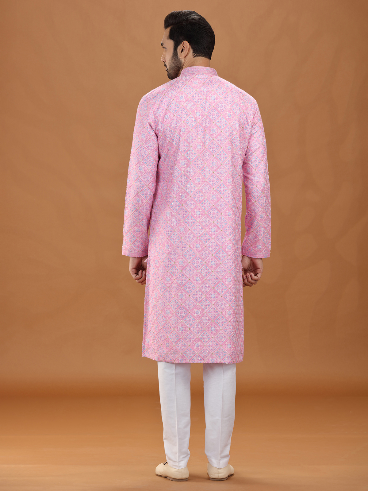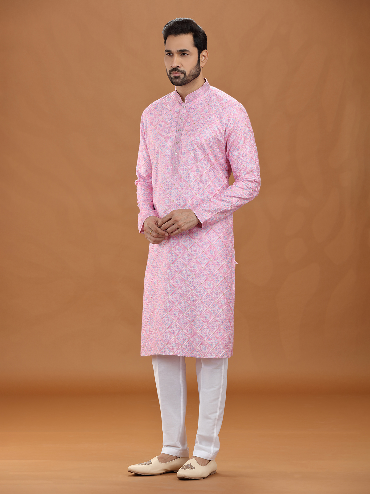 Fashioned in soft viscose, this pink kurta suit radiates grace with delicate embroidery, sequins, and thread artistry in colorful motifs. The smart stand collar and pant elevate its modern structure, offering ease and sophistication. Perfect for weddings and festive gatherings, this ensemble harmonizes timeless tradition with present-day refinement.