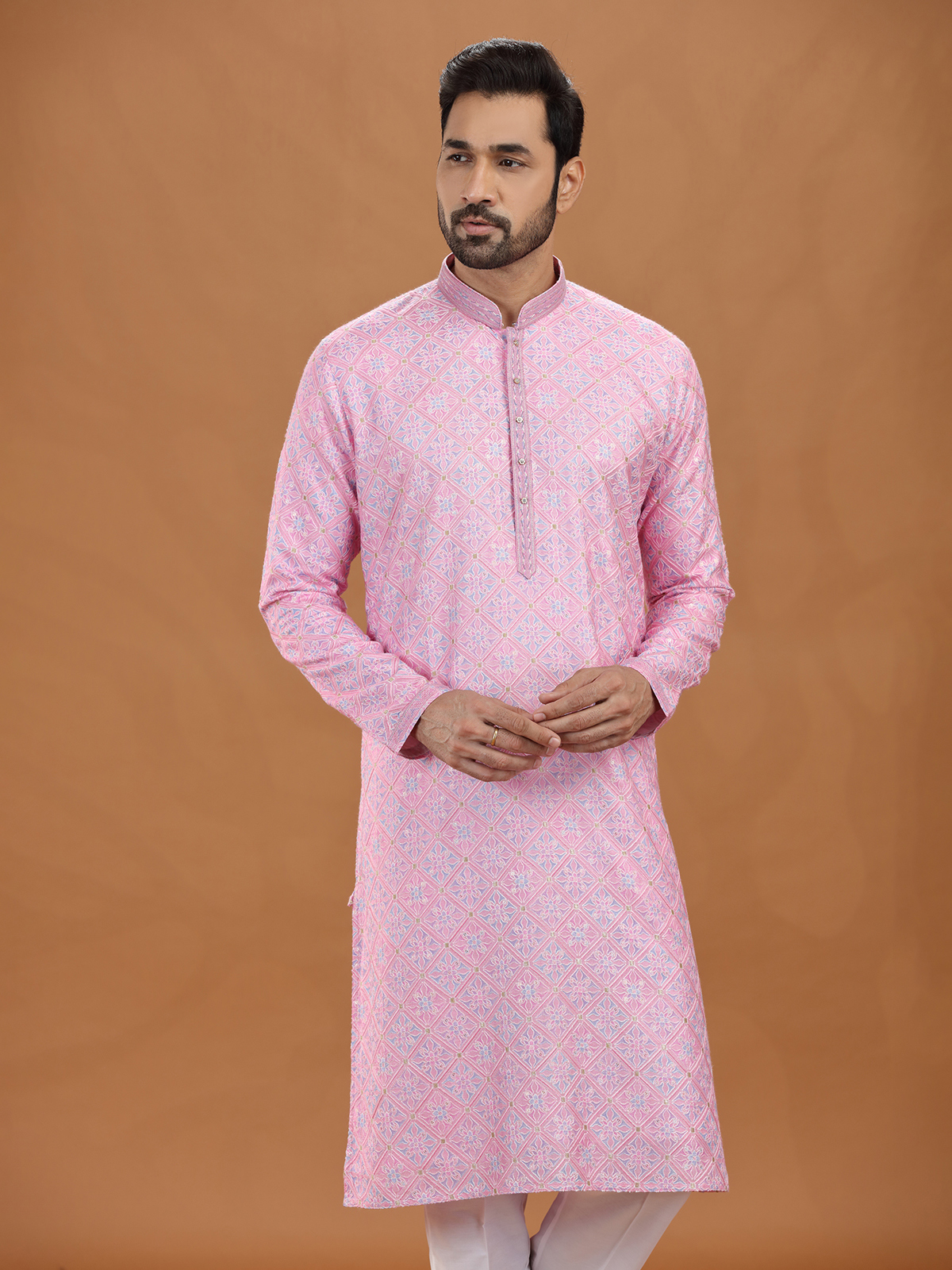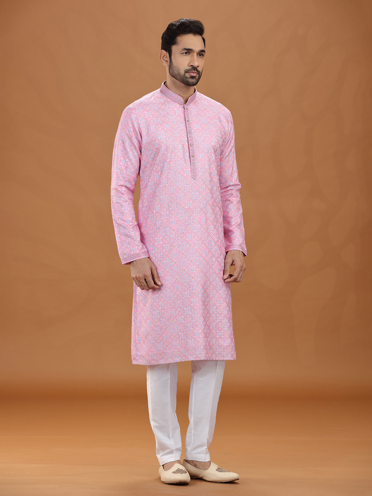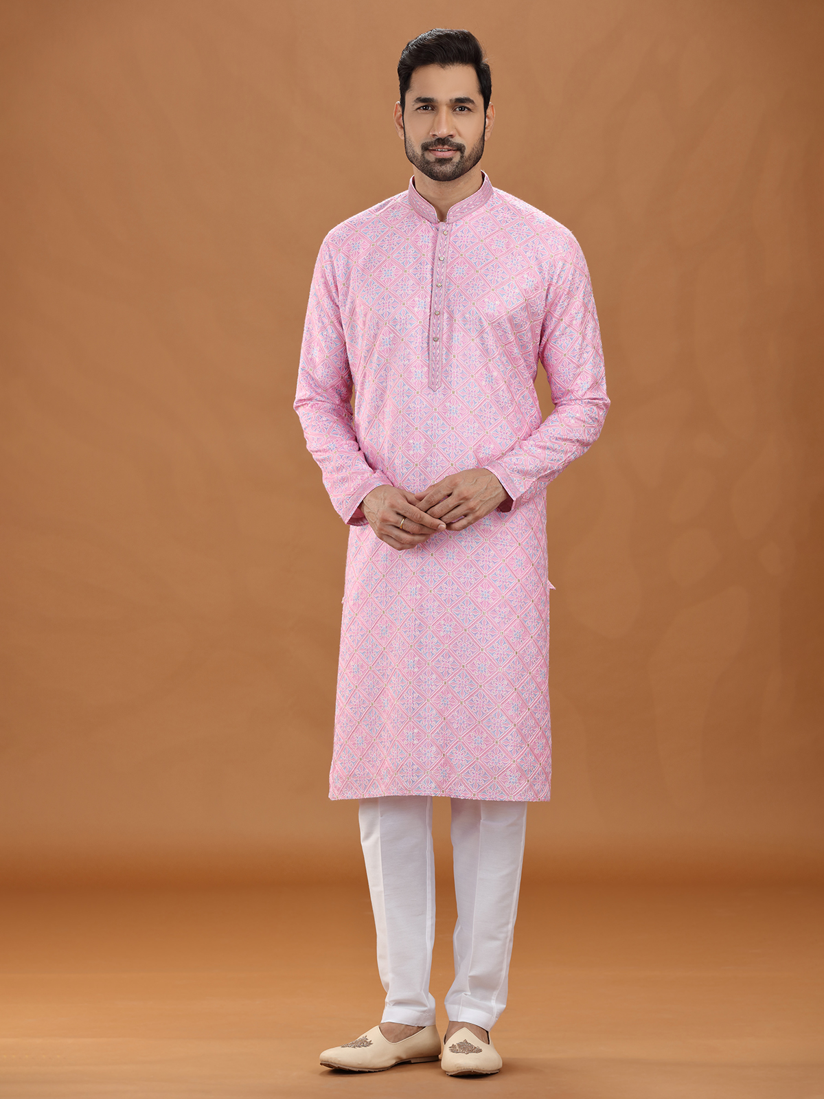 Fashioned in soft viscose, this pink kurta suit radiates grace with delicate embroidery, sequins, and thread artistry in colorful motifs. The smart stand collar and pant elevate its modern structure, offering ease and sophistication. Perfect for weddings and festive gatherings, this ensemble harmonizes timeless tradition with present-day refinement.