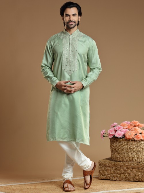 Ethnic kurta suit in cotton silk with a stunning pista green color. Adorned with intricate thread and mirror work, it features a stand collar neck, full sleeves, and a straight hemline. This set includes a bottom for a complete look.