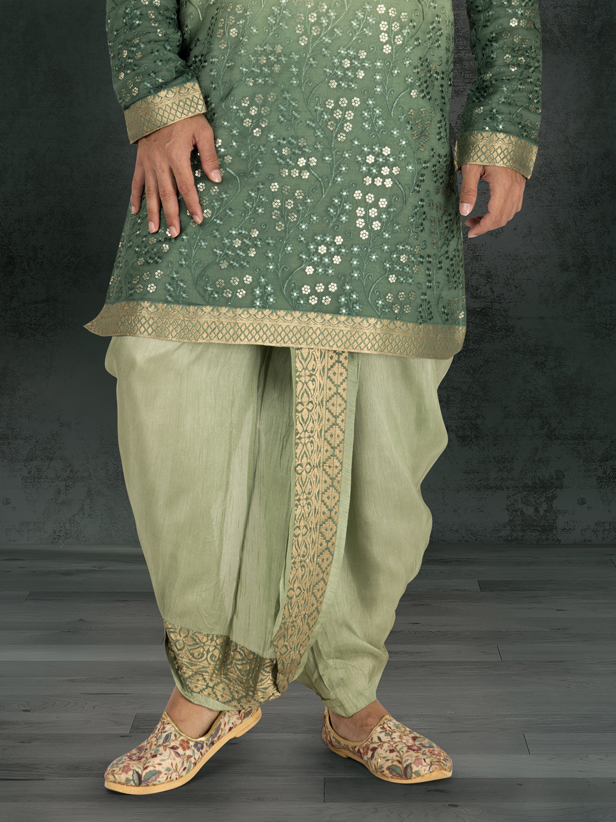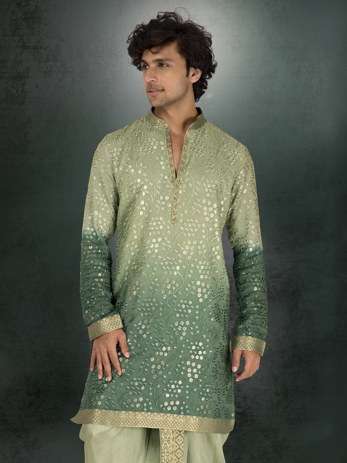 Crafted in shaded pista green georgette, this kurta features zari, sequins, and embroidery that shimmer gracefully. The mandarin collar enhances its bright charm, paired with a dhoti for a lively festive ensemble perfect for weddings or haldi functions.
