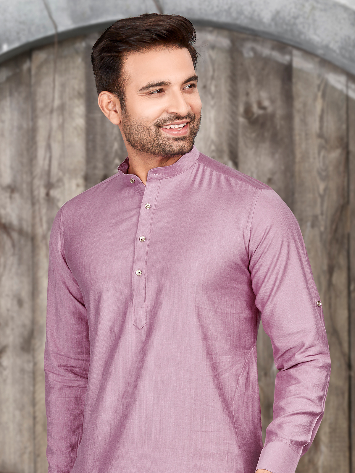 When you are dons this mauve pink silk kurta suit, you will exude a dapper charm. This plain kurta suit features a classic mandarin collar and full sleeves.