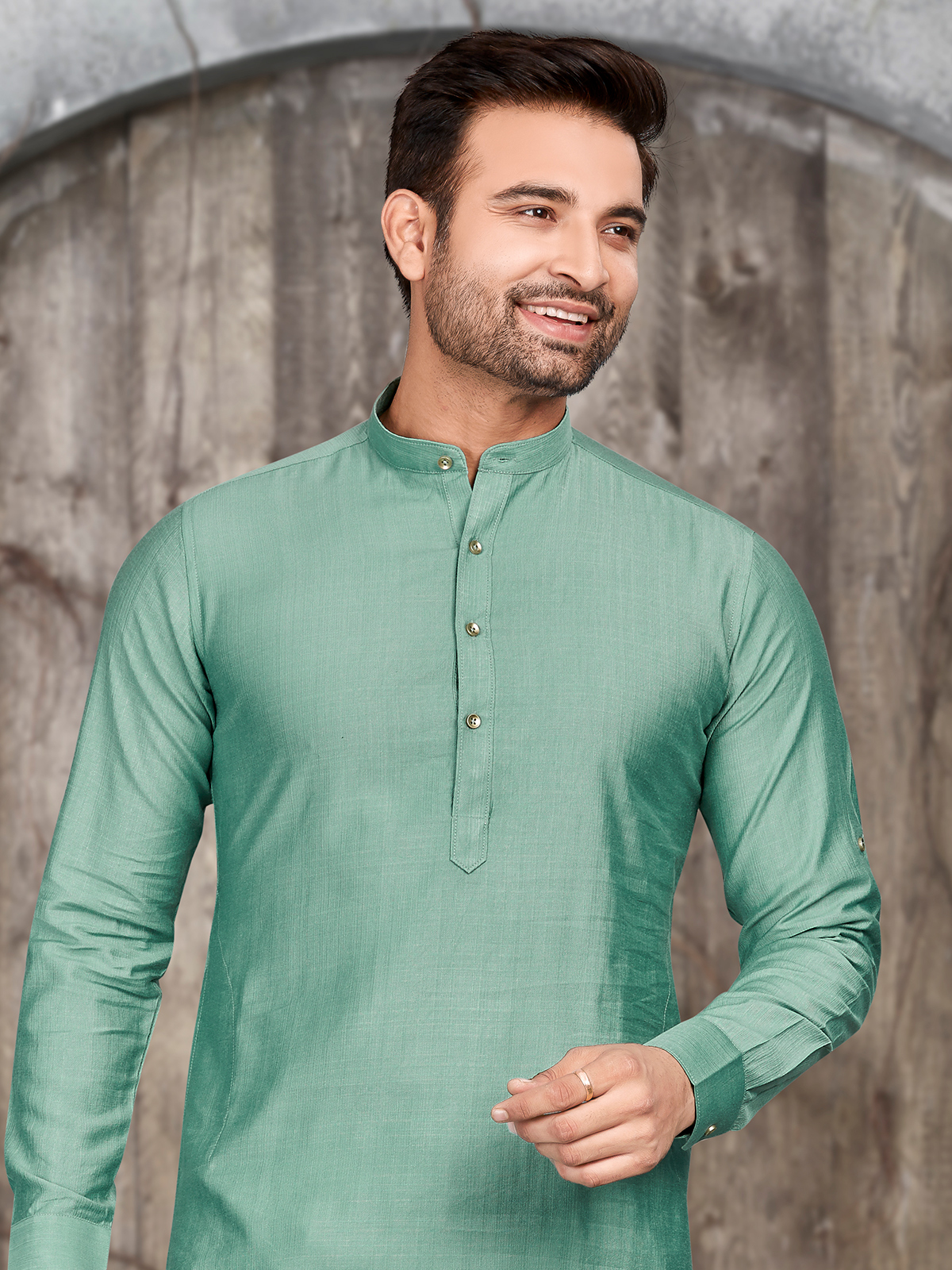 This pista green silk kurta suit showcases a plain pattern. It has a mandarin collar and full sleeves for a classy look.