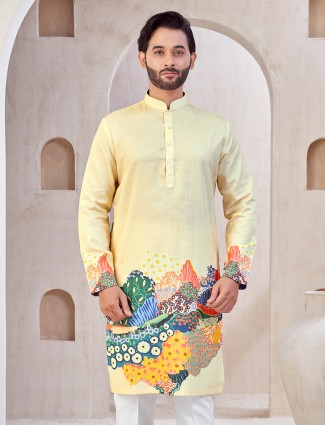 Choose effortless elegance with this beige cotton kurta set, adorned with delicate floral prints. Full sleeves and a classic mandarin collar add traditional charm, while the included bottom completes the outfit for a polished festive look.