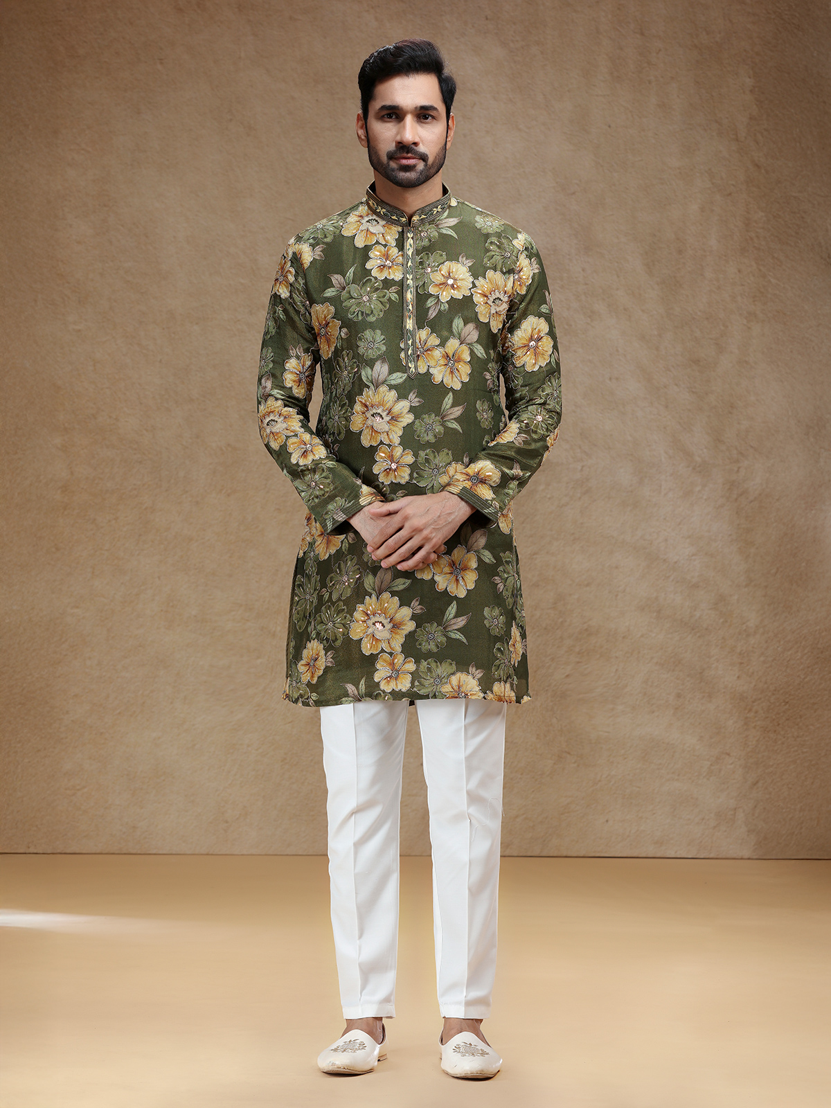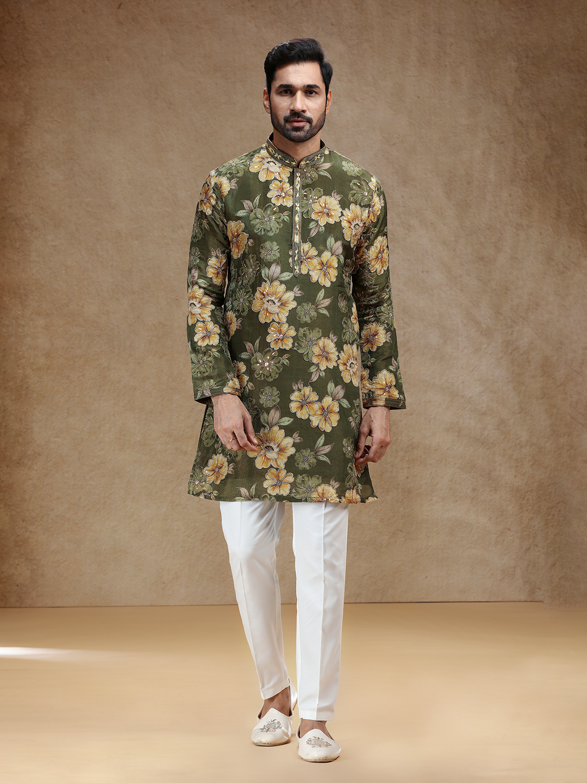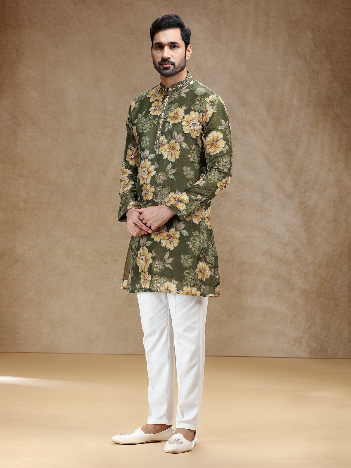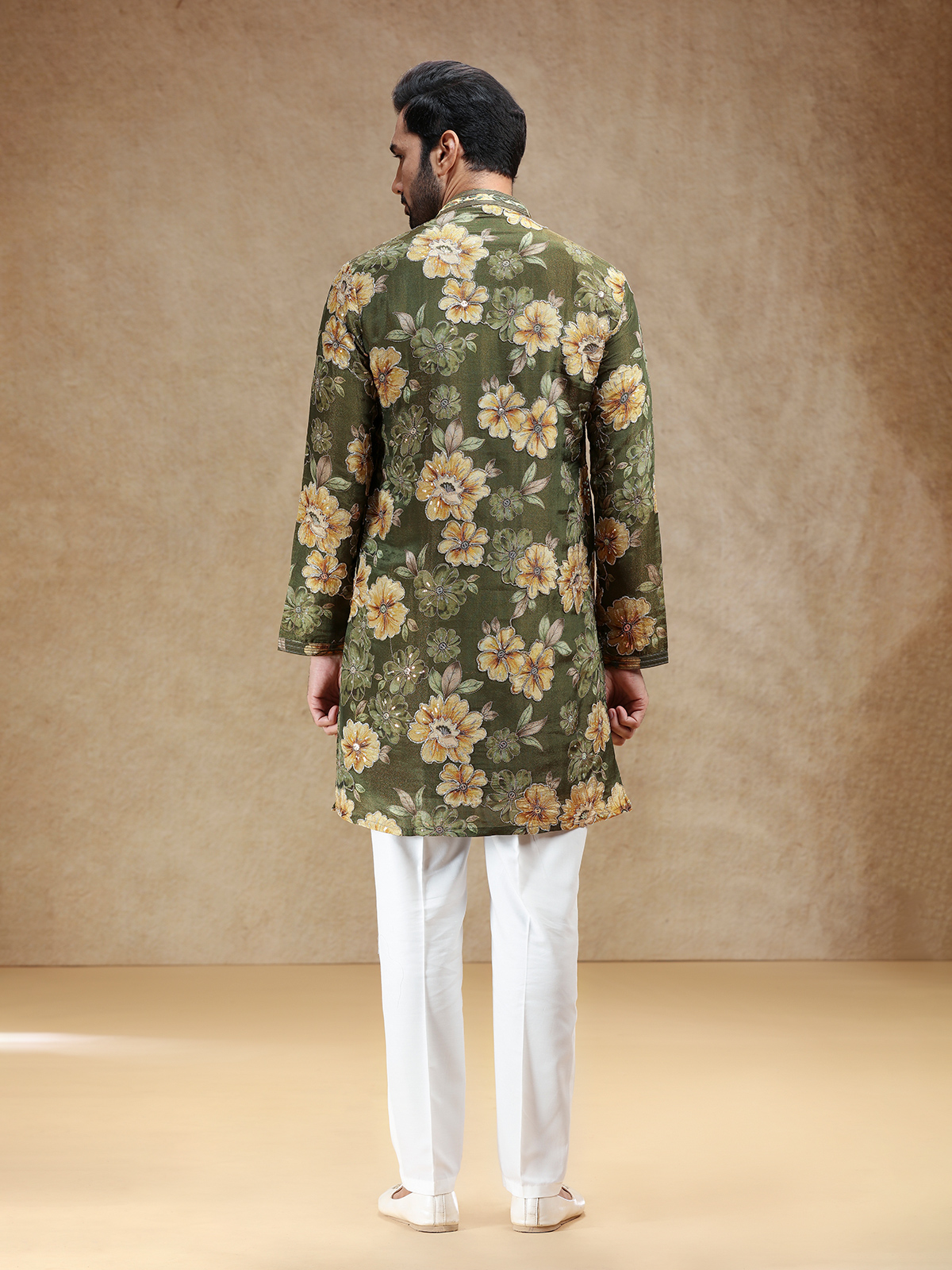 In deep mehendi green tissue silk, this kurta suit glows with resham and sequins work that reflect timeless artistry. A structured stand collar and full sleeves lend regal poise, while a flowing salwar adds traditional charm. The rich green shade exudes understated sophistication, making it perfect for cultural festivities that celebrate elegance, heritage, and graceful comfort.
