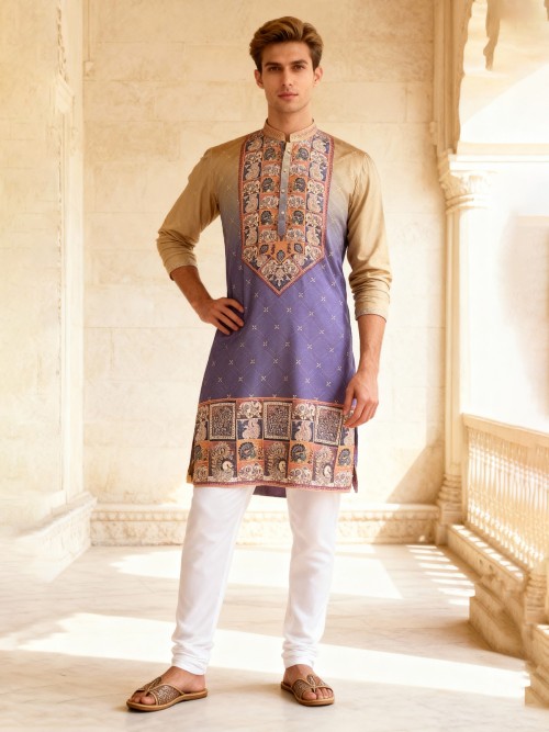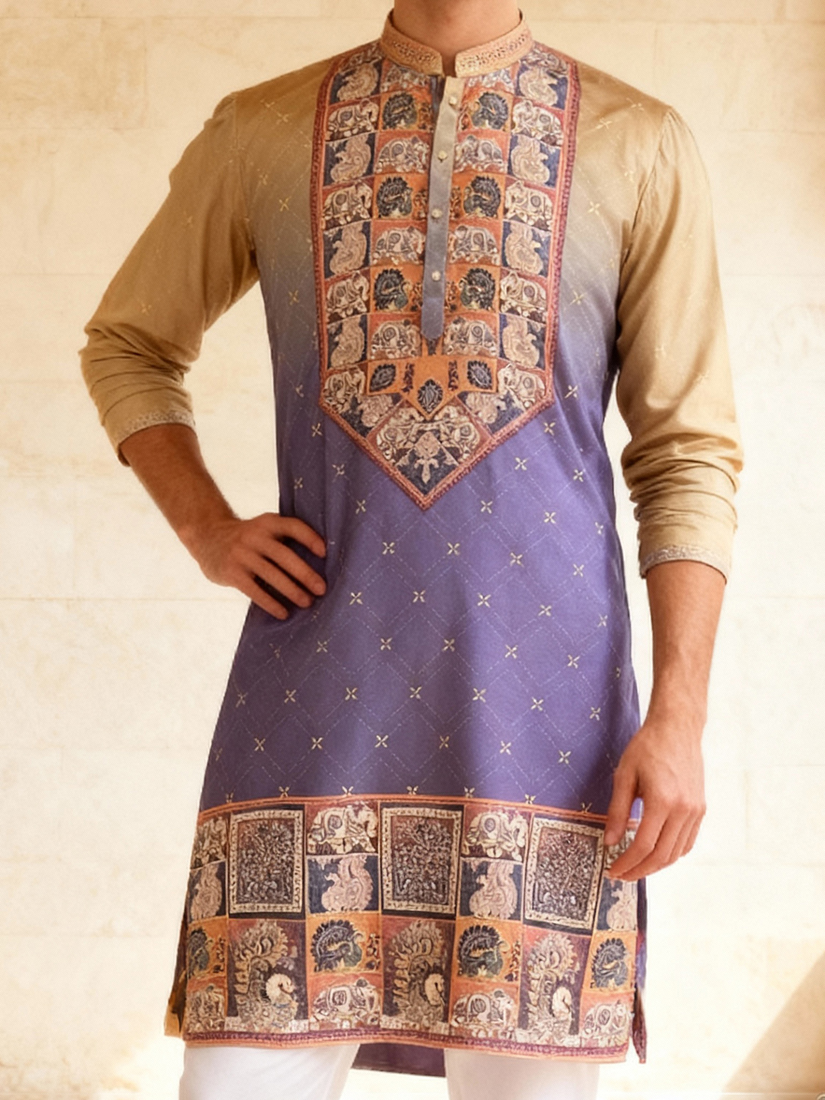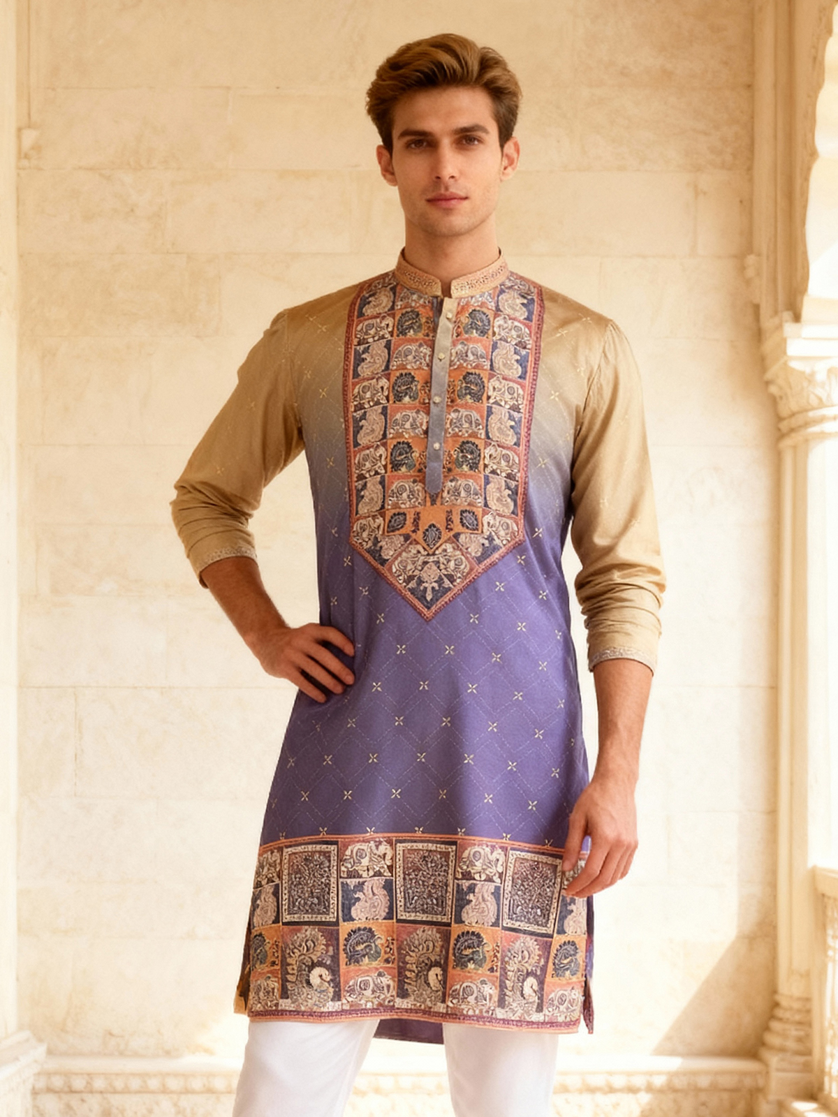 Artful and appealing, this shaded purple and beige cotton silk kurta displays daman prints for a classic look. The Chinese collar and full sleeves, paired with pants, make it ideal for festive celebrations.