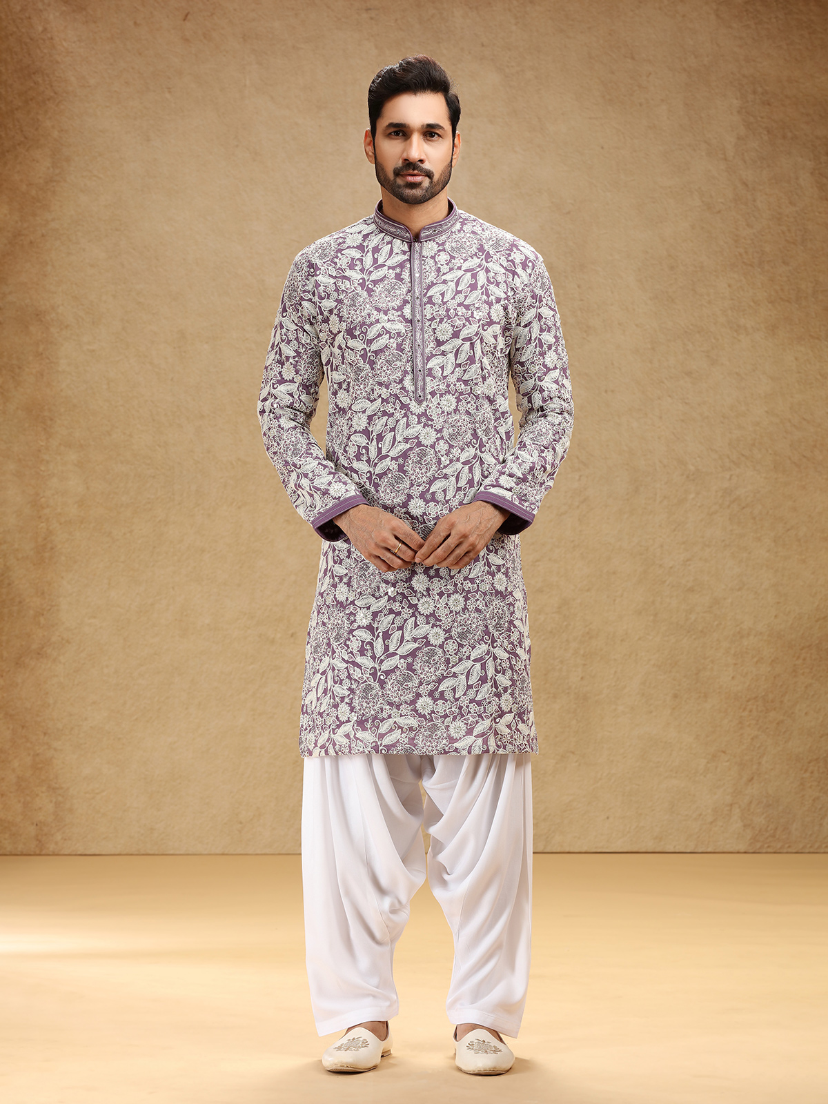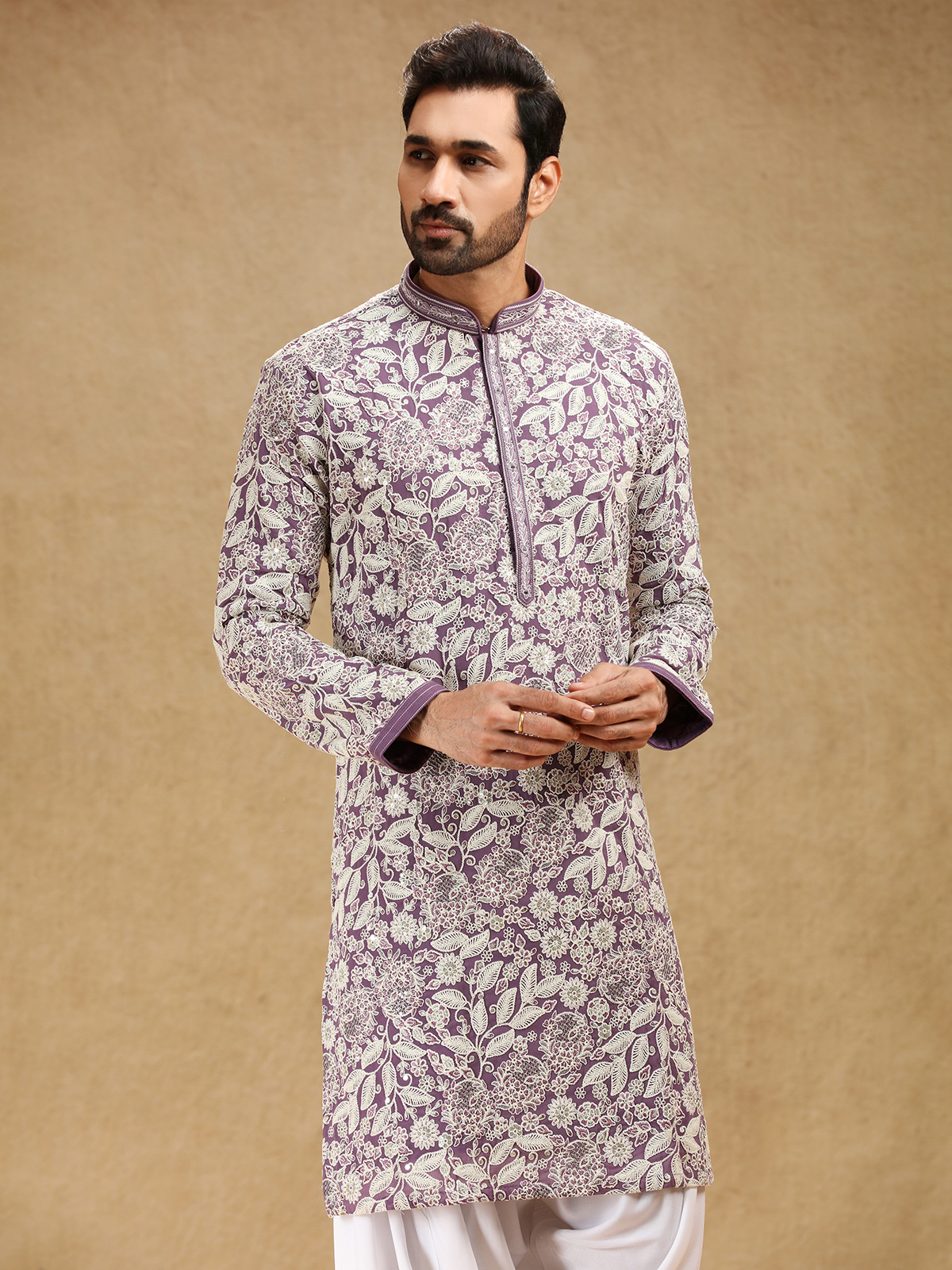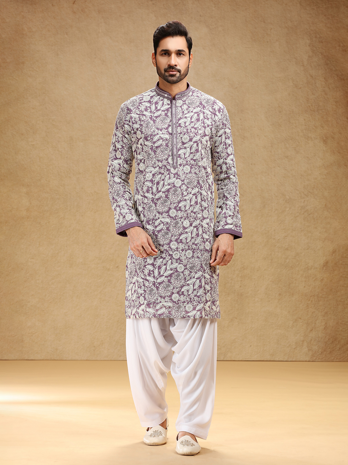 Wrapped in royal purple georgette, this kurta suit enchants with sequins and embroidery that lend it festive sparkle. A stand collar and full sleeves shape its refined silhouette, complemented by a graceful salwar for traditional appeal. The deep purple hue radiates confidence and charm, making it a captivating ensemble for cultural festivities and joyous family celebrations.