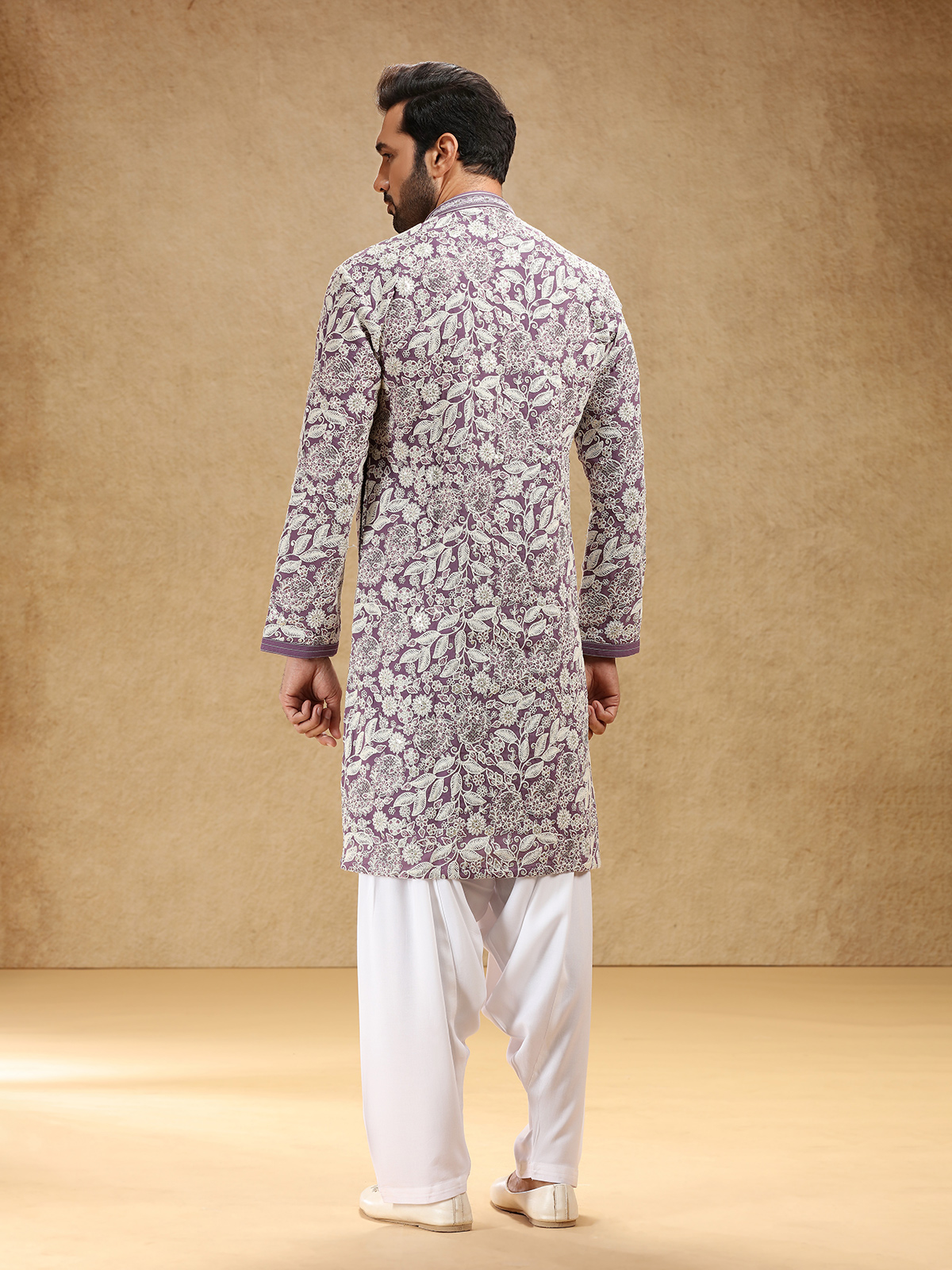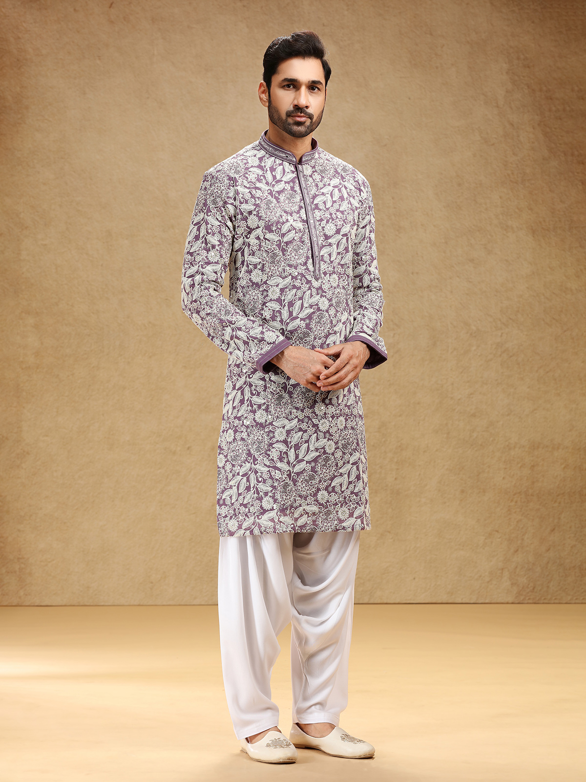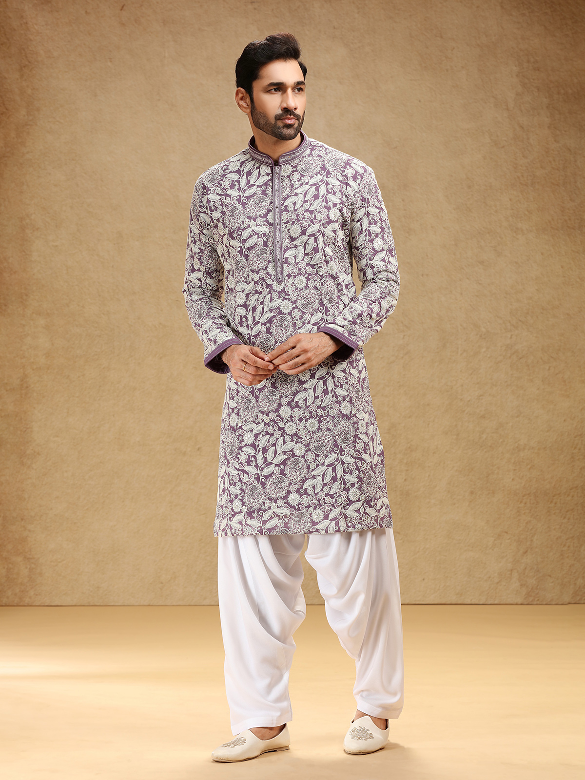 Wrapped in royal purple georgette, this kurta suit enchants with sequins and embroidery that lend it festive sparkle. A stand collar and full sleeves shape its refined silhouette, complemented by a graceful salwar for traditional appeal. The deep purple hue radiates confidence and charm, making it a captivating ensemble for cultural festivities and joyous family celebrations.