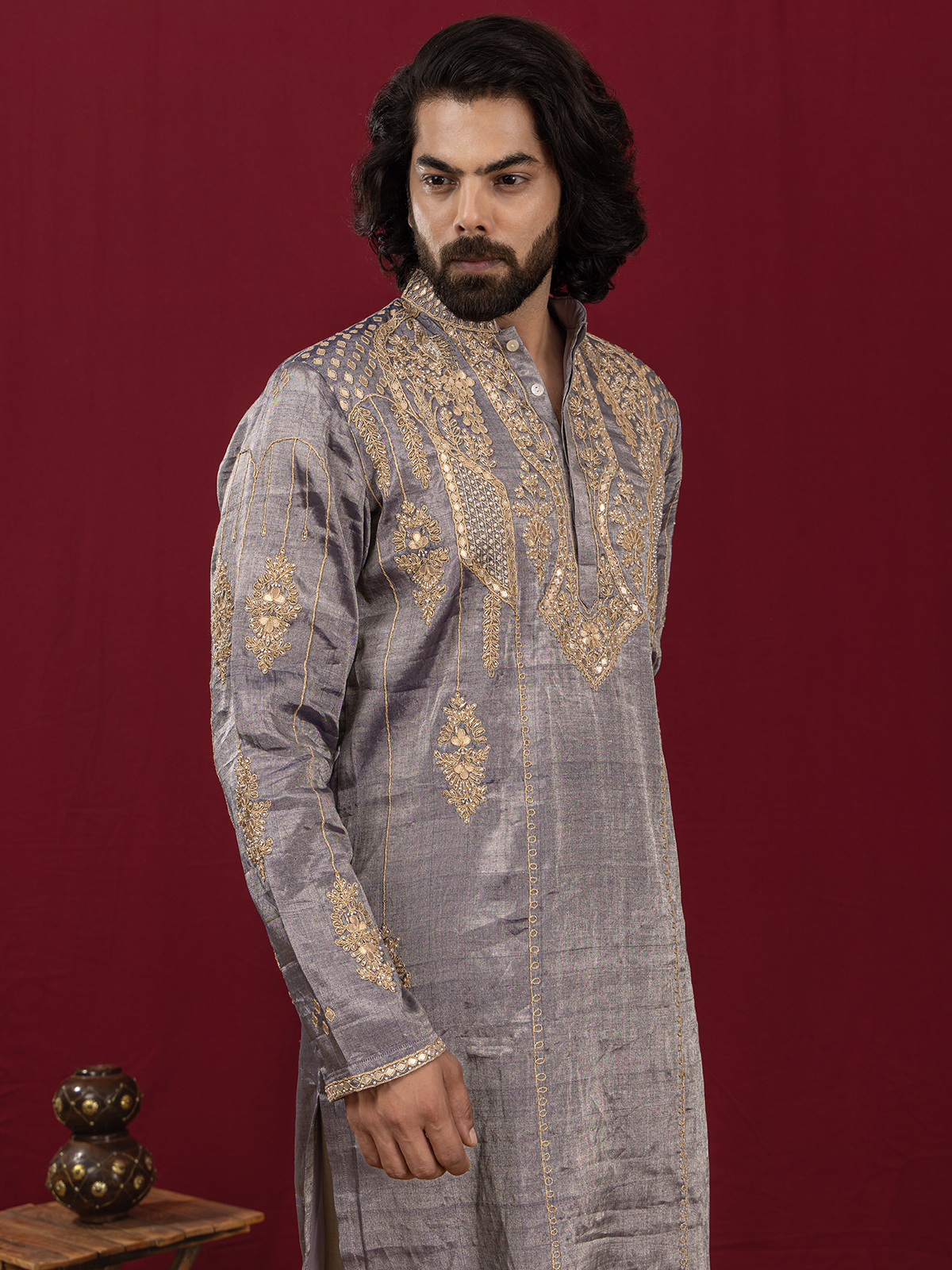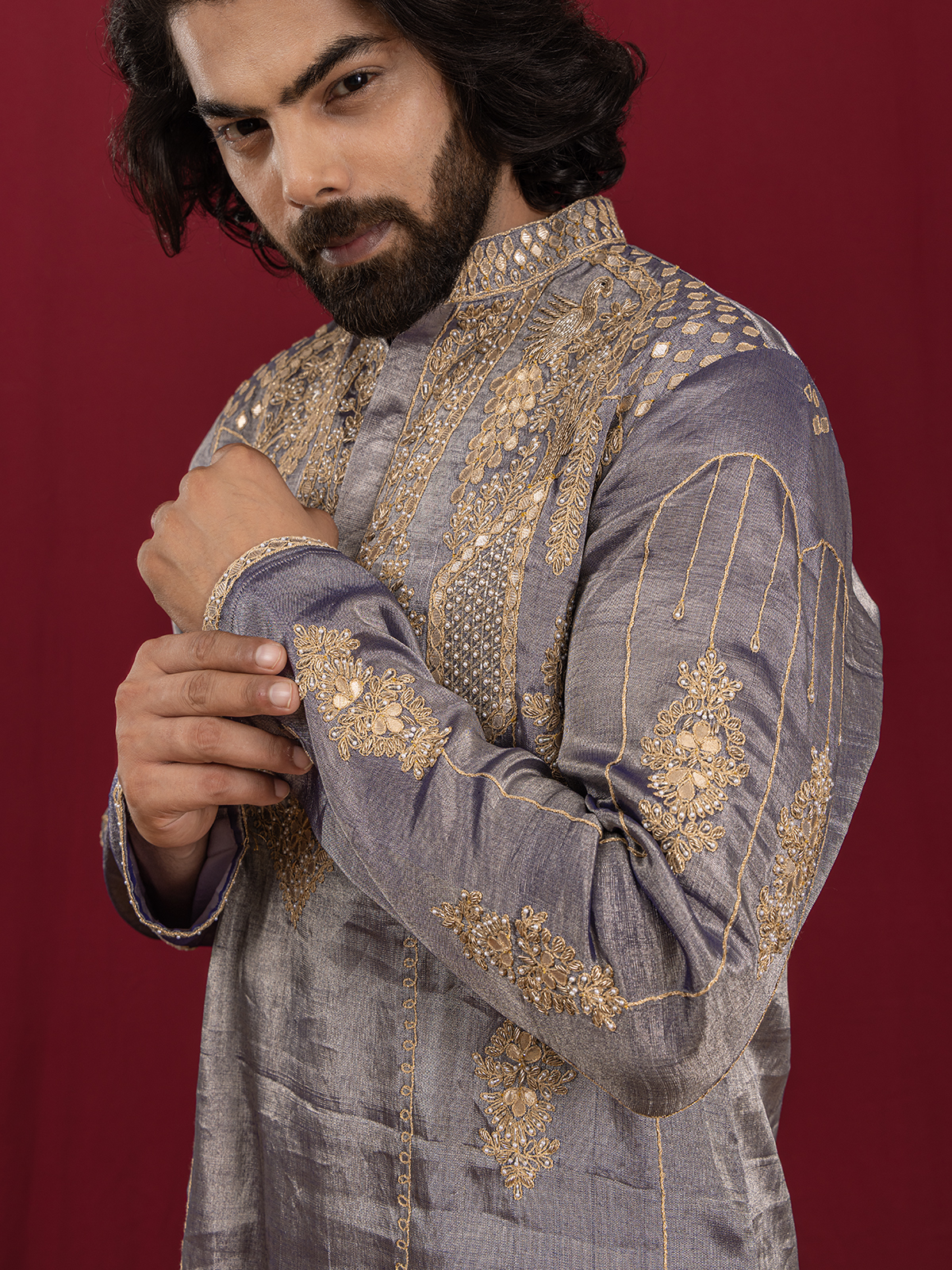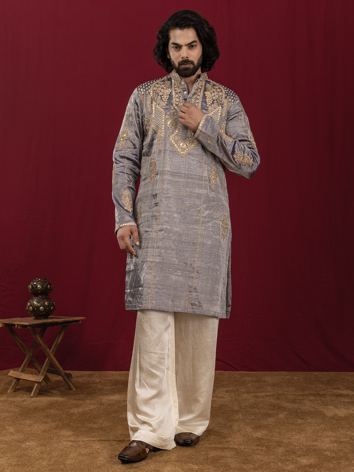 Crafted in regal purple silk, this kurta gleams with intricate cutdana, thread, gota, beads, and zardosi artistry. The chinese collar and full sleeves add a note of stately sophistication. Teamed with a pant, it unfolds a tale of rich festive splendour.