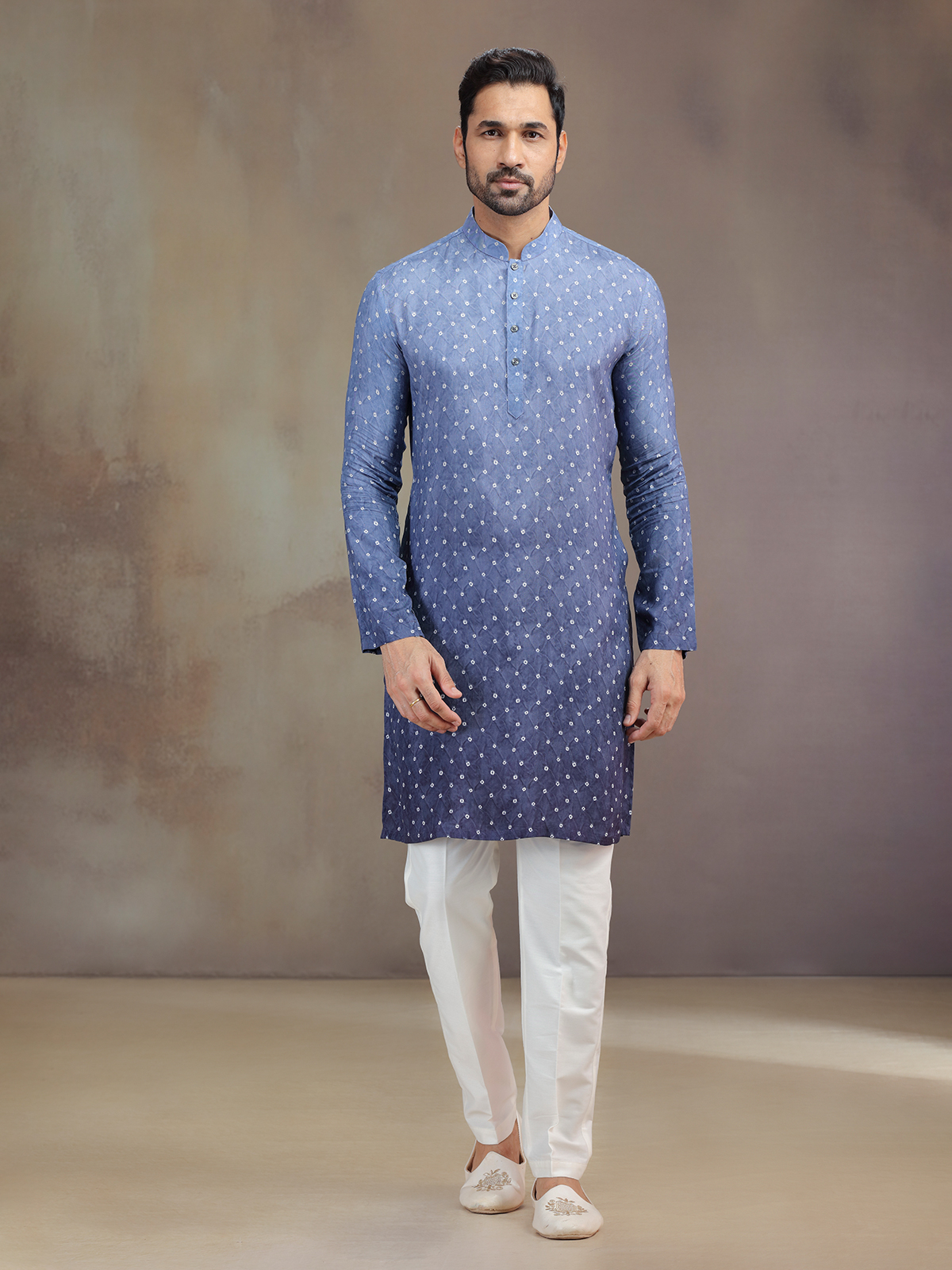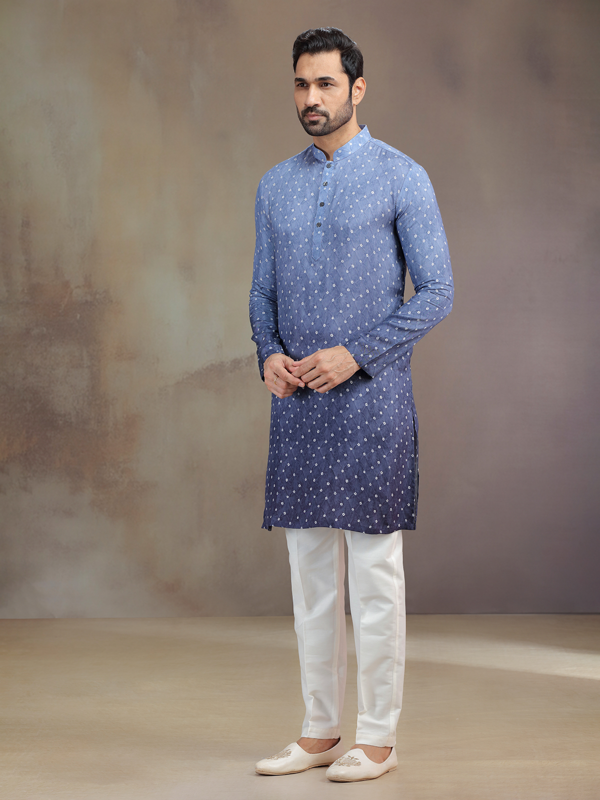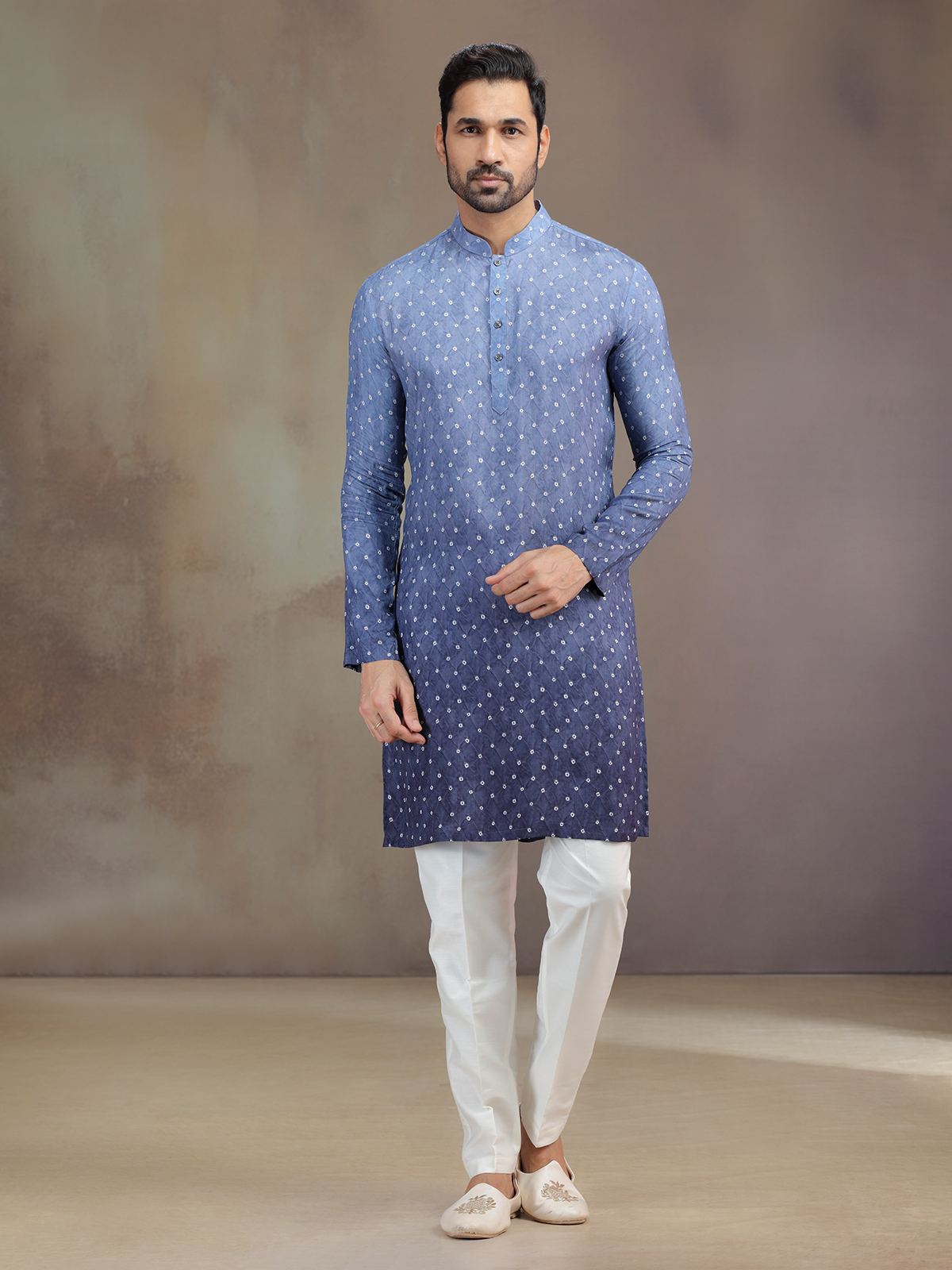 Rich tones define this purple silk printed kurta pajama, exuding festive radiance. The intricate work enhances the mandarin collar and full sleeves, balancing tradition with charm. Paired with pants, it creates a vibrant attire suited for joyous cultural occasions.