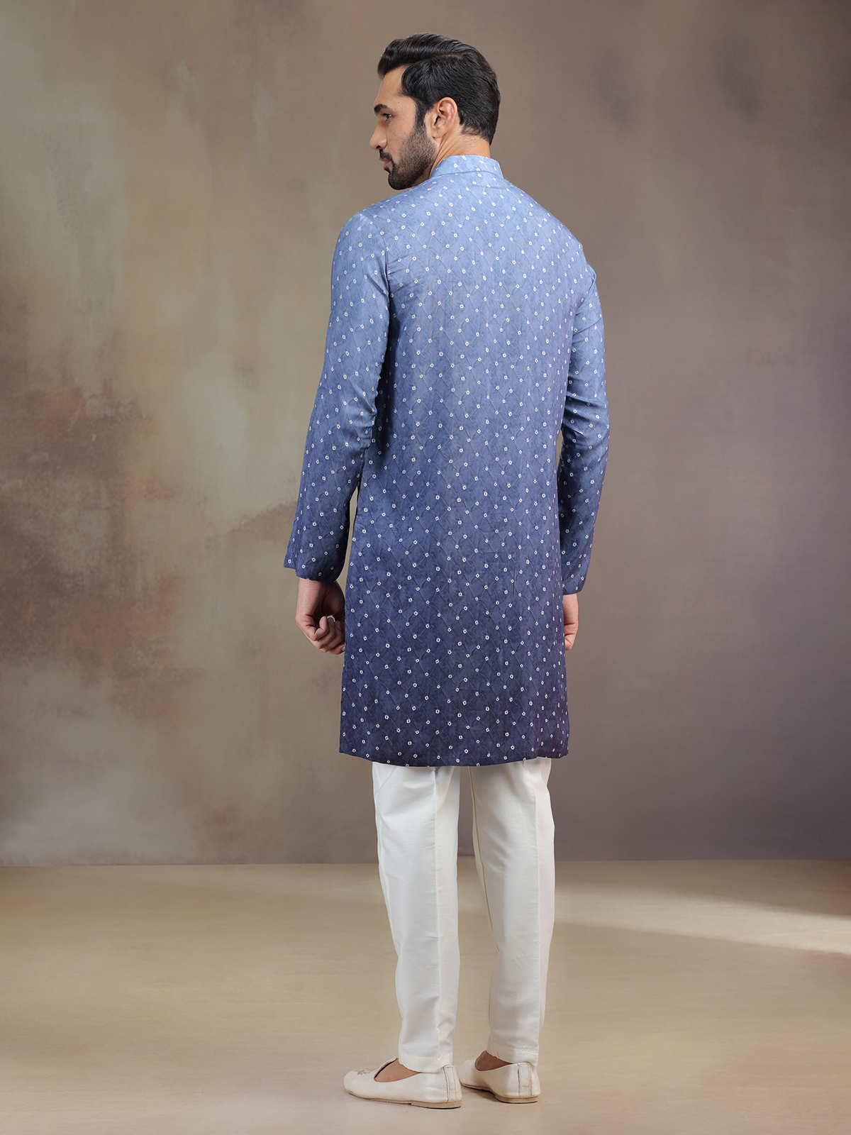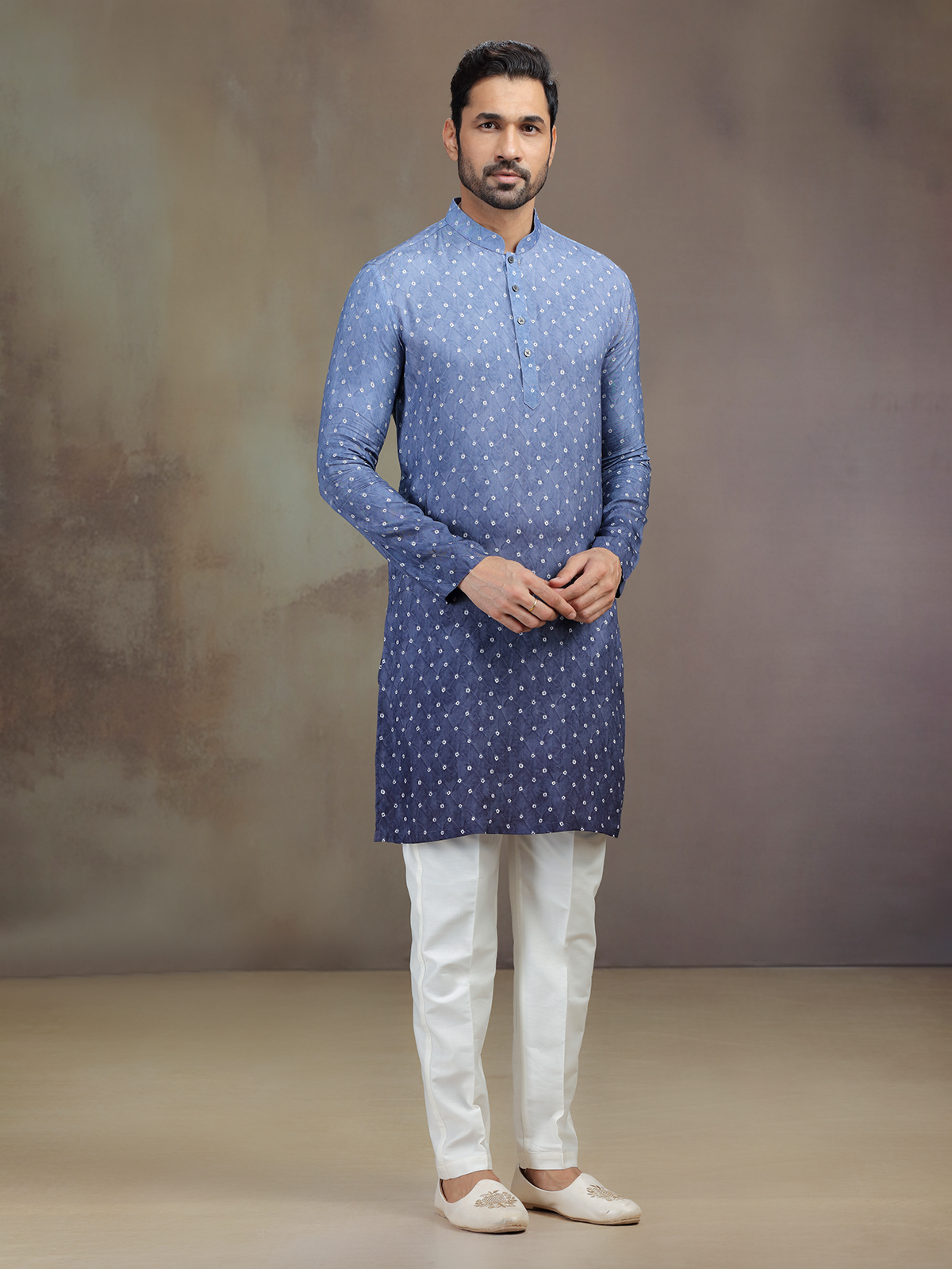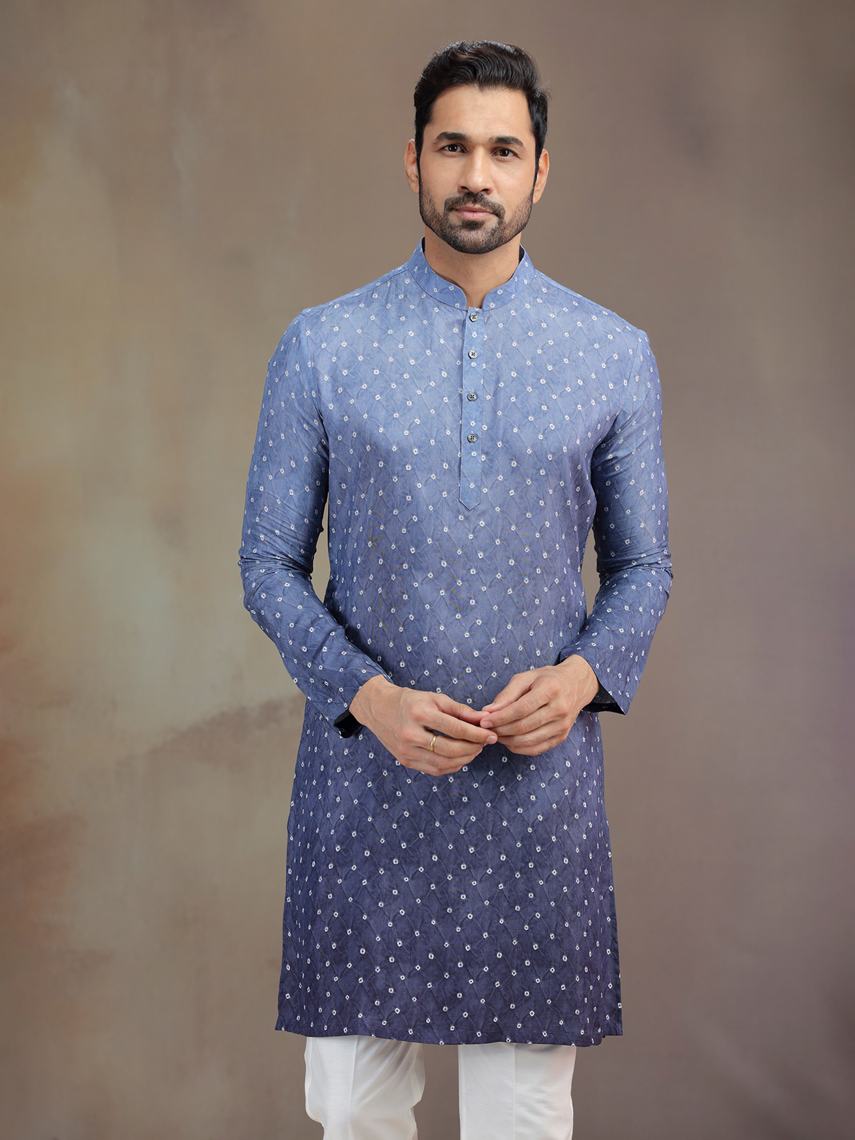 Rich tones define this purple silk printed kurta pajama, exuding festive radiance. The intricate work enhances the mandarin collar and full sleeves, balancing tradition with charm. Paired with pants, it creates a vibrant attire suited for joyous cultural occasions.