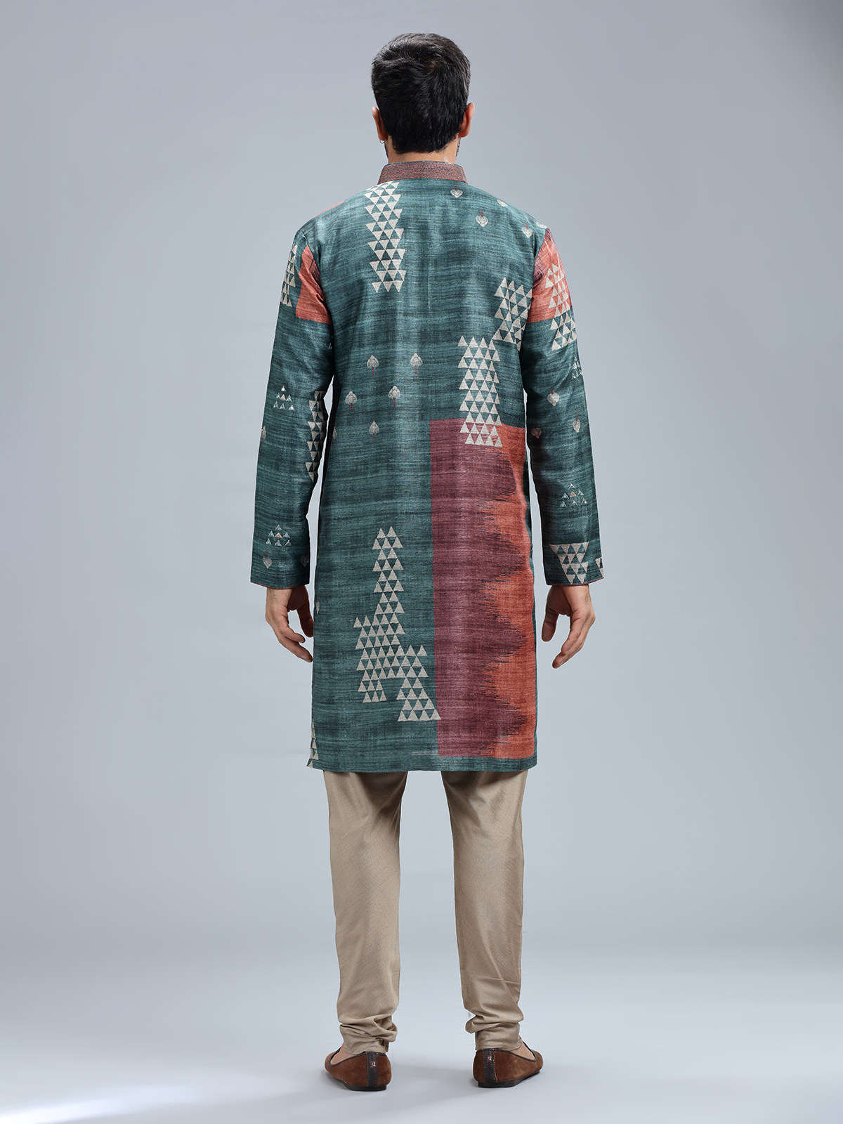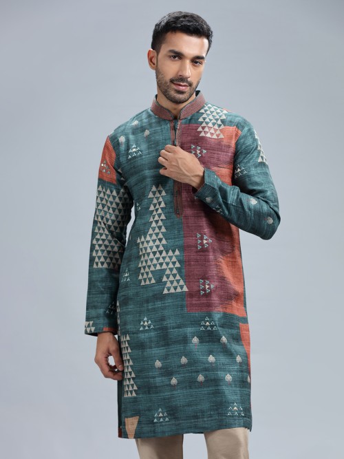 Rama Blue Cotton Silk Festive Printed Kurta Suit For Men