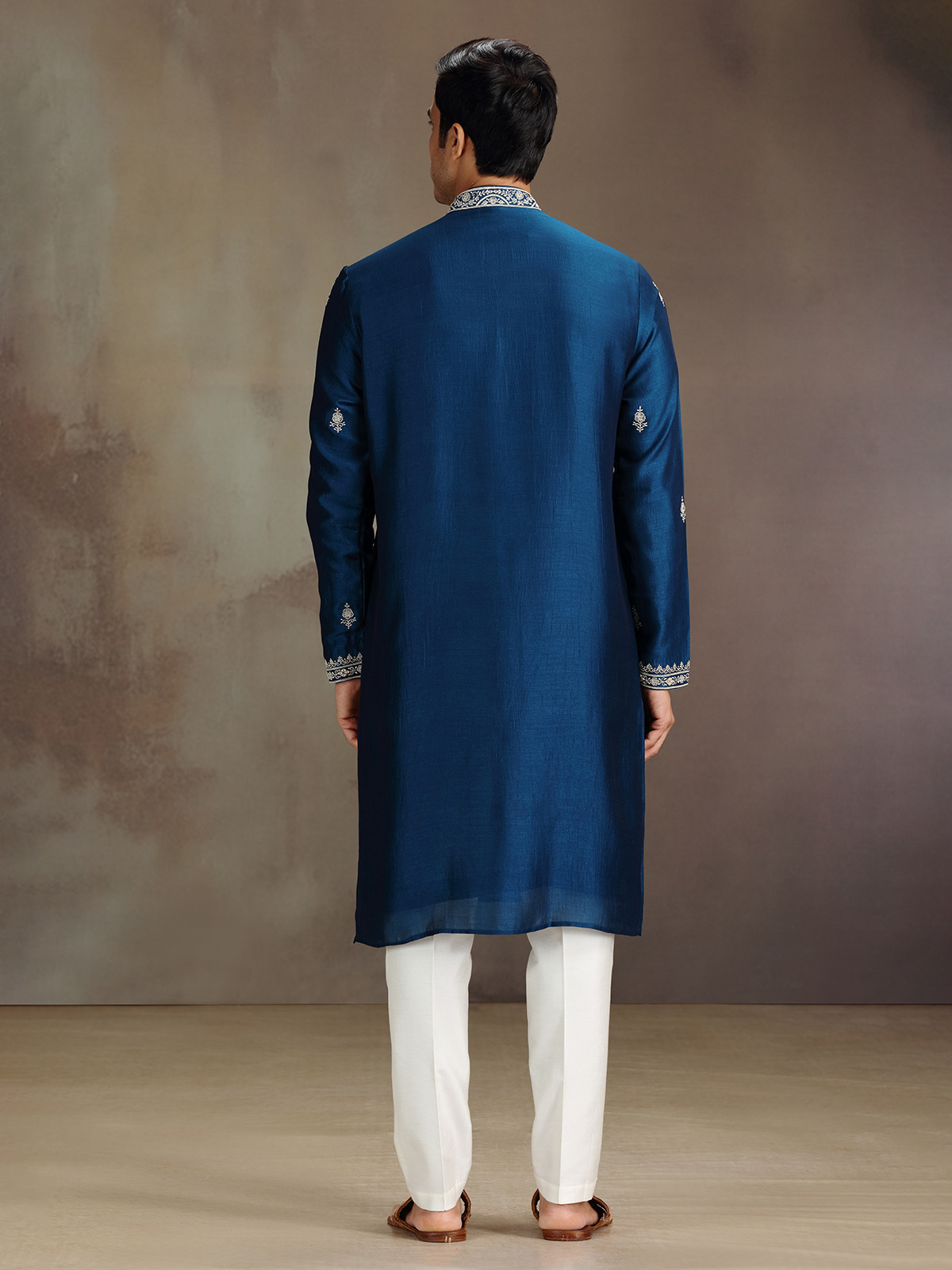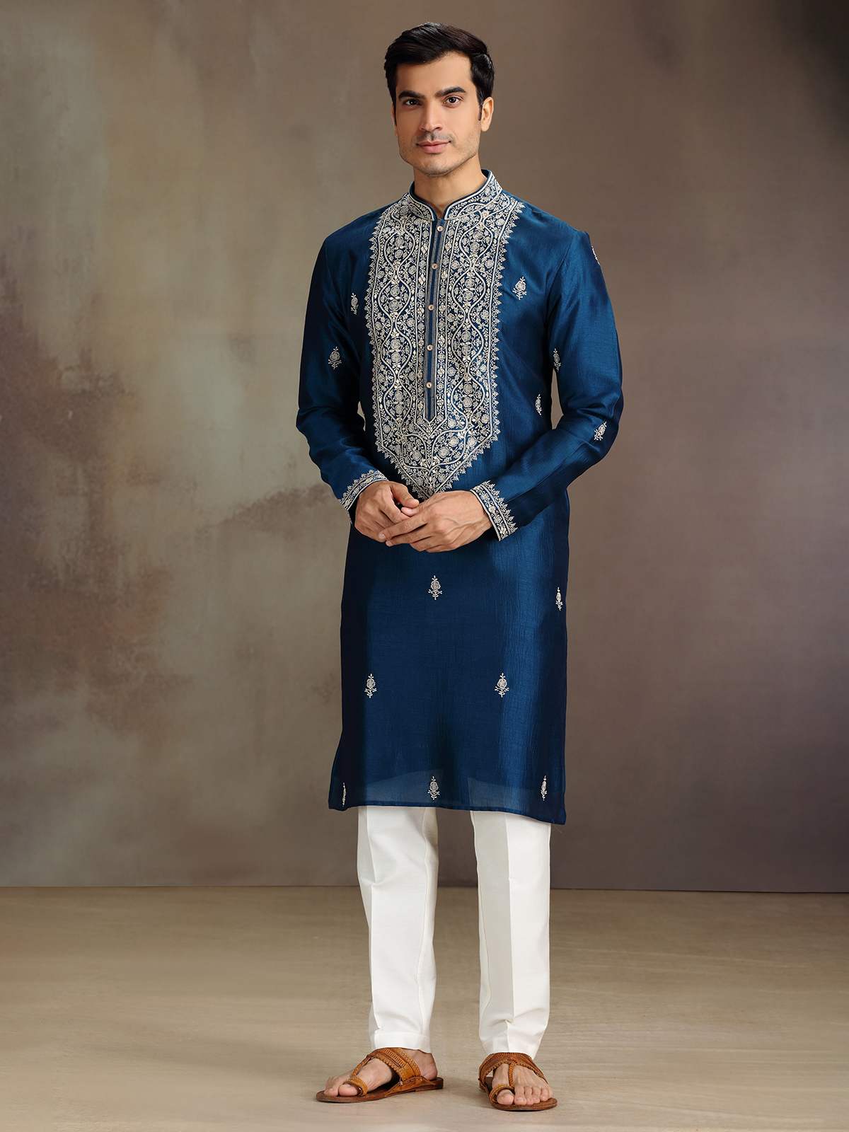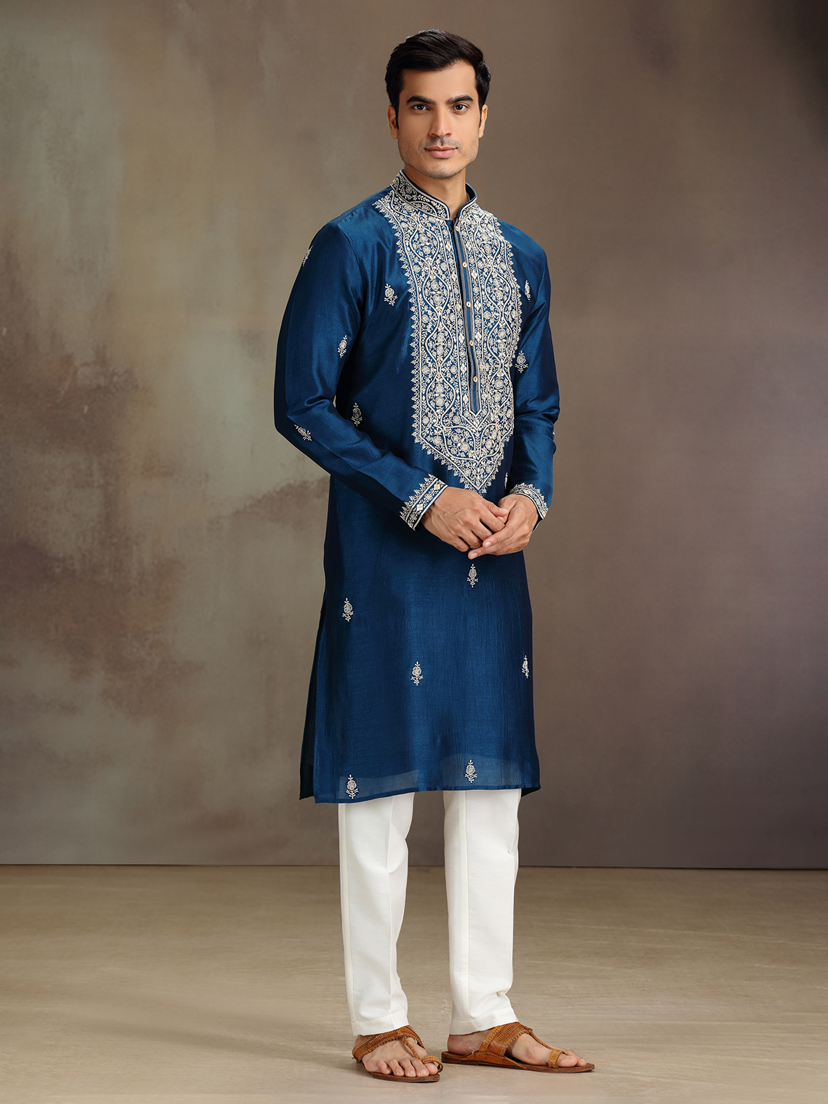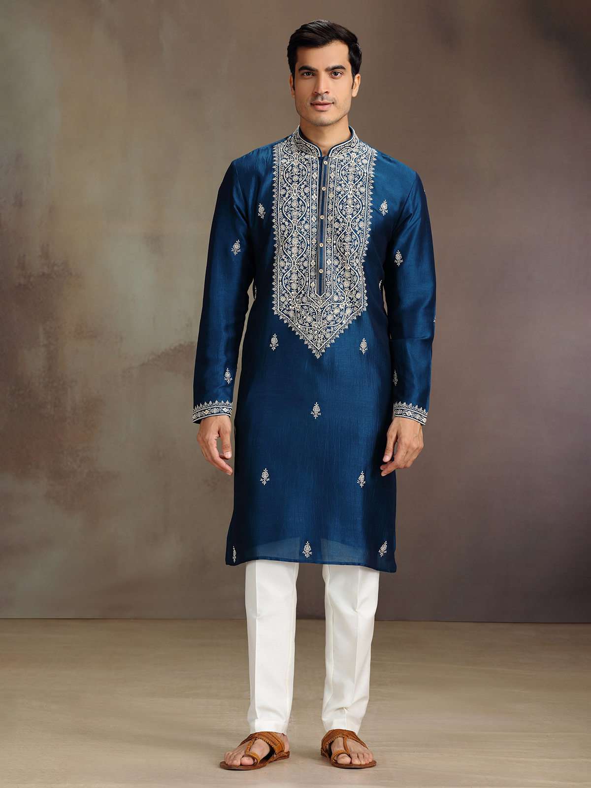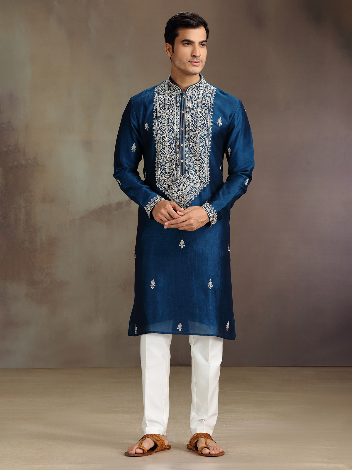 Glistening in rama blue silk, this kurta set enchants with embroidery, aabla, and stone detailing. The Chinese collar lends grace, while the matching pants make it perfect for weddings, receptions, and festive occasions.