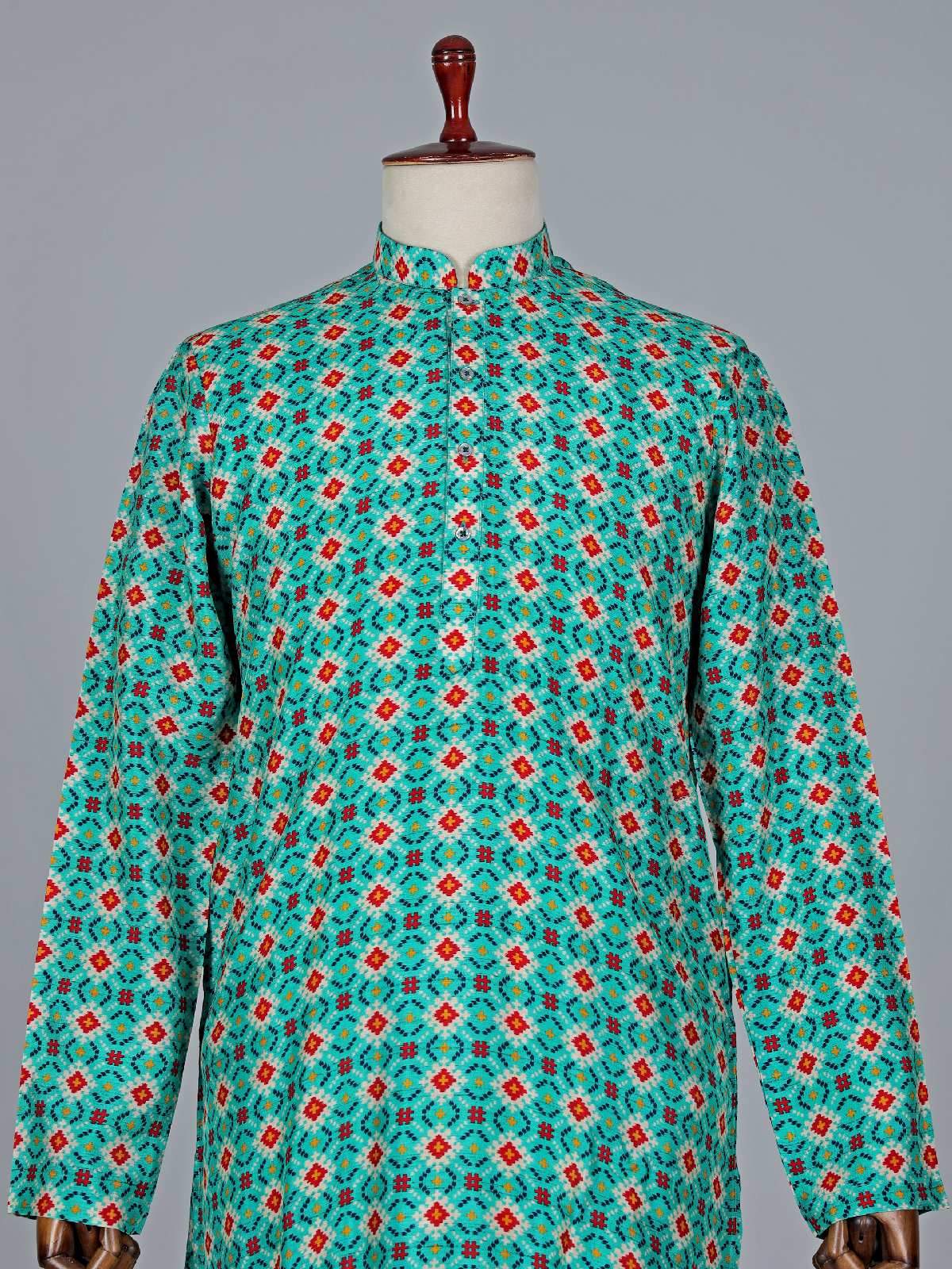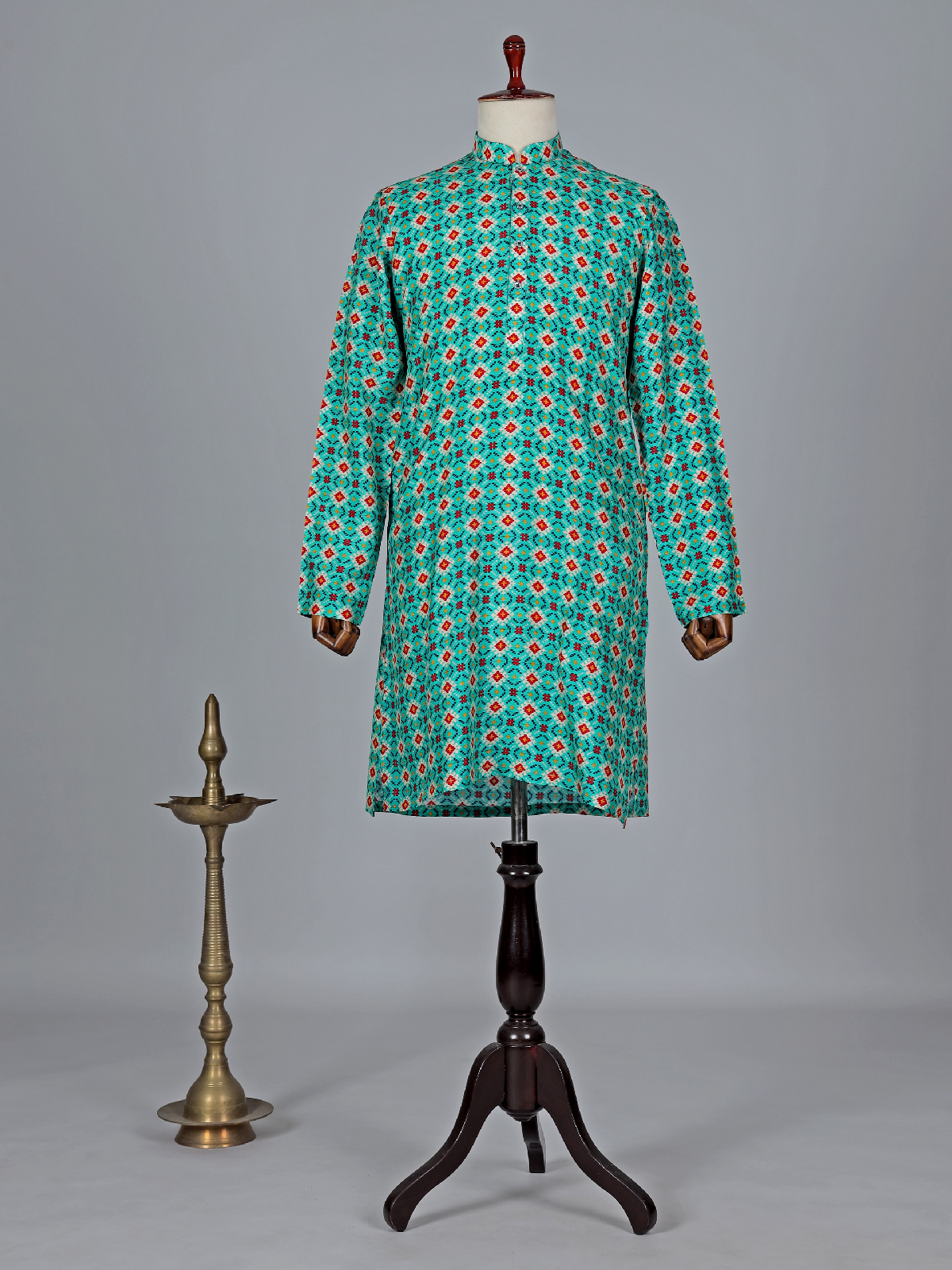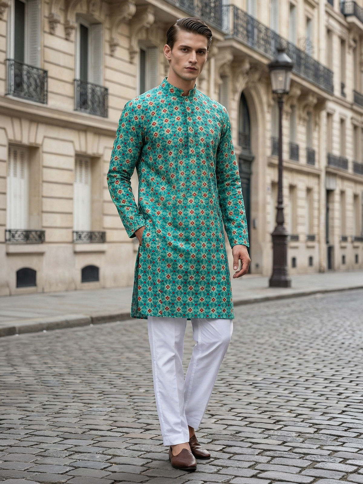 Buy this sophisticated cotton rama green kurta suit to make your festival full of comfort. Its white print pattern gives it a more classic look. Get a stunning look with its mandarin collar and full sleeves. Paired with white bottom.