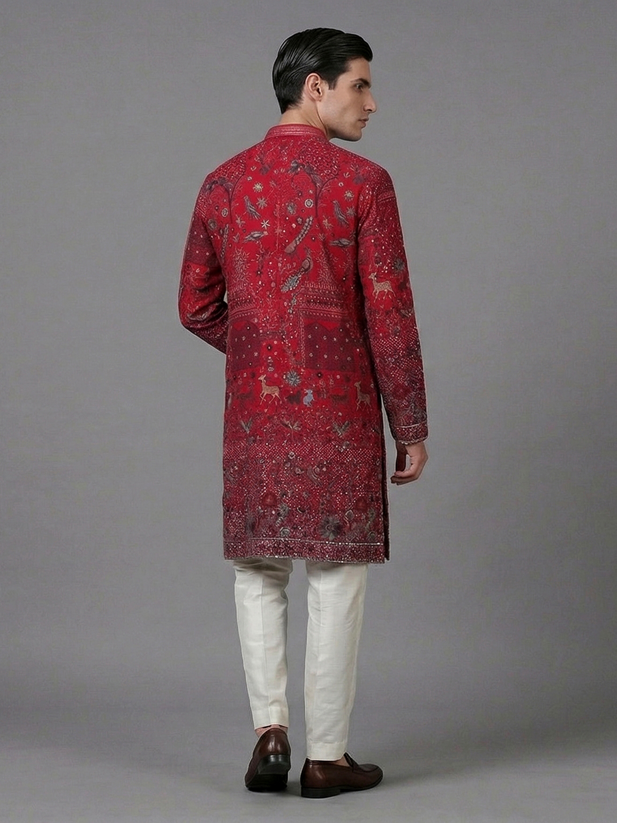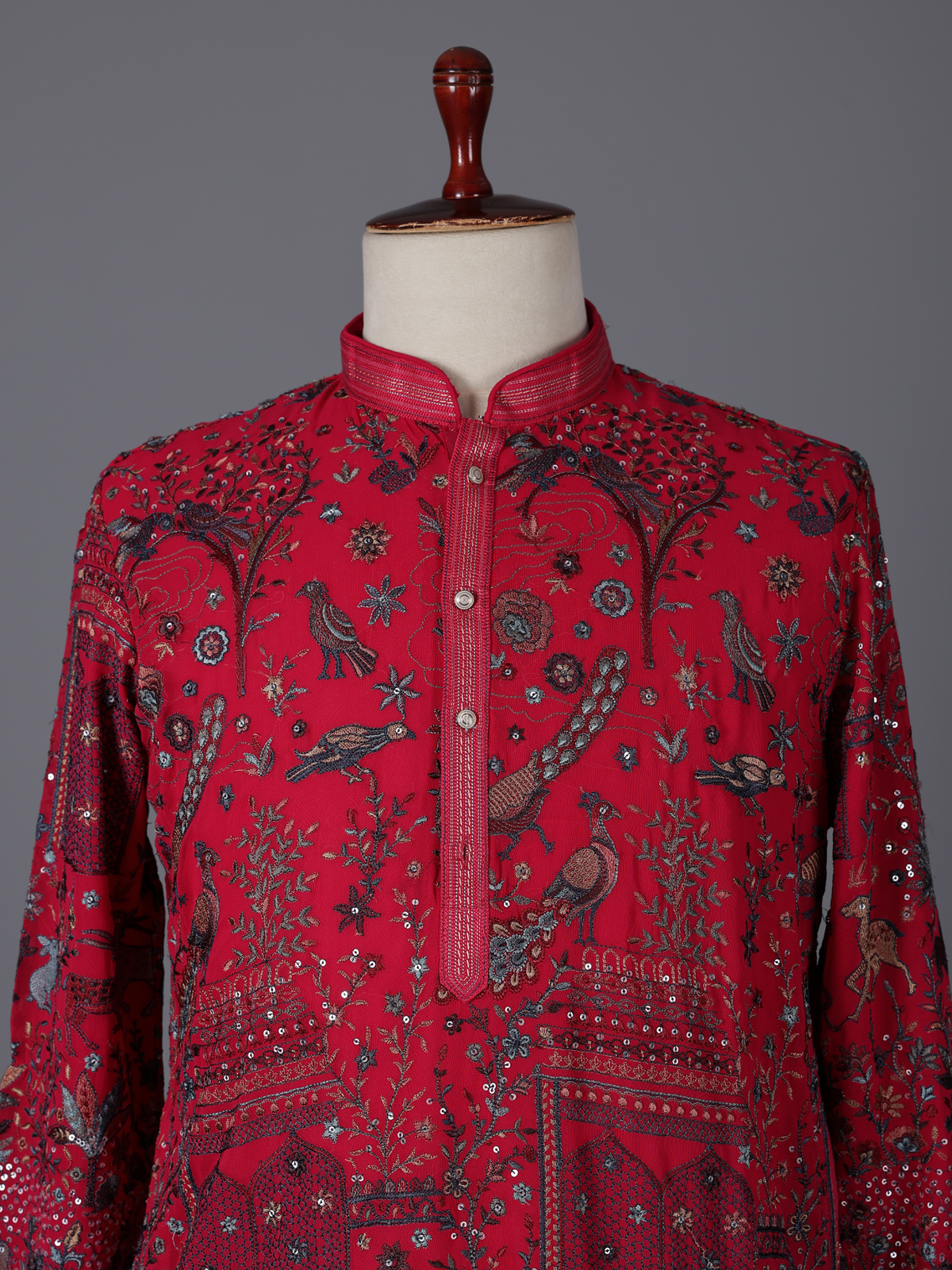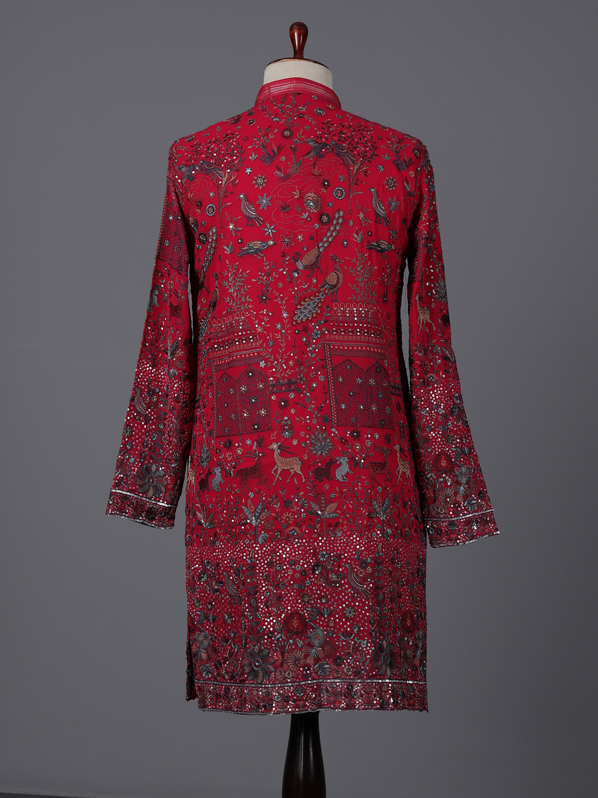 Bright and captivating, this rani pink georgette kurta set is enhanced with embroidery and sequins detailing. The mandarin collar adds structure, while the lightweight fabric ensures comfort and style. Ideal for weddings and sangeet nights, it comes with a matching pant for a complete festive look.
