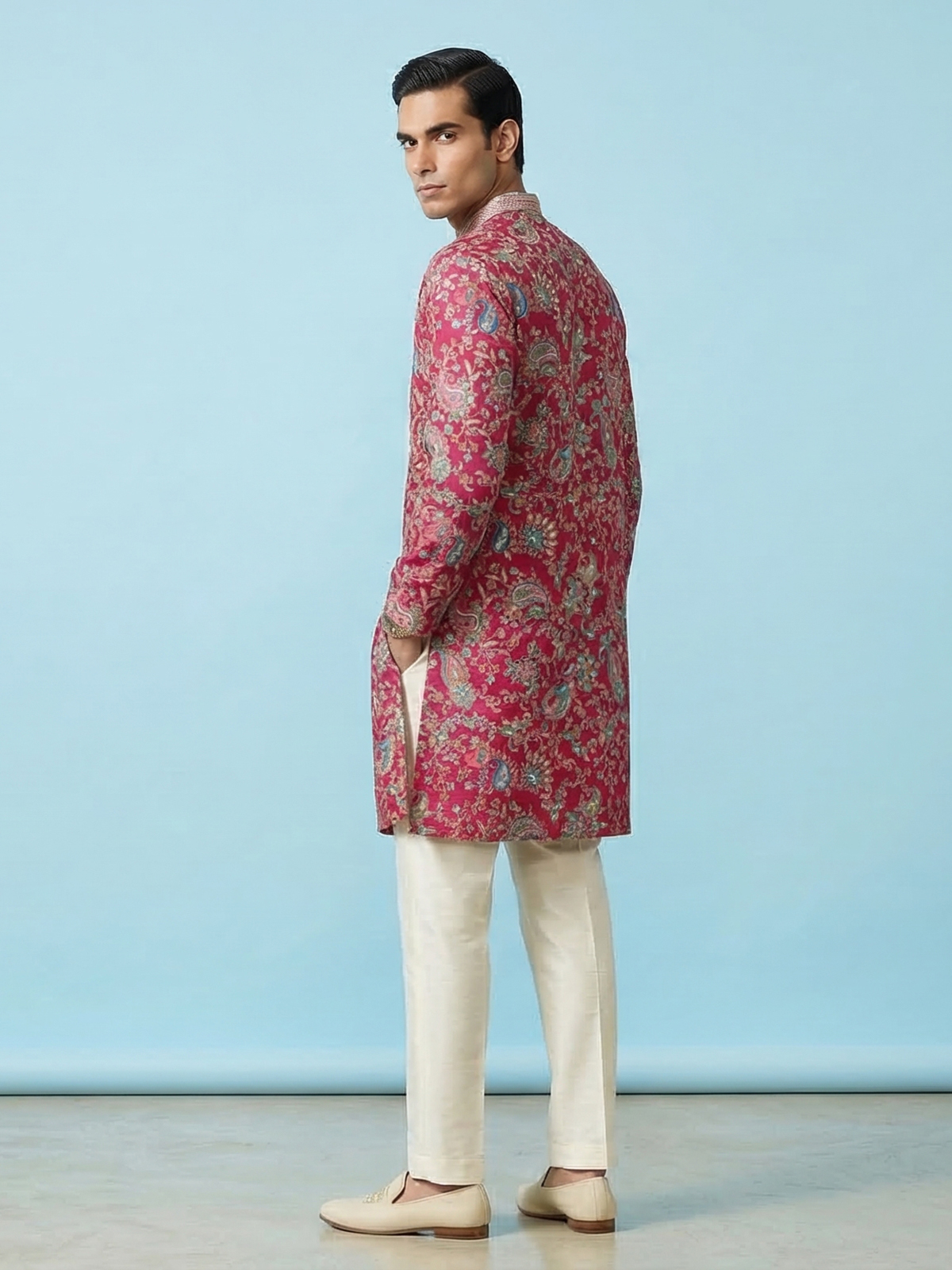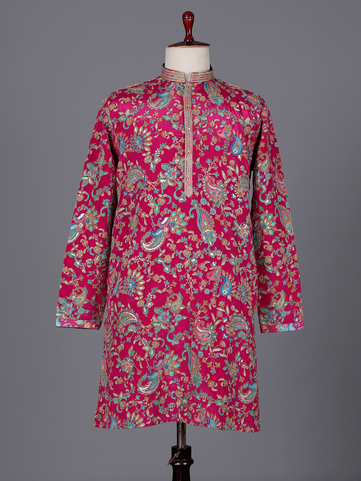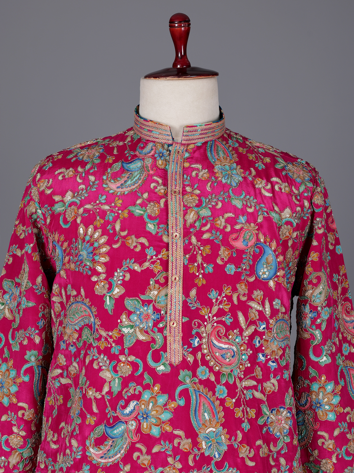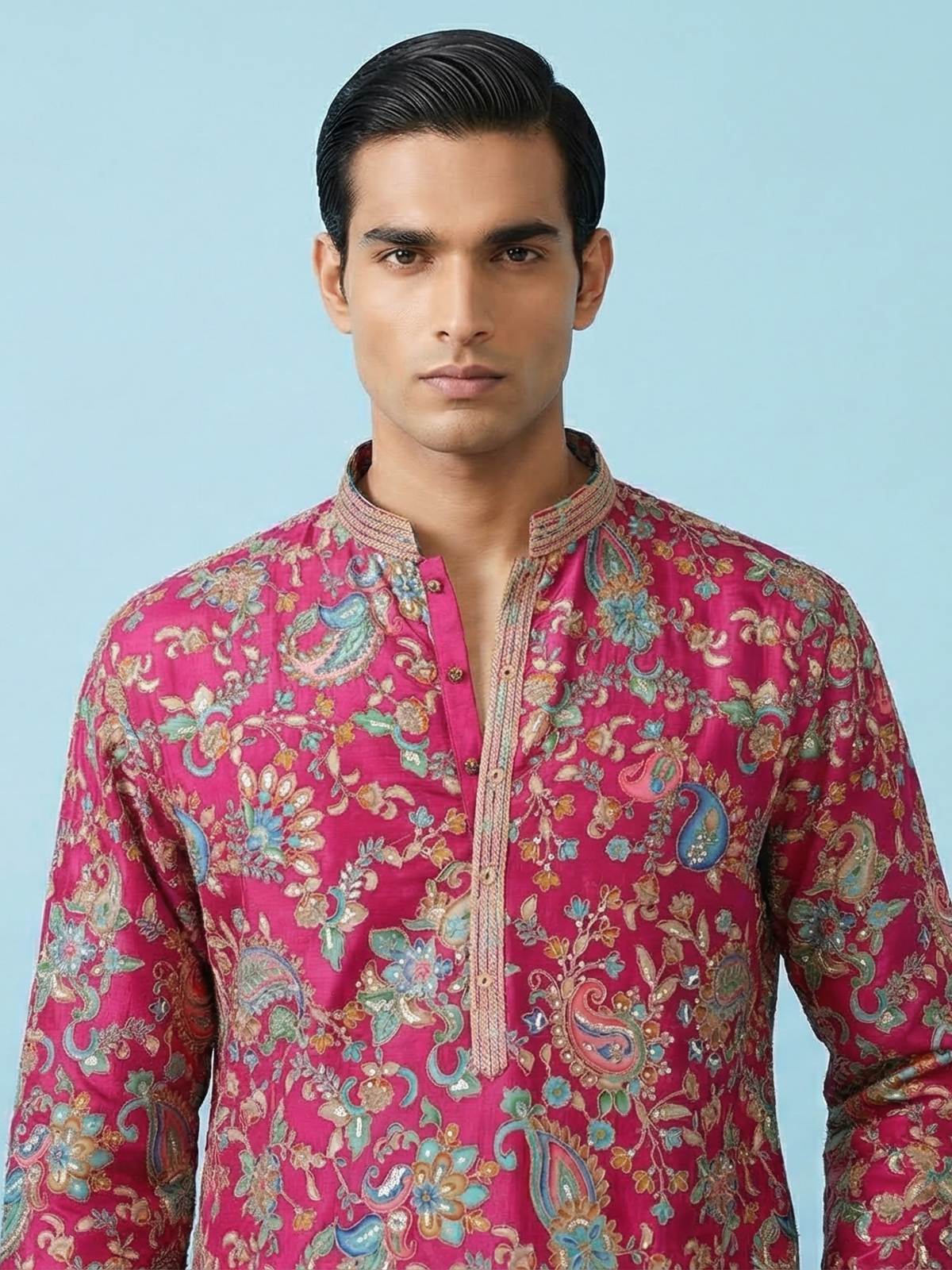 Vibrant rani pink silk kurta suit brings bold festive elegance to your wardrobe. The mandarin collar kurta is detailed with resham and sequins that create a graceful shimmer. Paired with comfortable pants, it forms a striking silhouette ideal for weddings and sangeet celebrations.