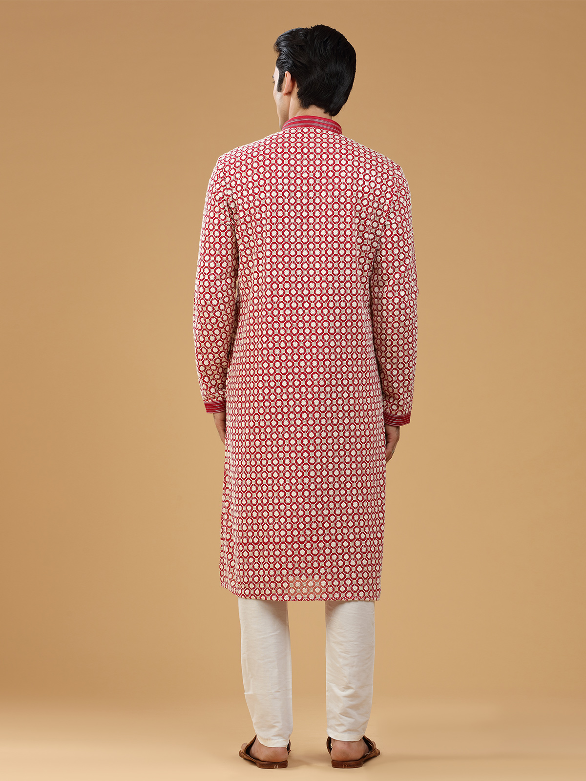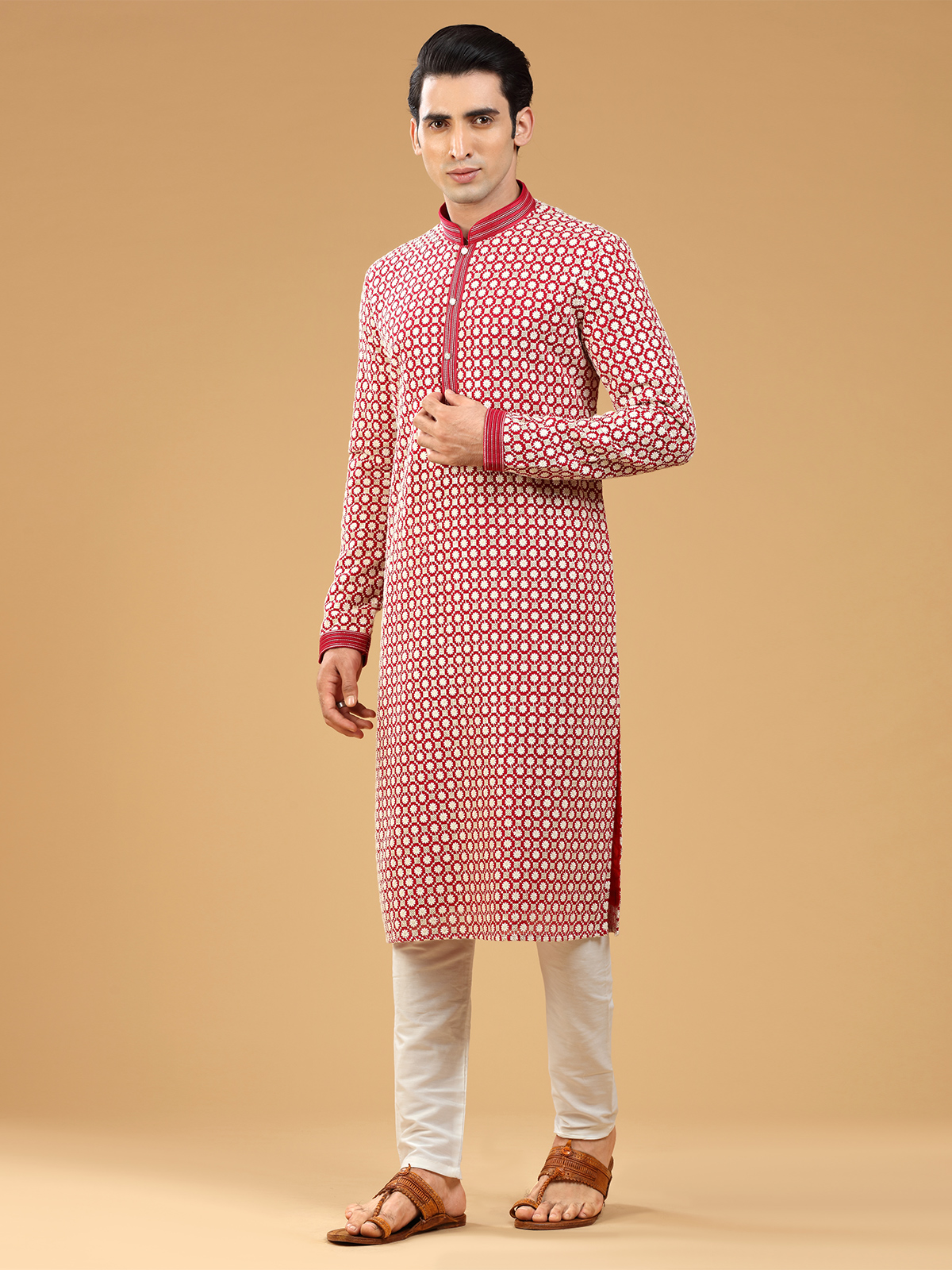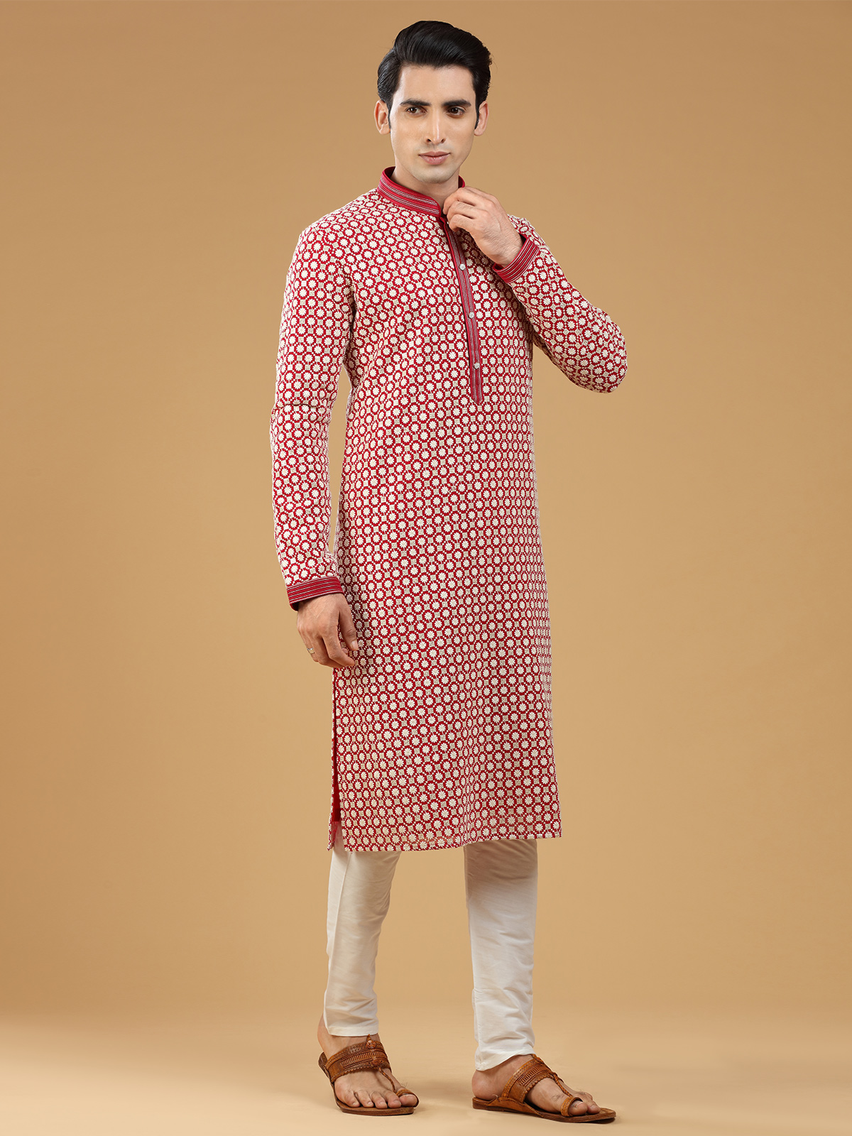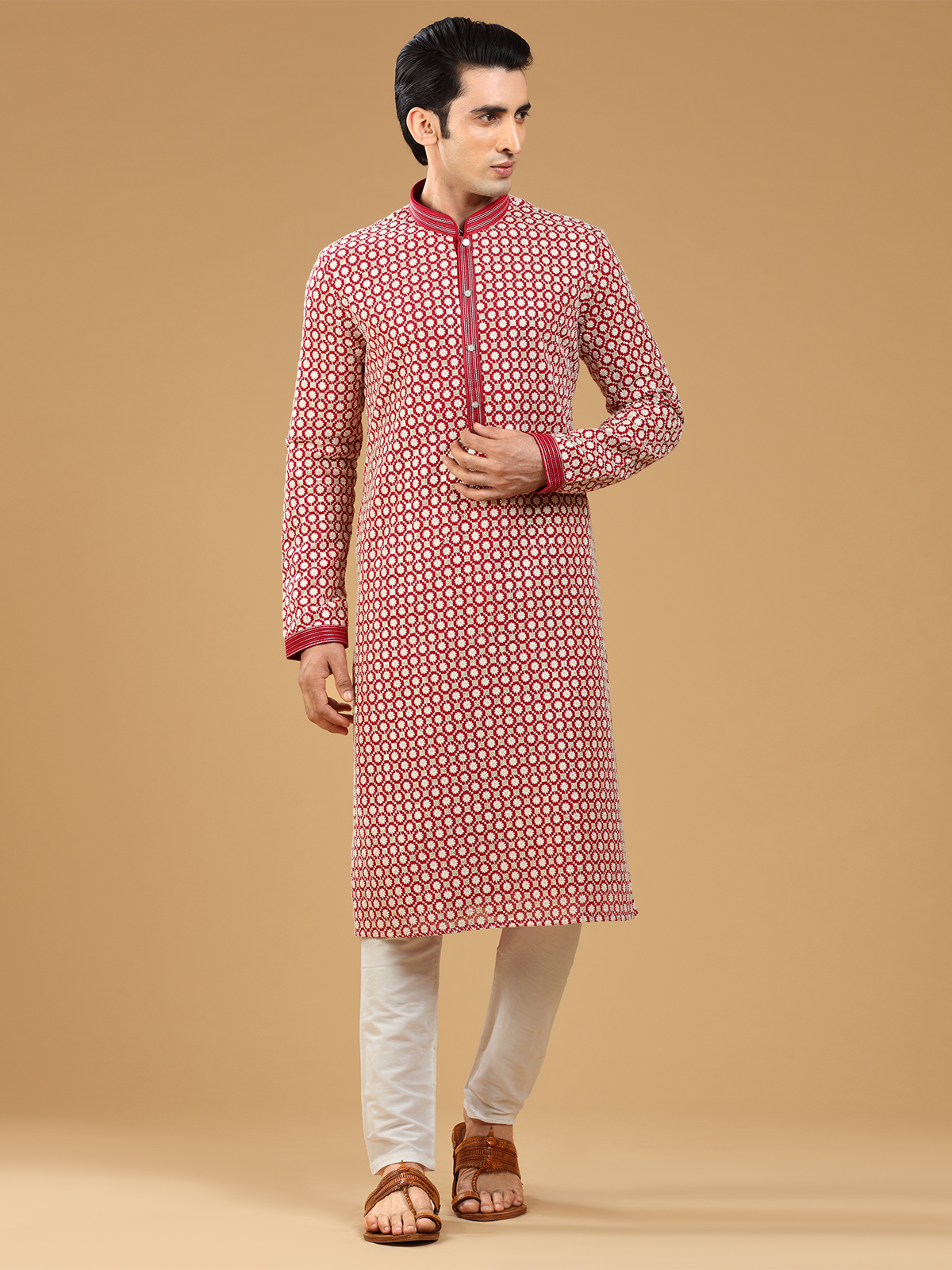 Add a touch of sophistication to your festive wardrobe with this subtle red georgette kurta suit, beautifully embellished with embroidery, resham and sequins work. It has a mandarin collar and full sleeves. Comes with a bottom.