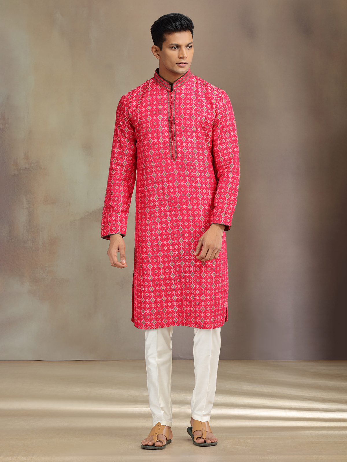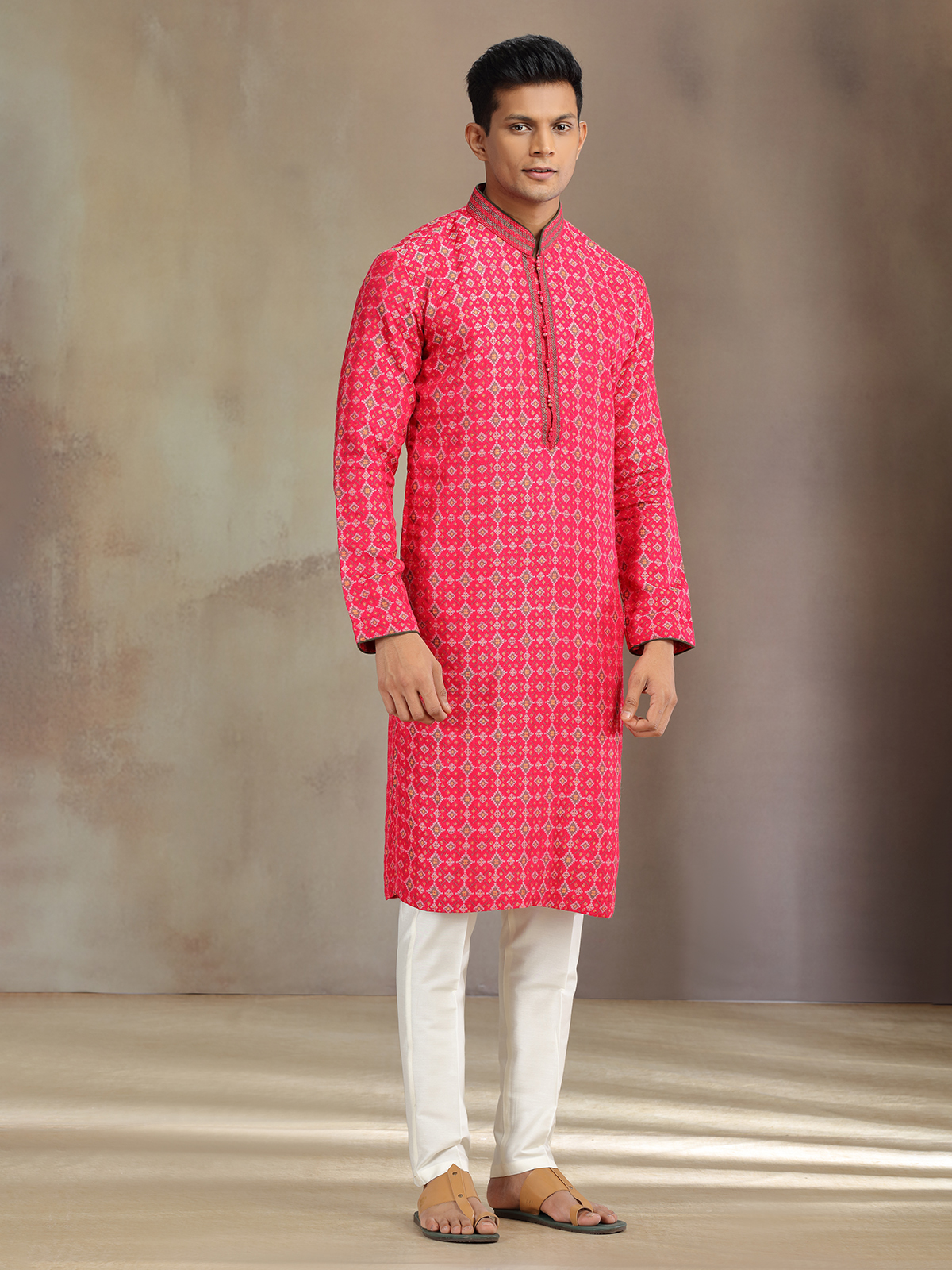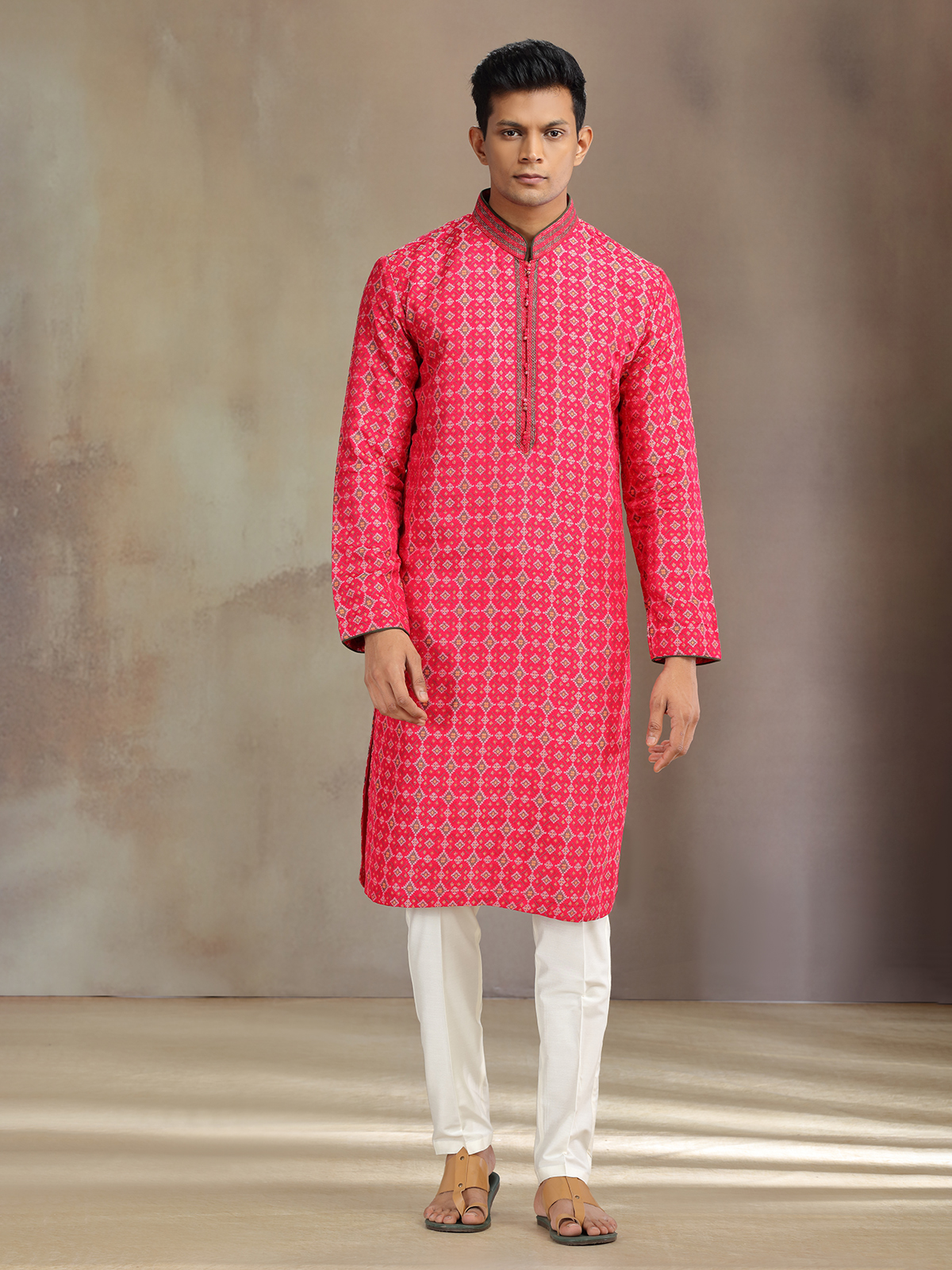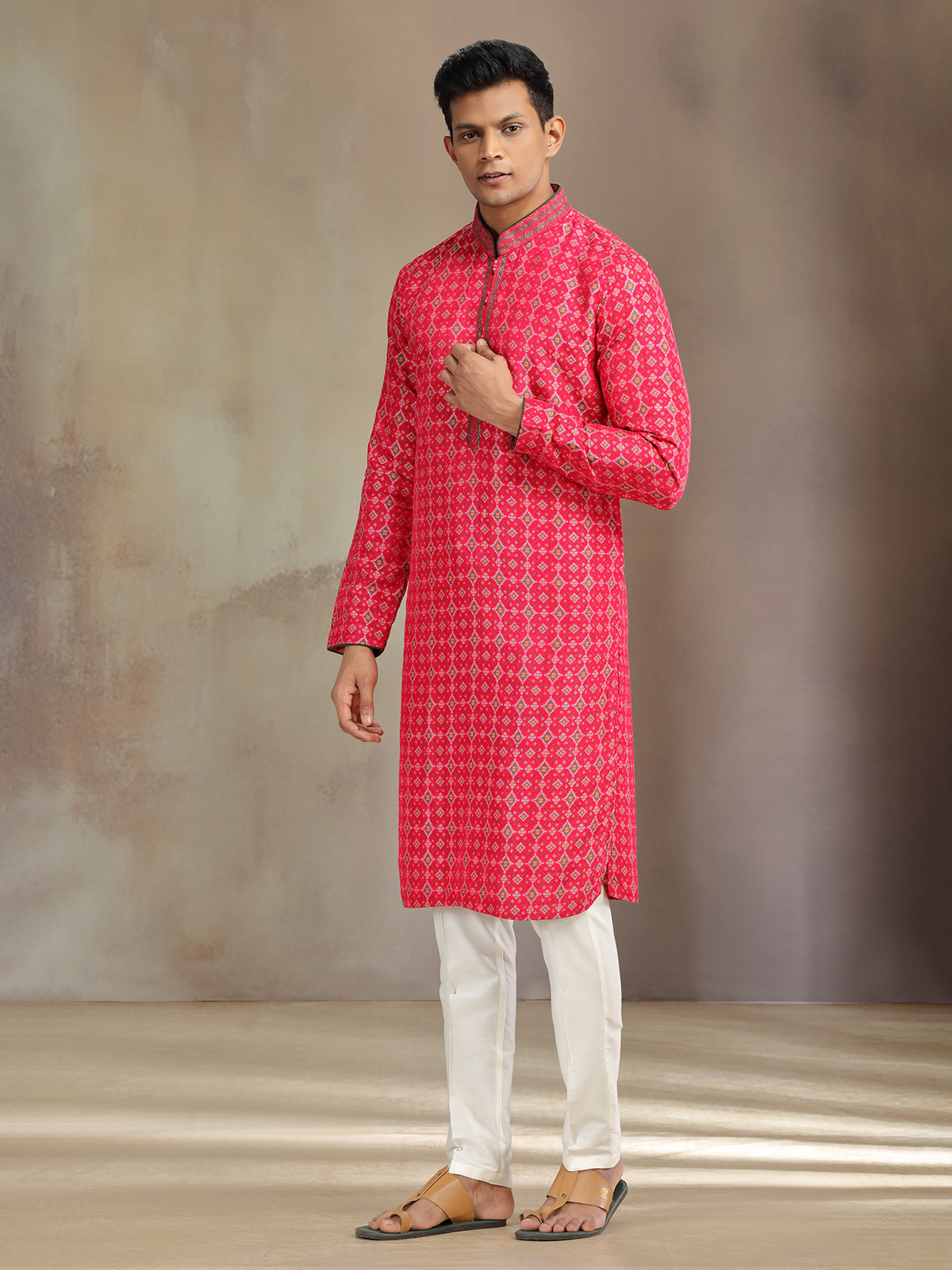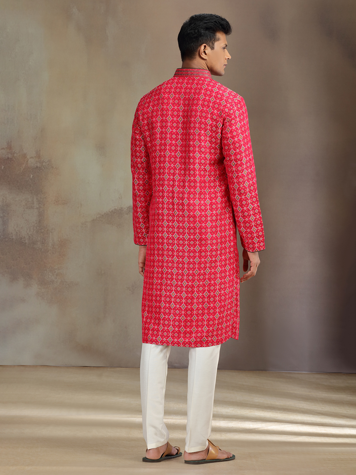 Red Patola Silk Kurta Pajama With Print For Men Festive Wear