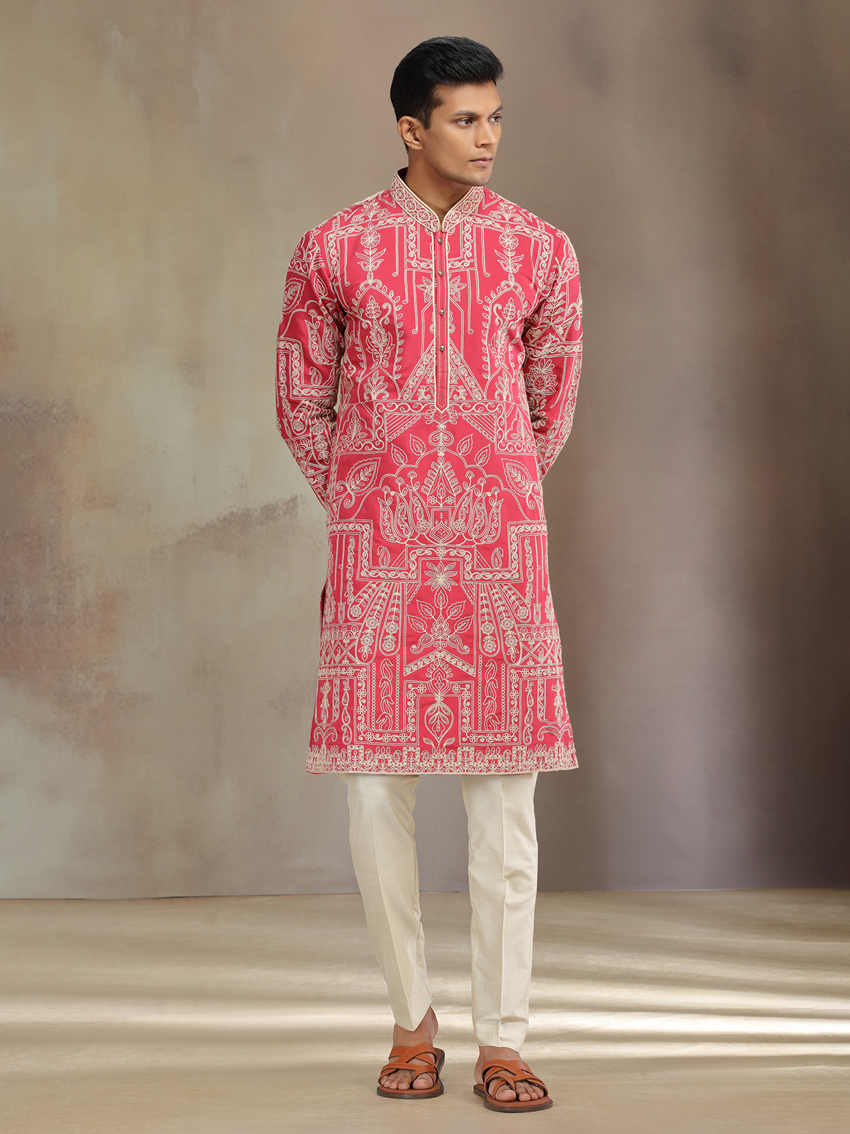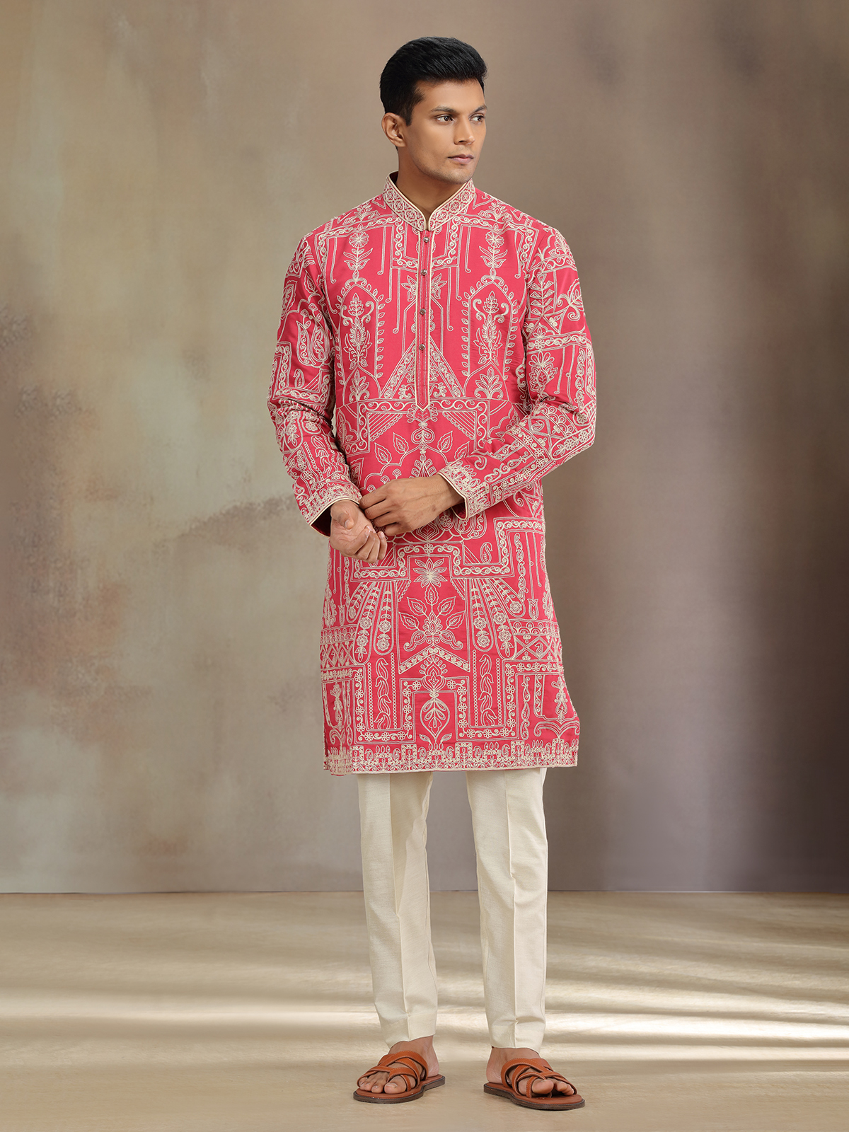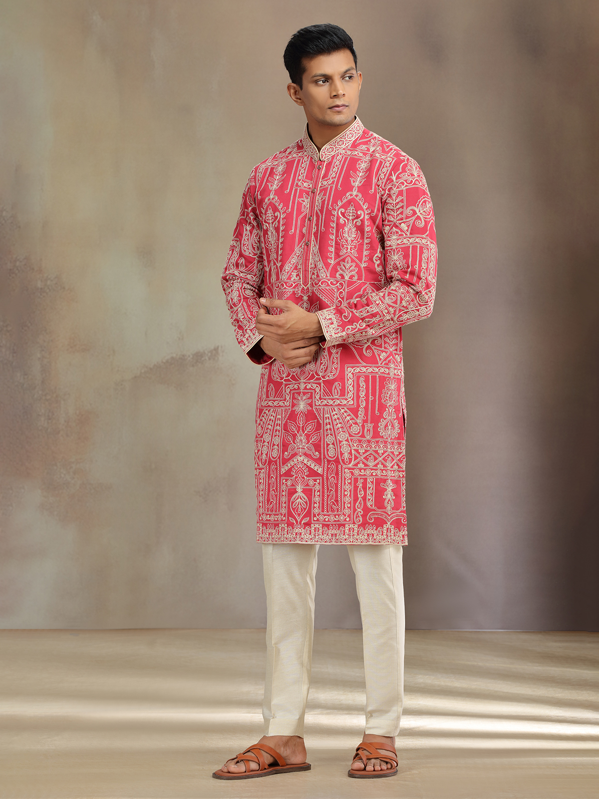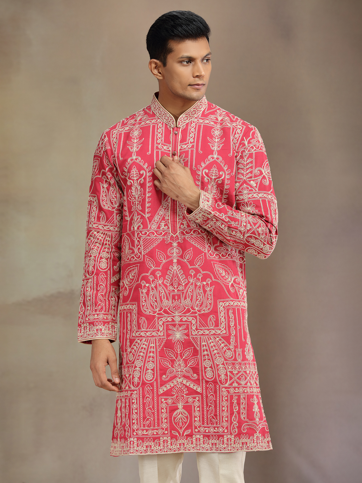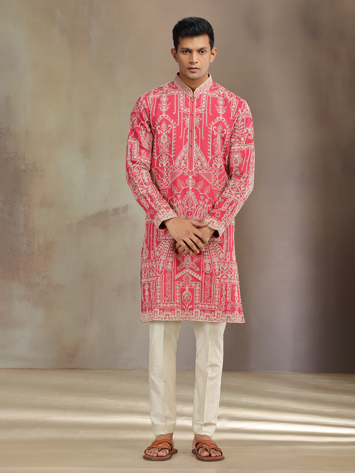 Red premium silk kurta pajama gleams with thread accents, radiating warmth and festive aura. Designed with mandarin collar and full sleeves, it pairs beautifully with pant for refined celebrations.