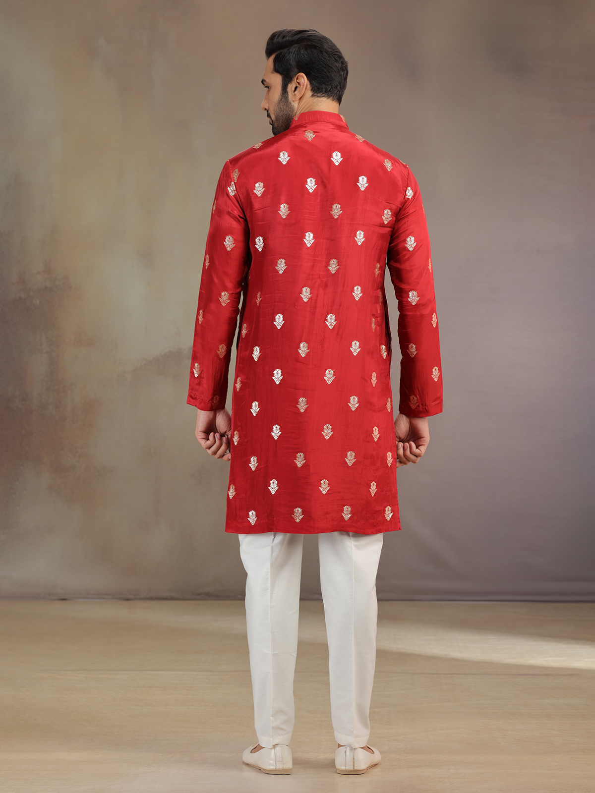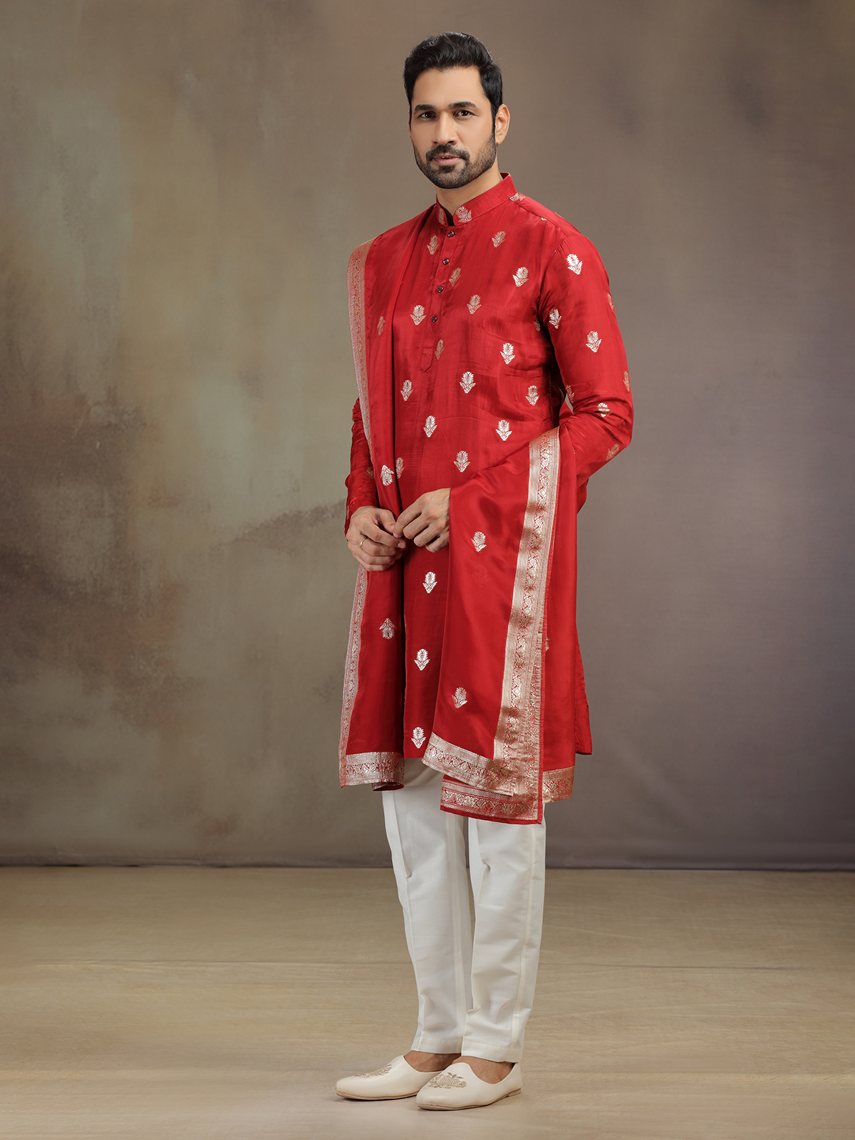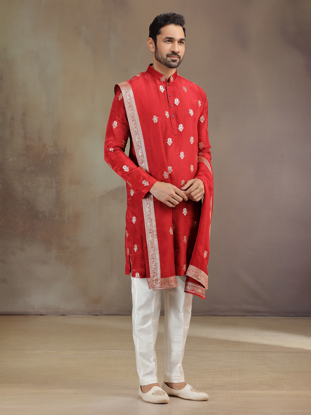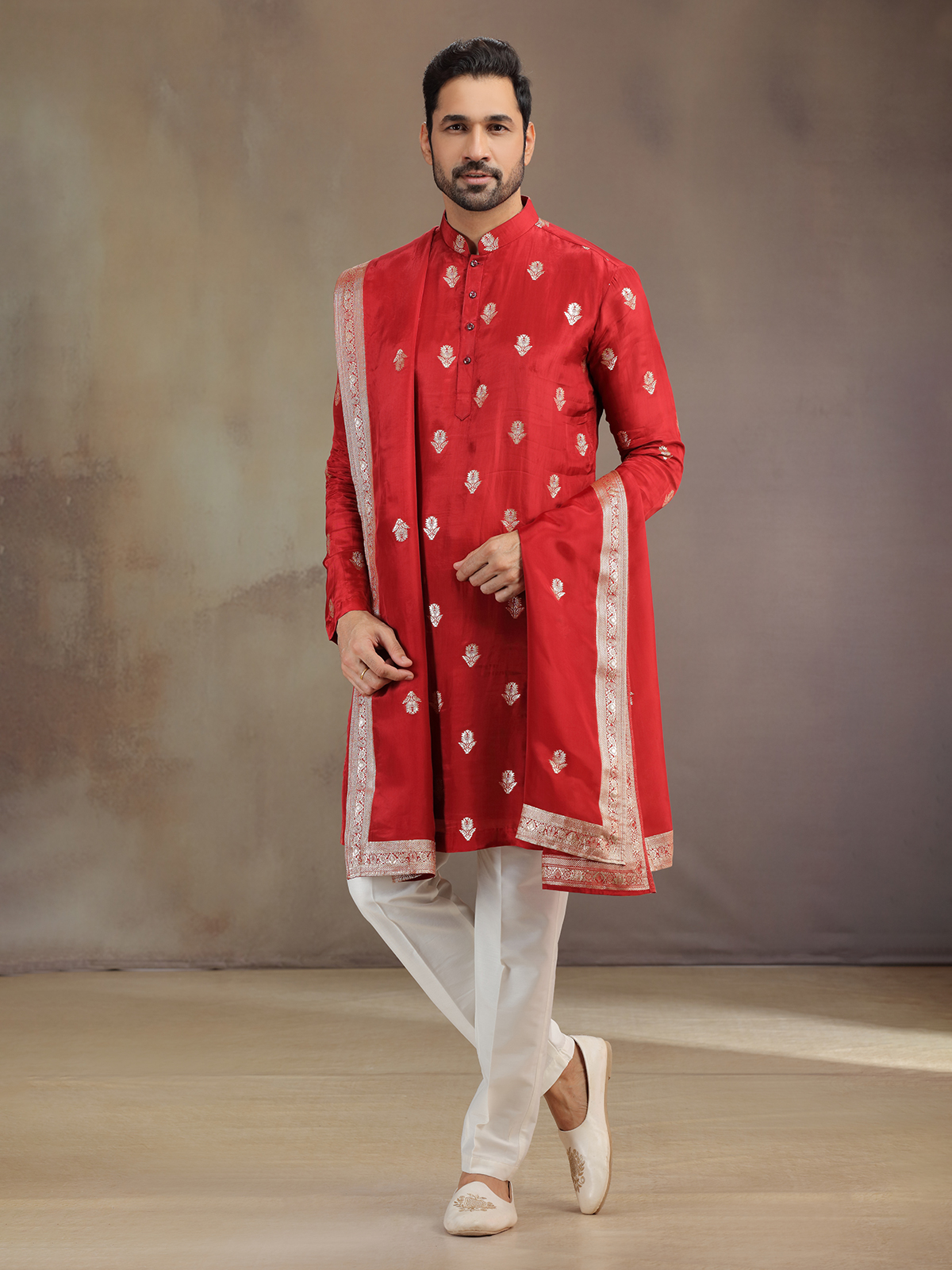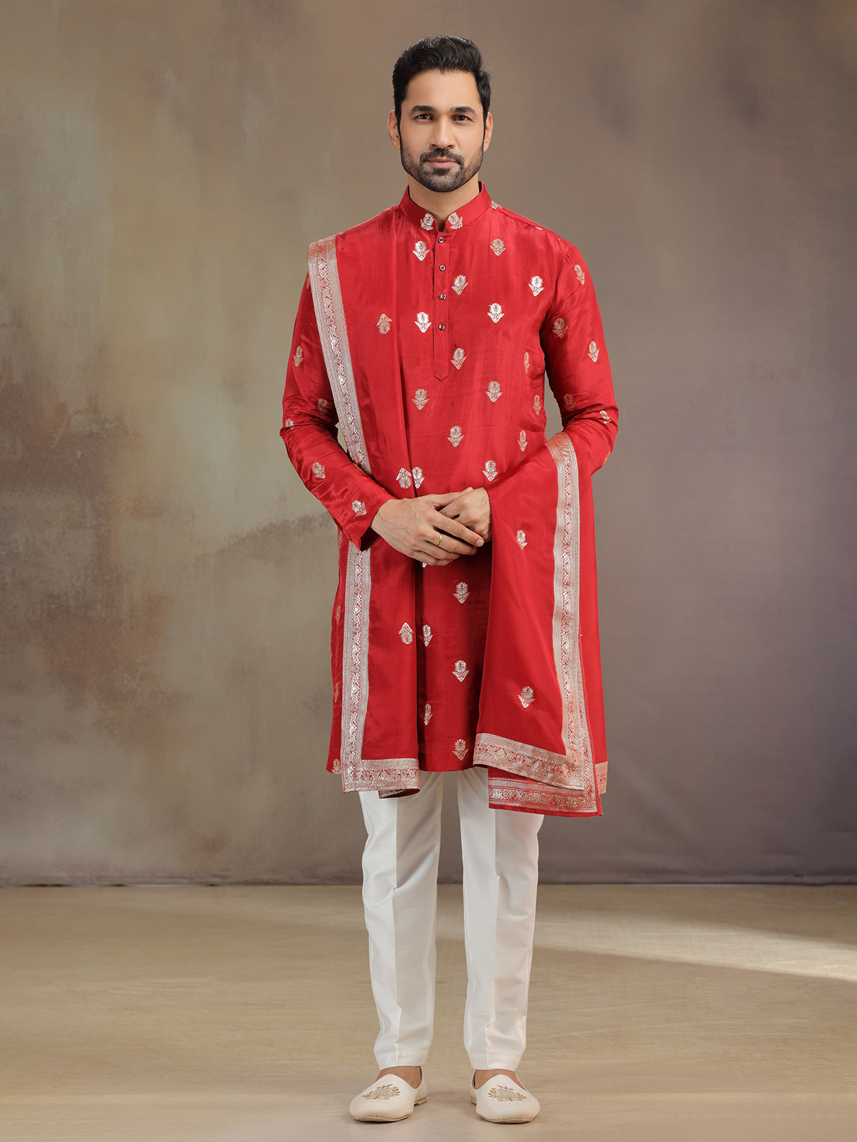 Radiant as celebration itself, this red silk kurta pajama glimmers with zari detailing. The ornate work highlights the mandarin collar and full sleeves. Paired with pants and atrractive dupatta, it brings alive a regal festive spirit, creating a commanding yet refined presence.