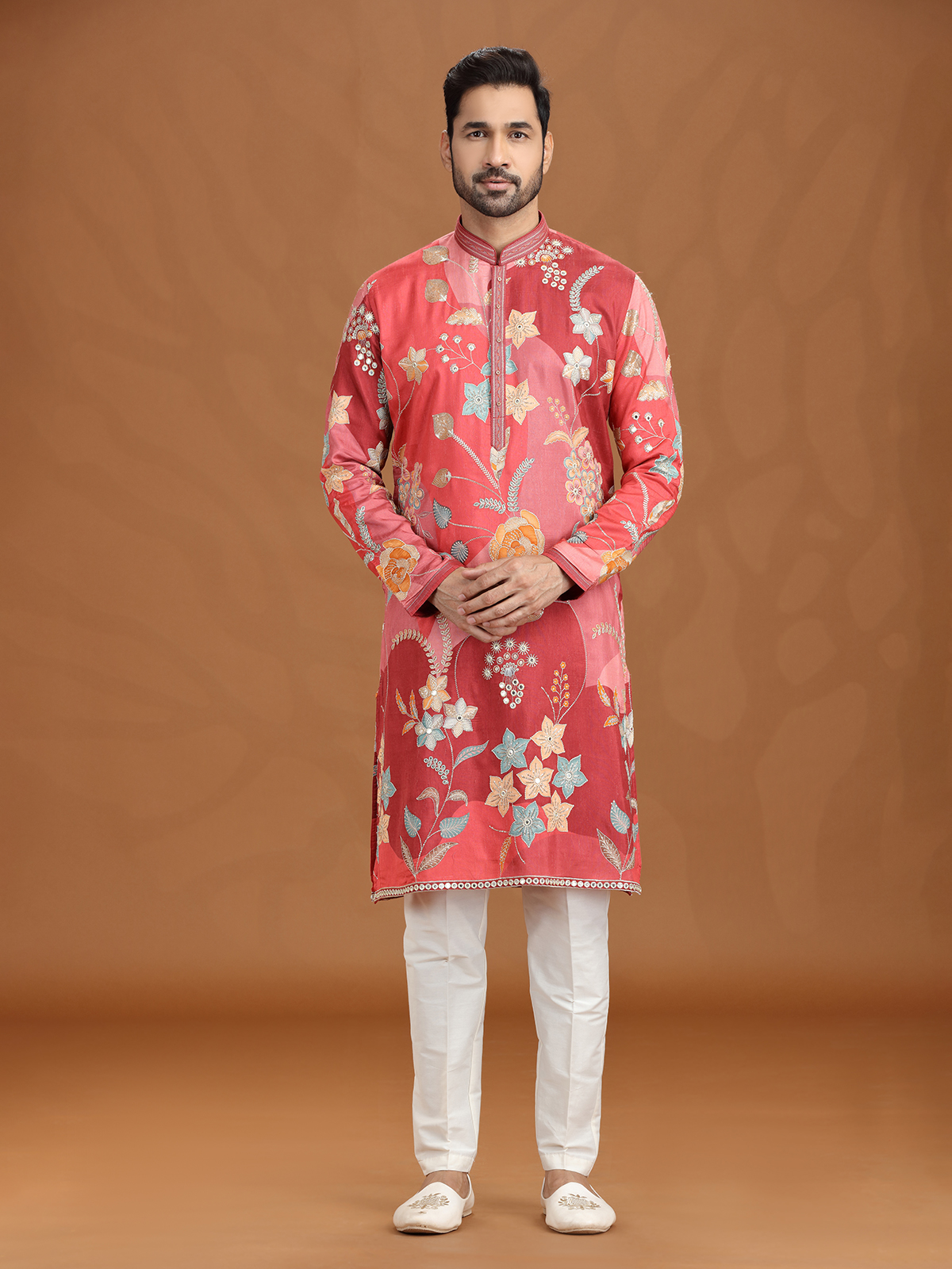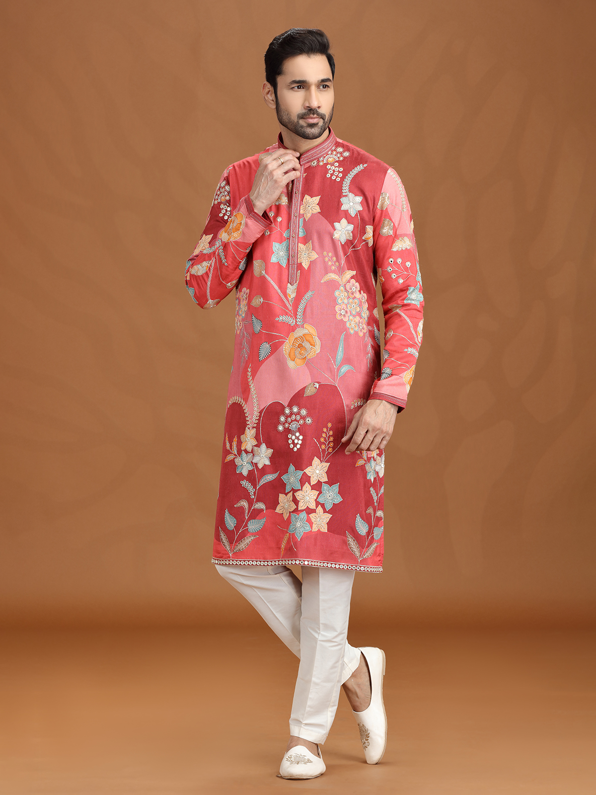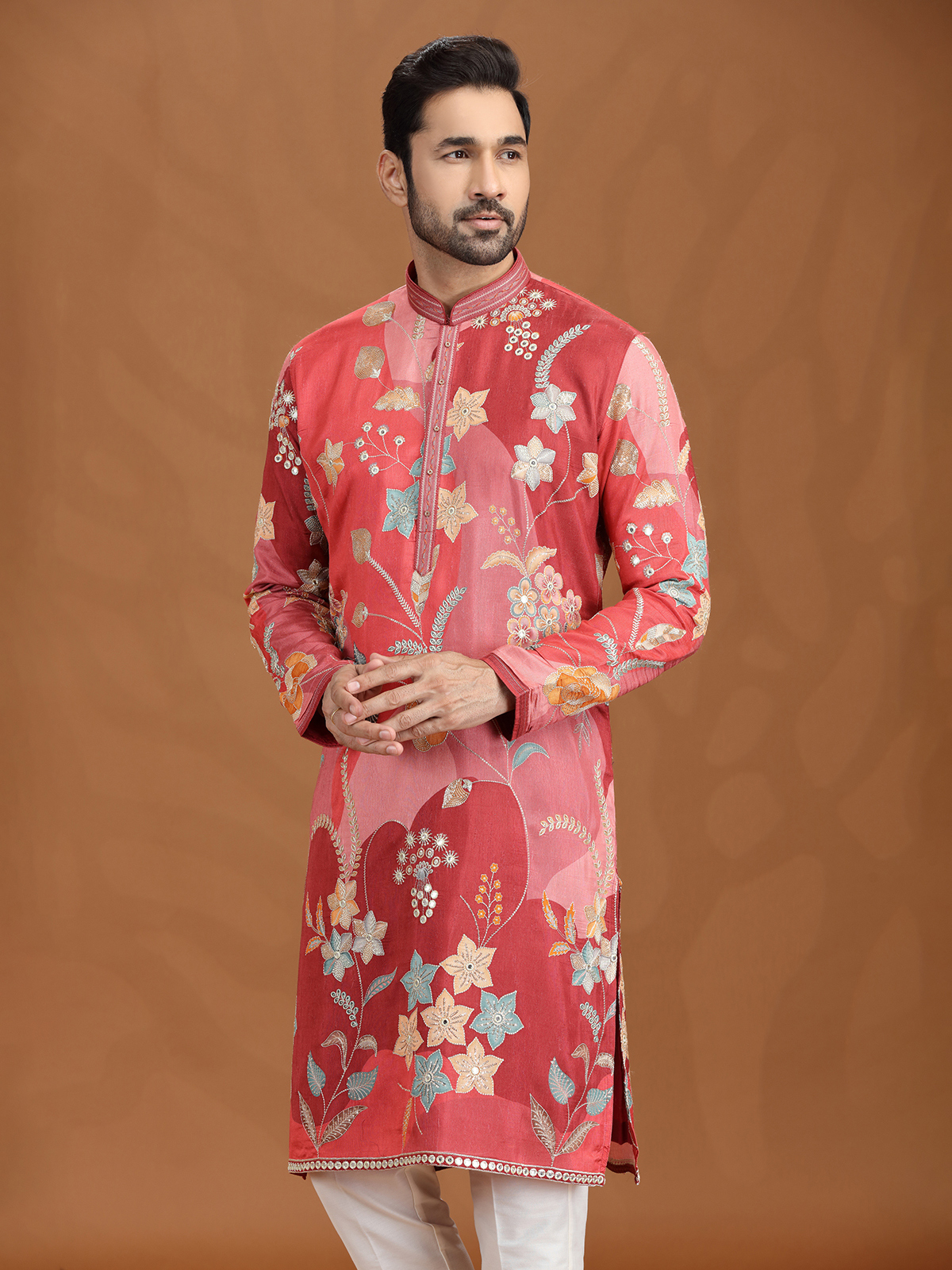 Stand out in this reddish pink viscose kurta suit featuring embroidery, sequins, and aabla highlights on floral prints. The refined stand collar and pant complement its festive vibrance. An ideal attire for weddings and celebrations, balancing playful patterns with luxurious embellishments.