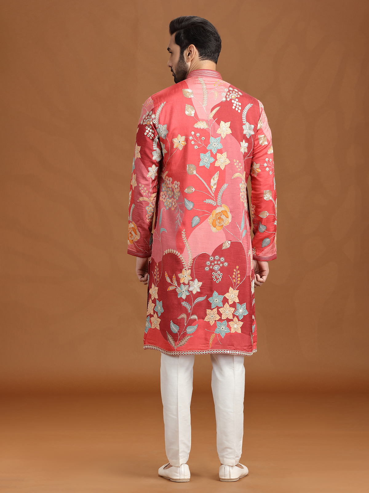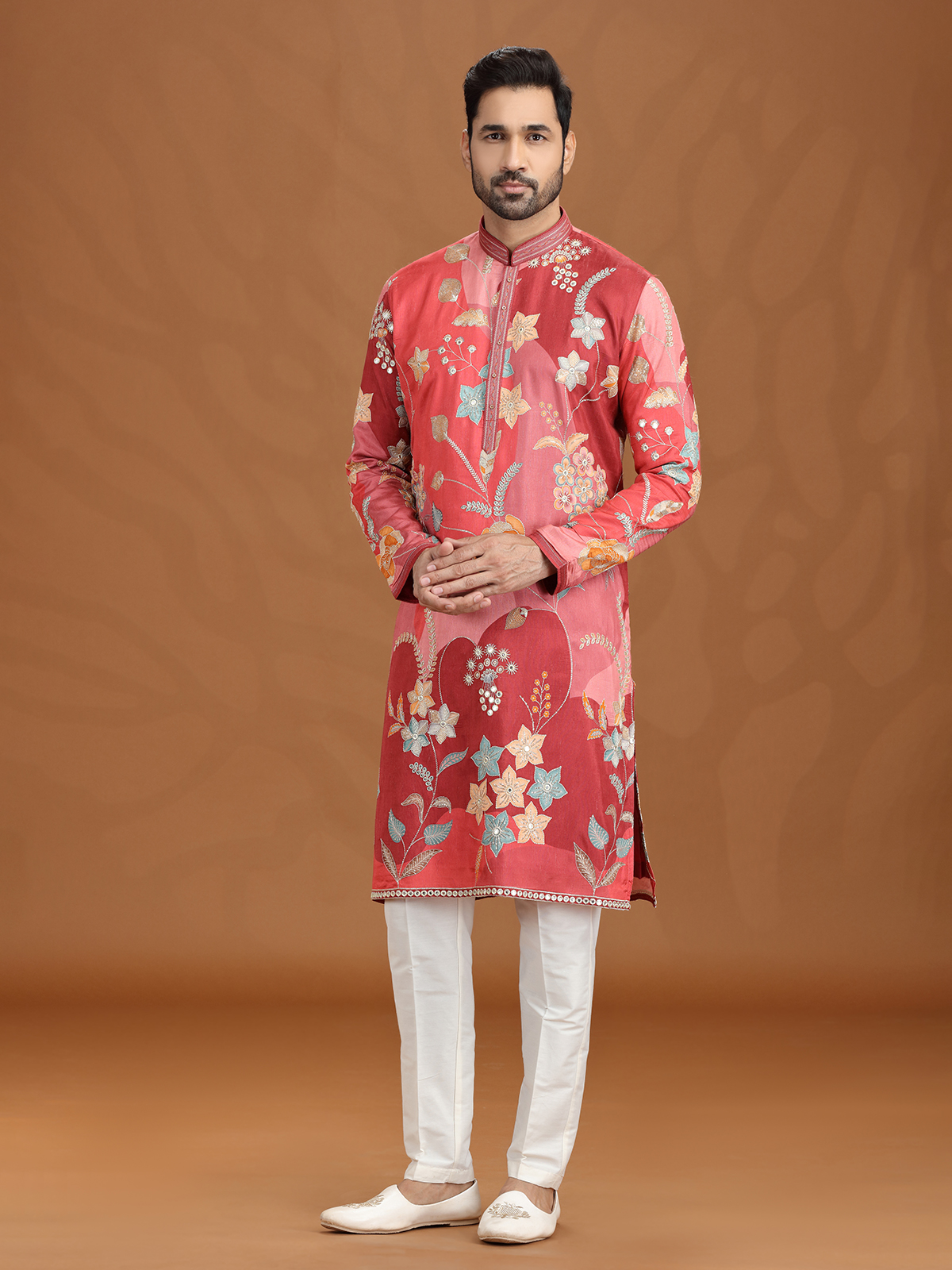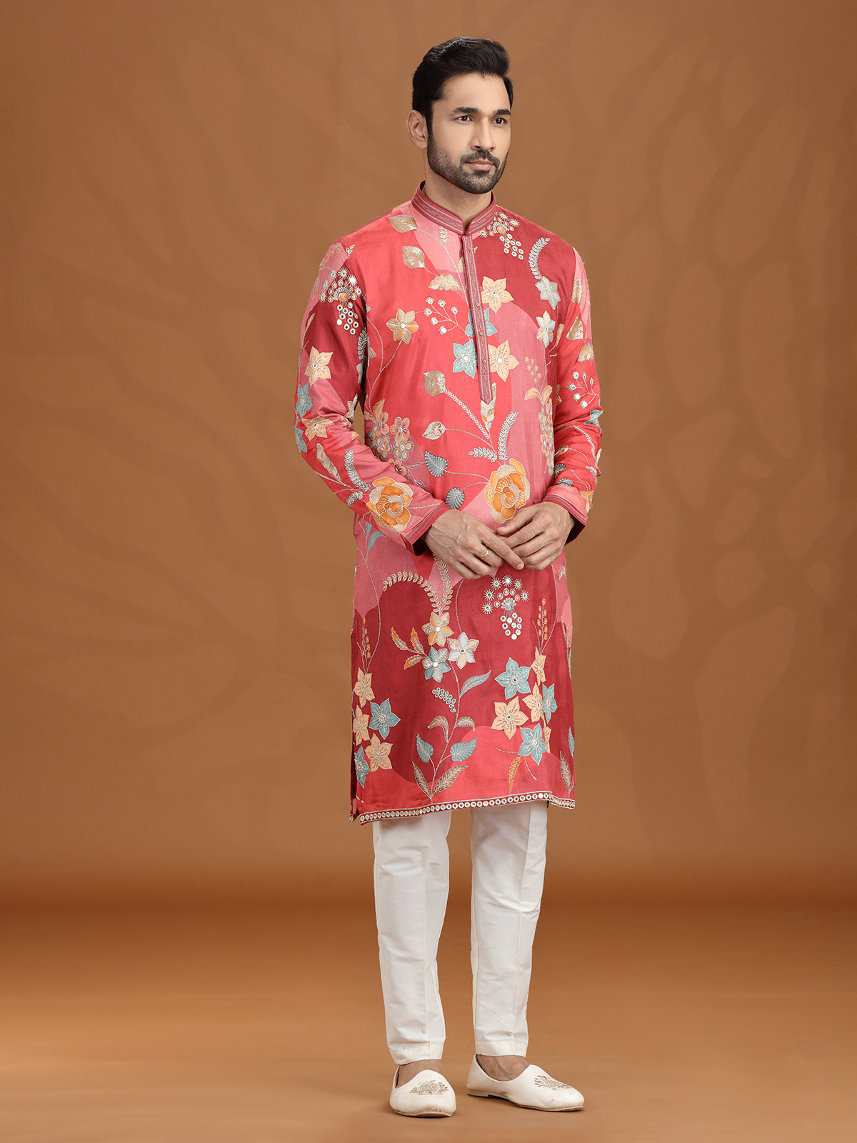 Stand out in this reddish pink viscose kurta suit featuring embroidery, sequins, and aabla highlights on floral prints. The refined stand collar and pant complement its festive vibrance. An ideal attire for weddings and celebrations, balancing playful patterns with luxurious embellishments.