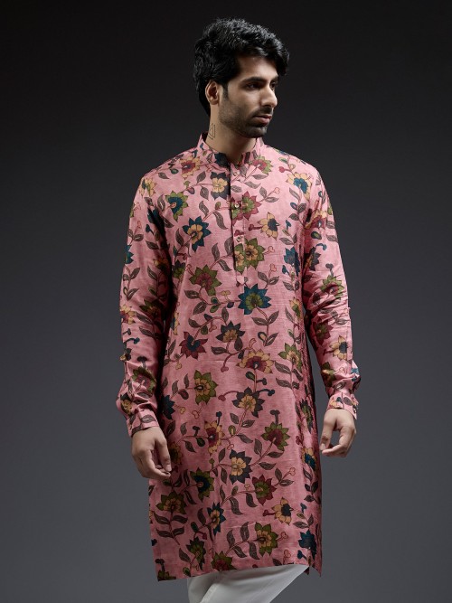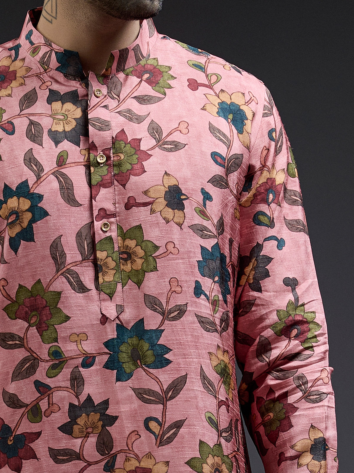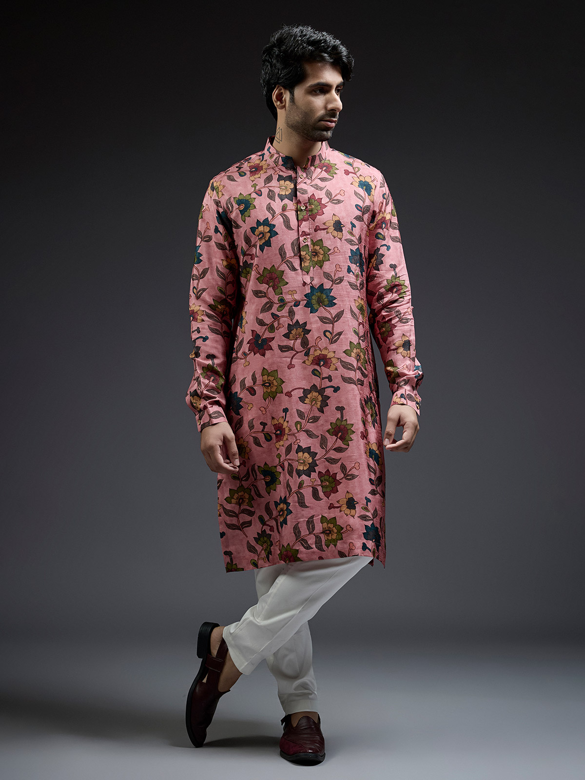 For every occasion, this light pink kurta set is a beautiful yet understated option. It is made of silk and has a pataudi flower print on it. The white bottom provides the ideal finishing touch, while the mandarin collar guarantees comfort and style.