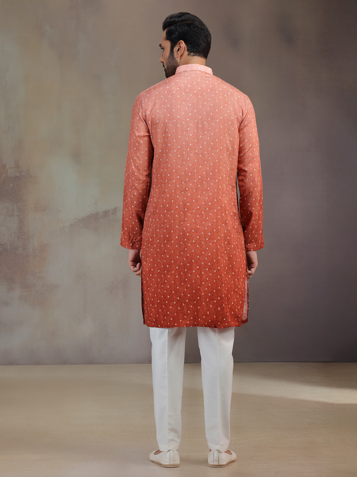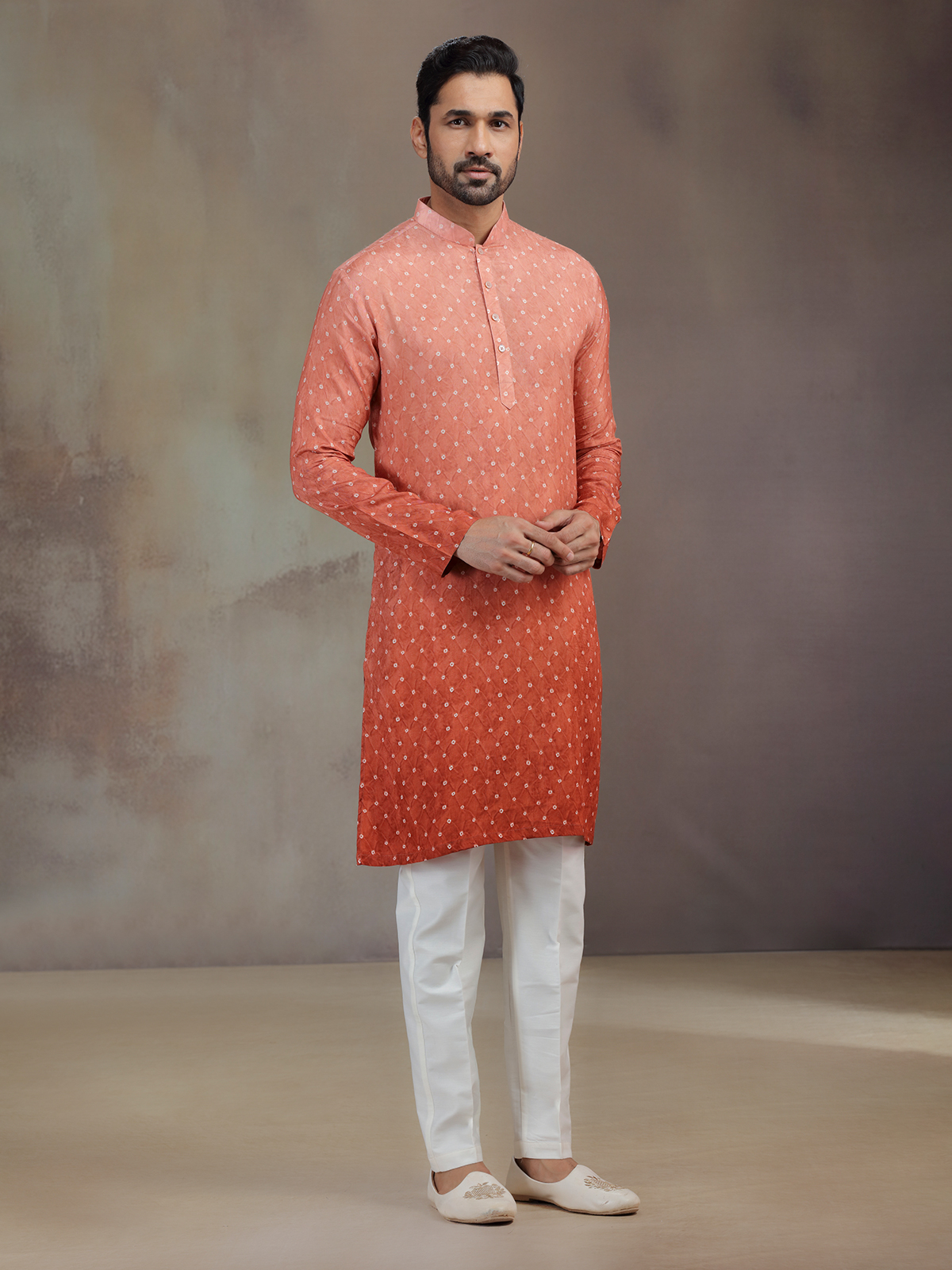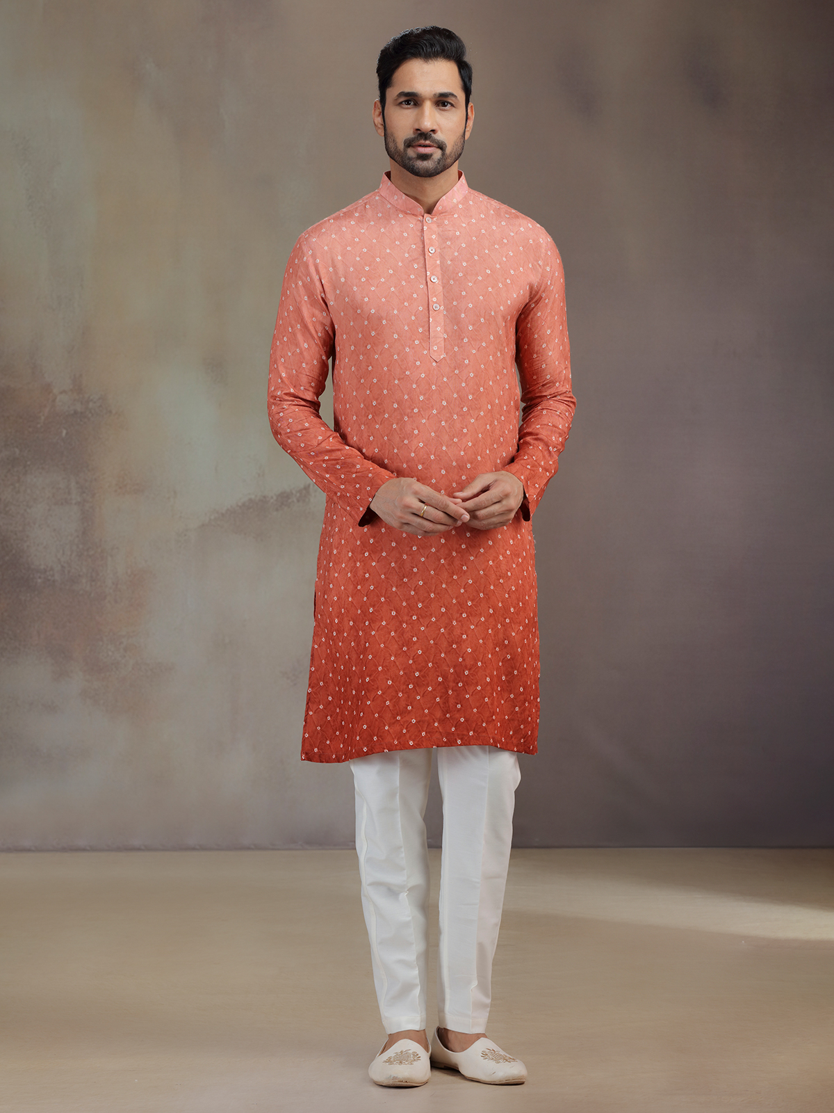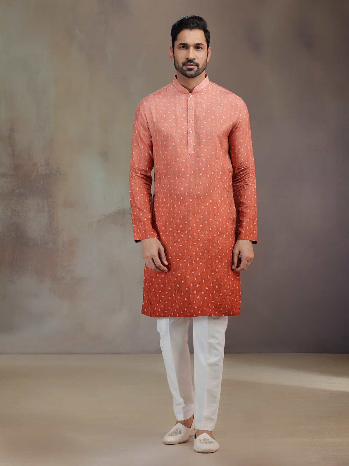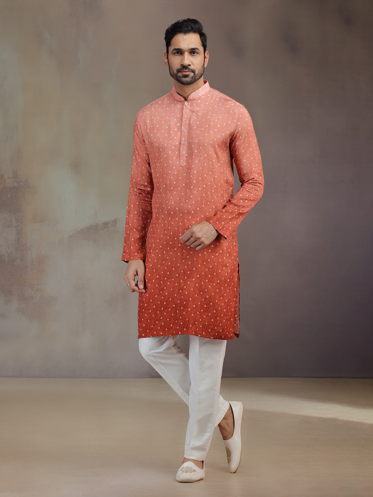 Bold and earthy, this rust red silk printed kurta pajama glows with festive artistry. The intricate work frames its mandarin collar and full sleeves, enhancing cultural elegance. Teamed with pants, it makes a refined ensemble that radiates warmth and heritage charm.
