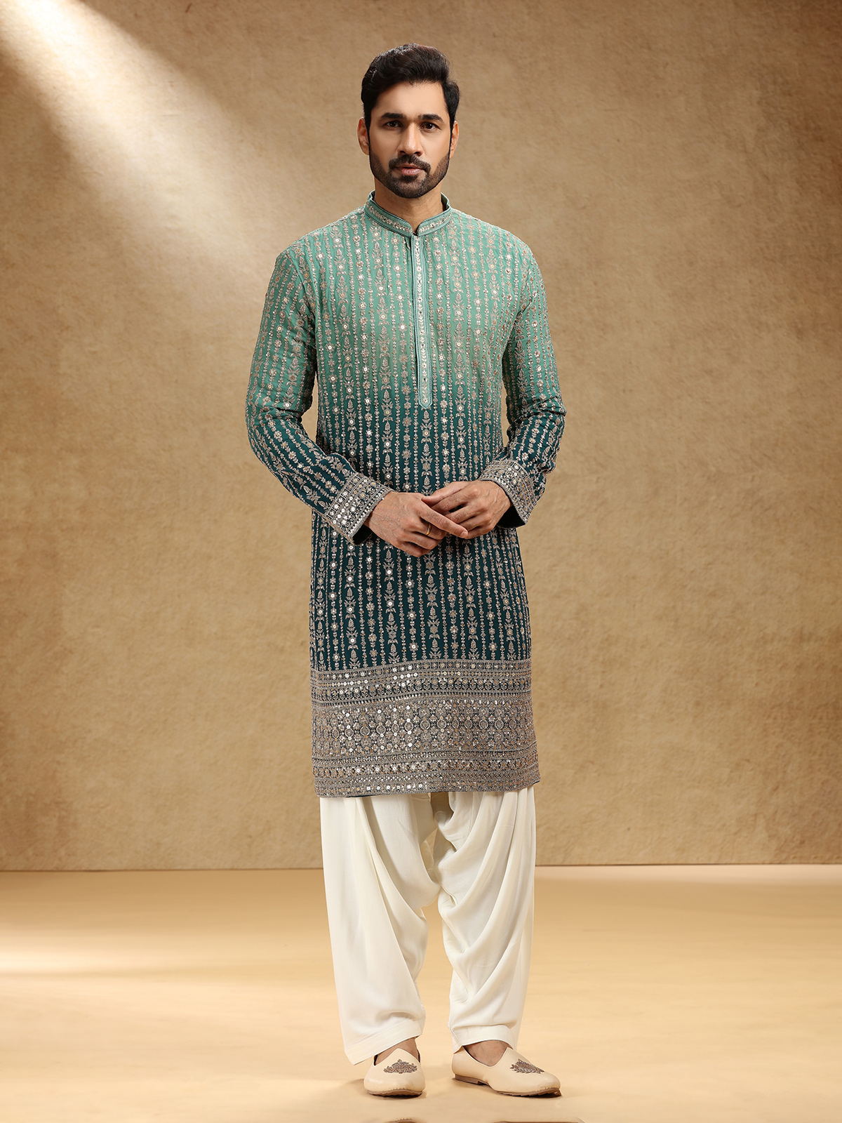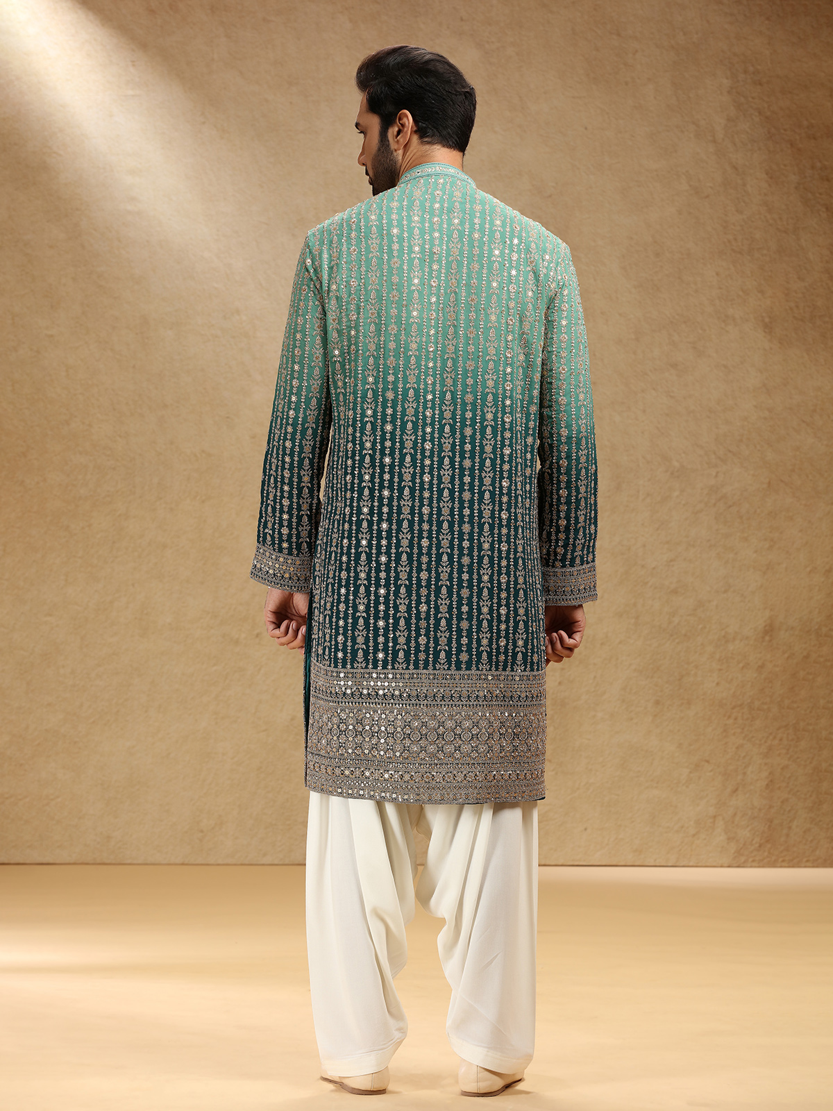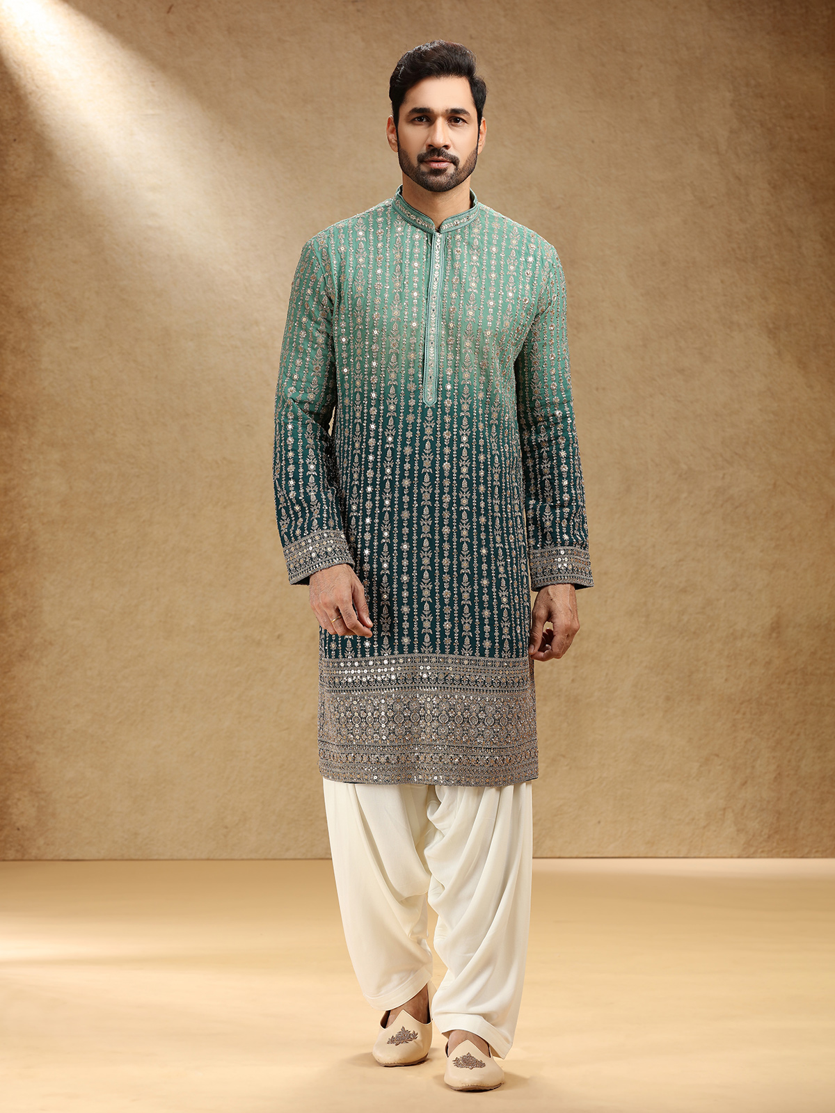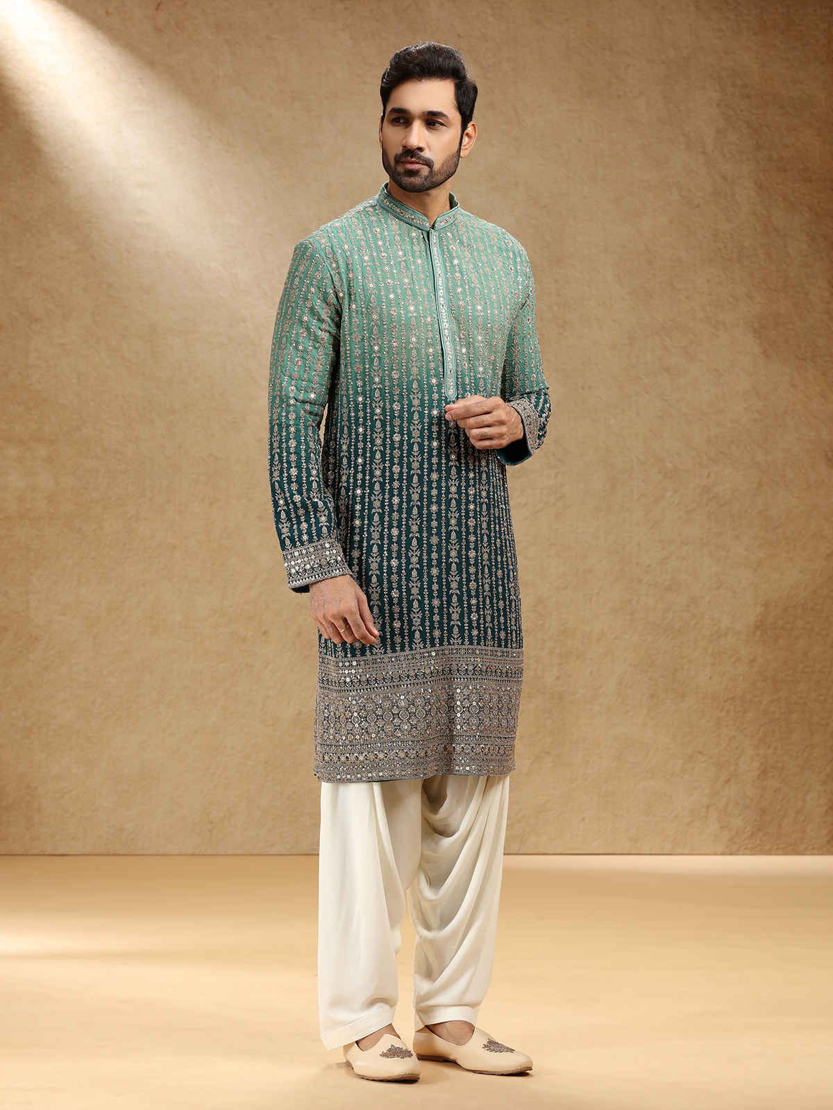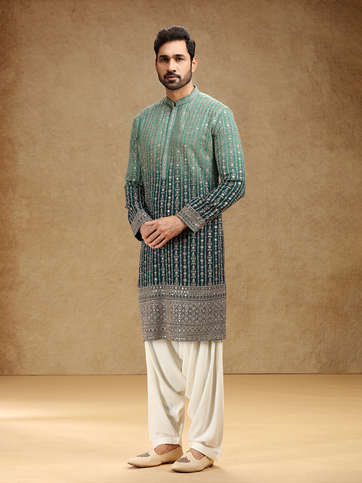 Draped in shaded green georgette, this kurta suit dazzles with resham and sequins work that capture festive radiance. Styled with a stand collar and full sleeves, it pairs with pants for graceful ease. The rich shaded green tone brings depth and regality, creating attire that reflects timeless elegance and refined craftsmanship for special occasions.