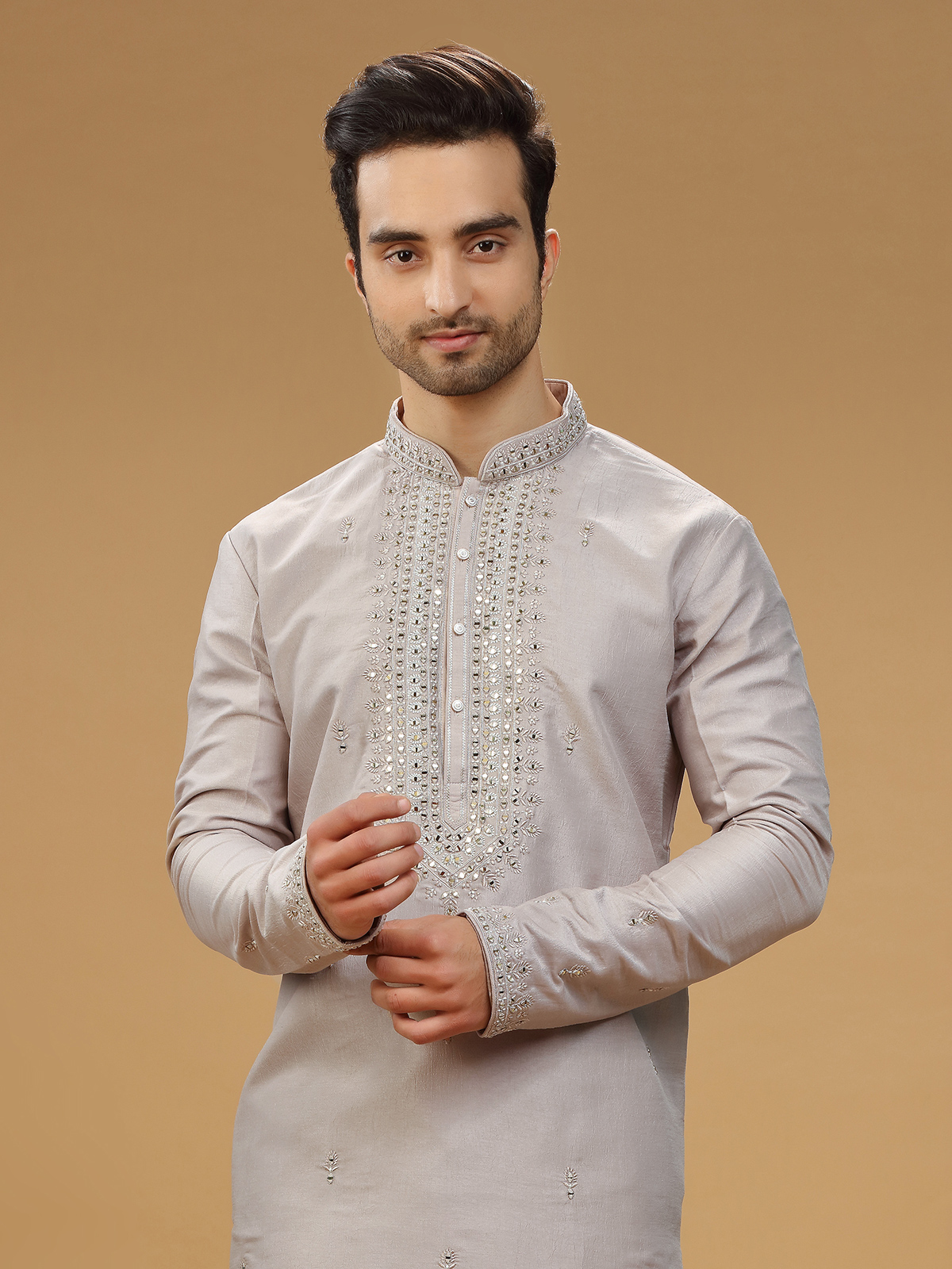 This stunning beige silk kurta suit adorned with an intricate embroidery, resham and mirror work, it exudes elegance with its mandarin collar and full sleeves. The set includes bottom to complete the look.