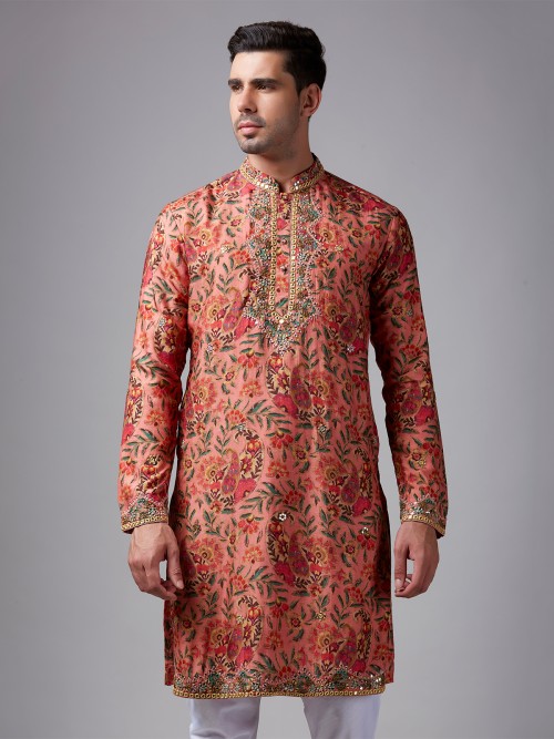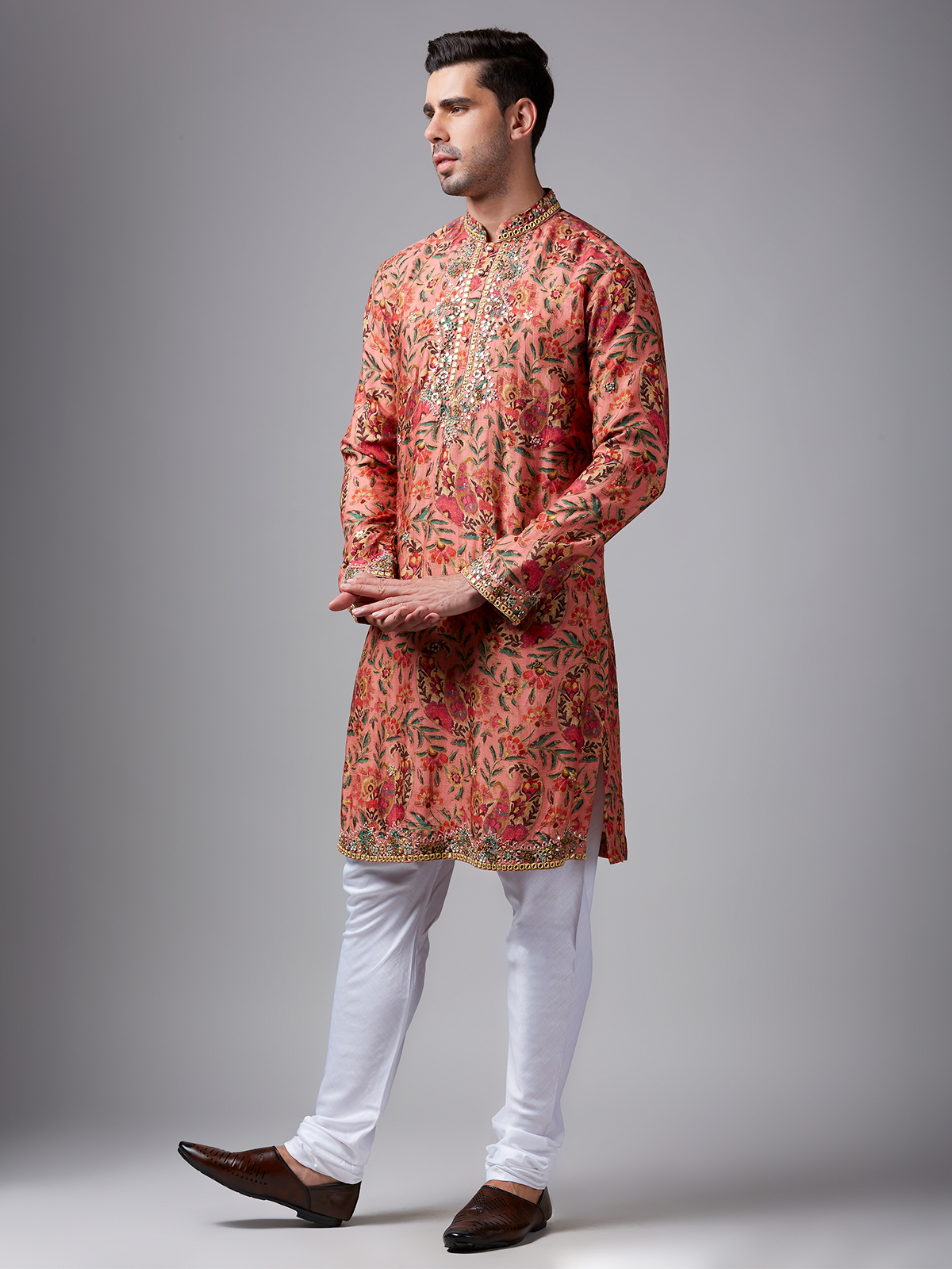 Elevate your style with this orange floral printed silk kurta suit, adorned with mirror and resham work. Crafted for comfort, it features a mandarin collar, full sleeves, and a churidar, ensuring effortless wear for any occasion.