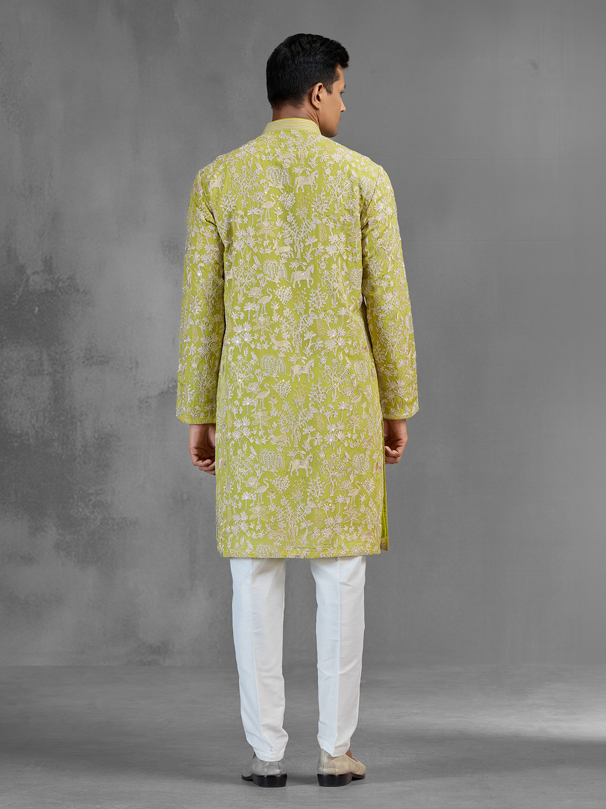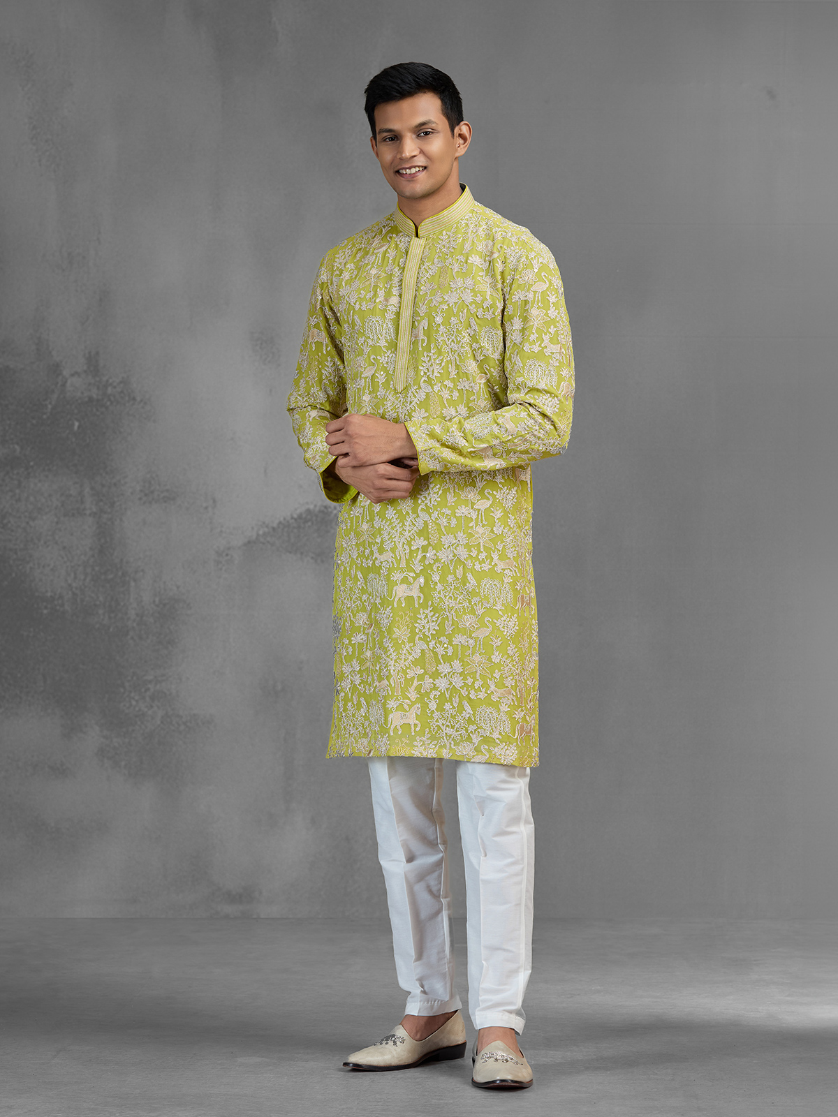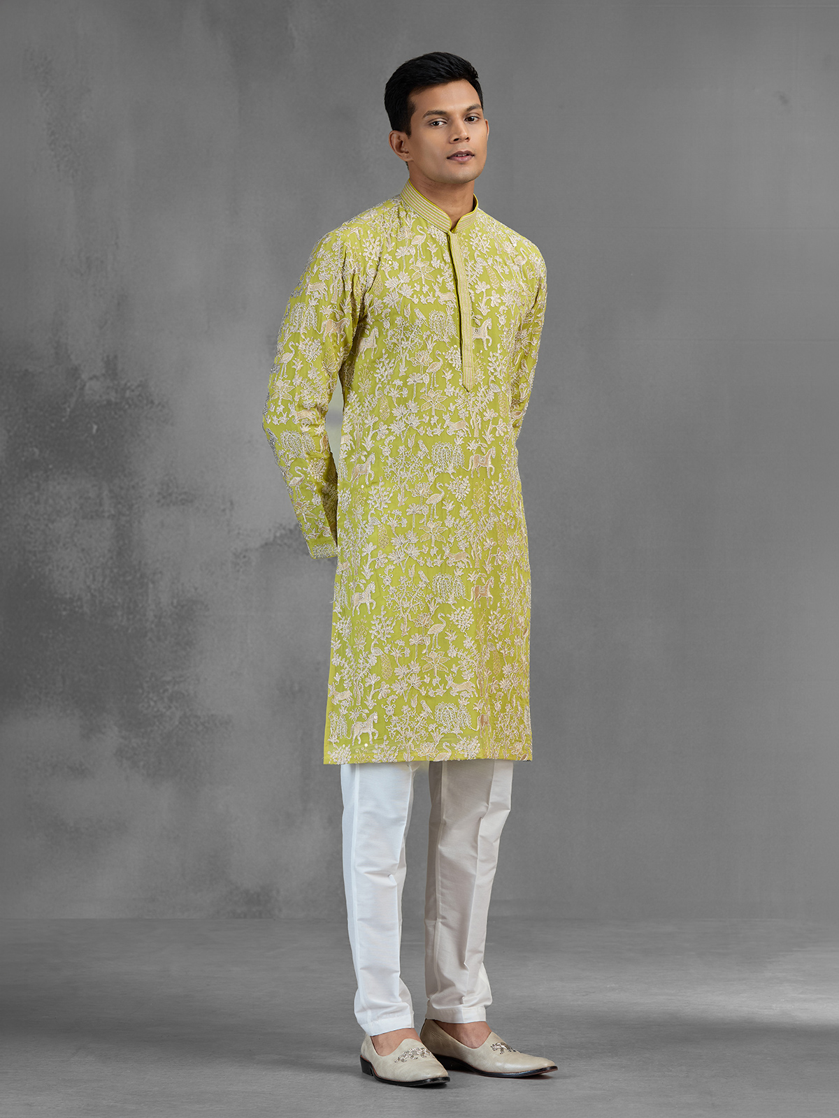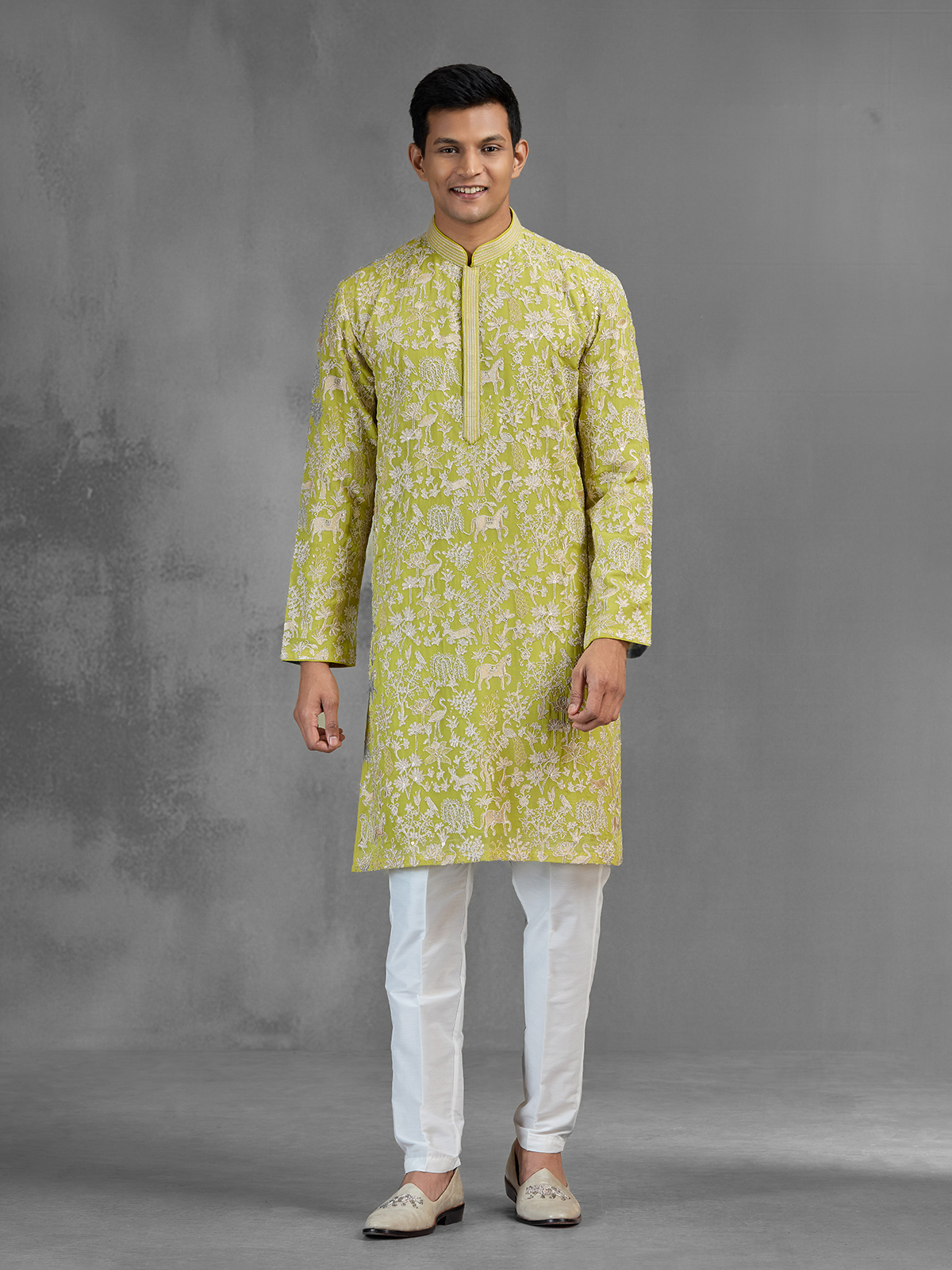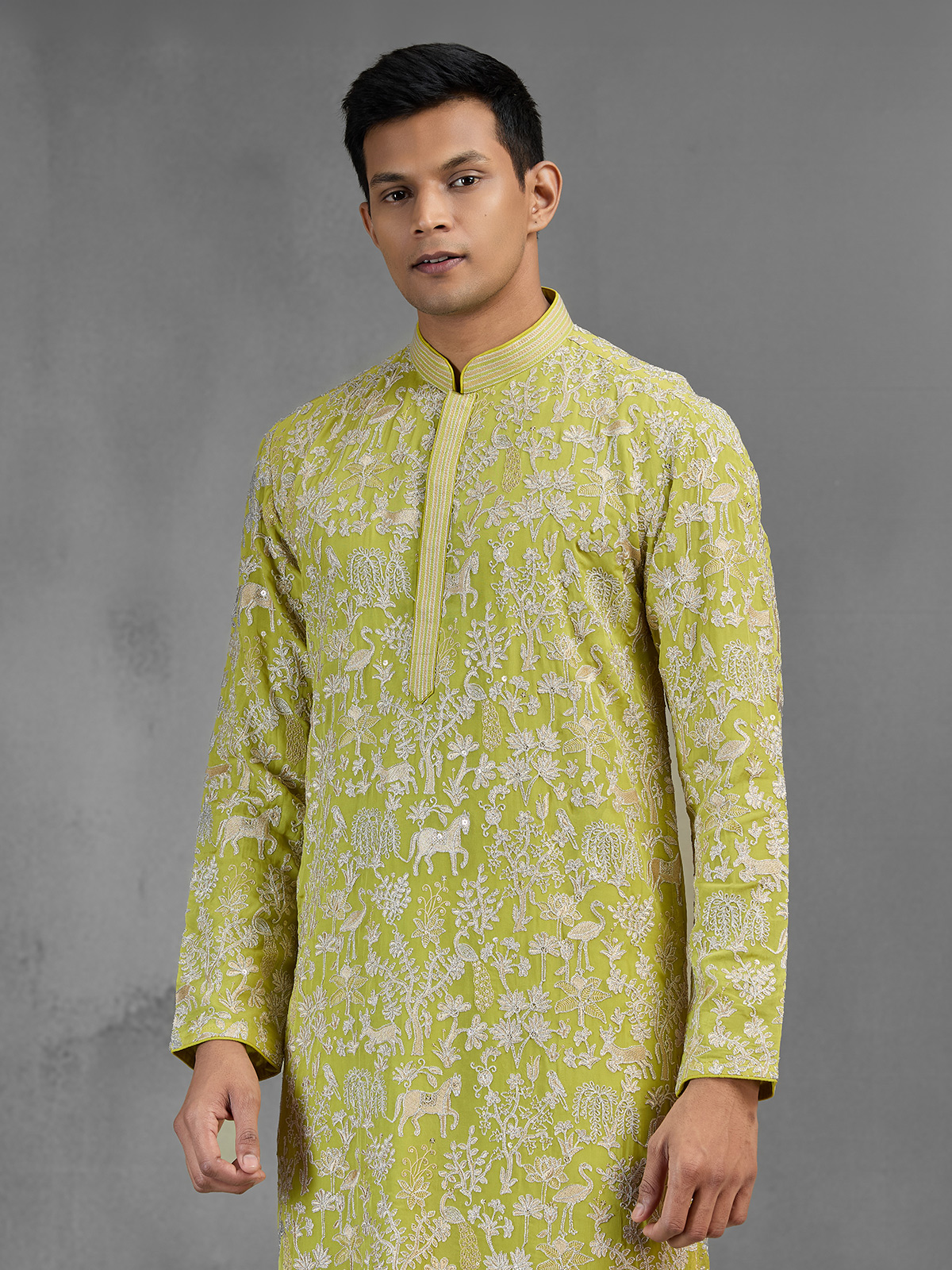 Infused with vibrant elegance, this lime green silk kurta suit showcases intricate chikankari, embroidery, sequins and zardosi work. Detailed with majestic elephant and horse motifs entwined with floral vines, it exudes royal charm. Featuring a chinese collar and full sleeves with pants, it is ideal for weddings, mehndi and festive celebrations.