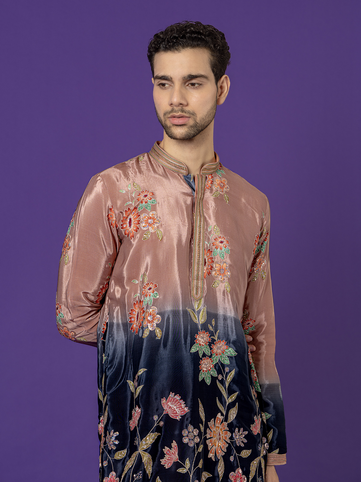 Vibrant and festive, this onion pink and black silk kurta set is designed to make a statement. Featuring a Chinese collar and full sleeves, it is adorned with sequins and resham work over rich prints. Paired with a traditional salwar, it’s perfect for festive and Eid occasions.