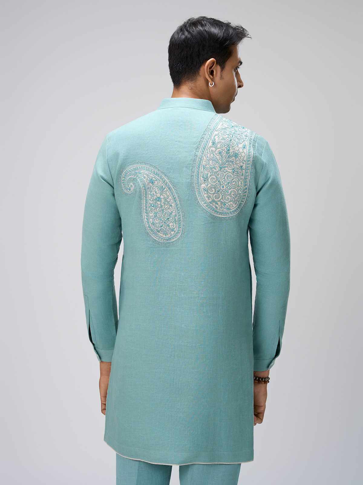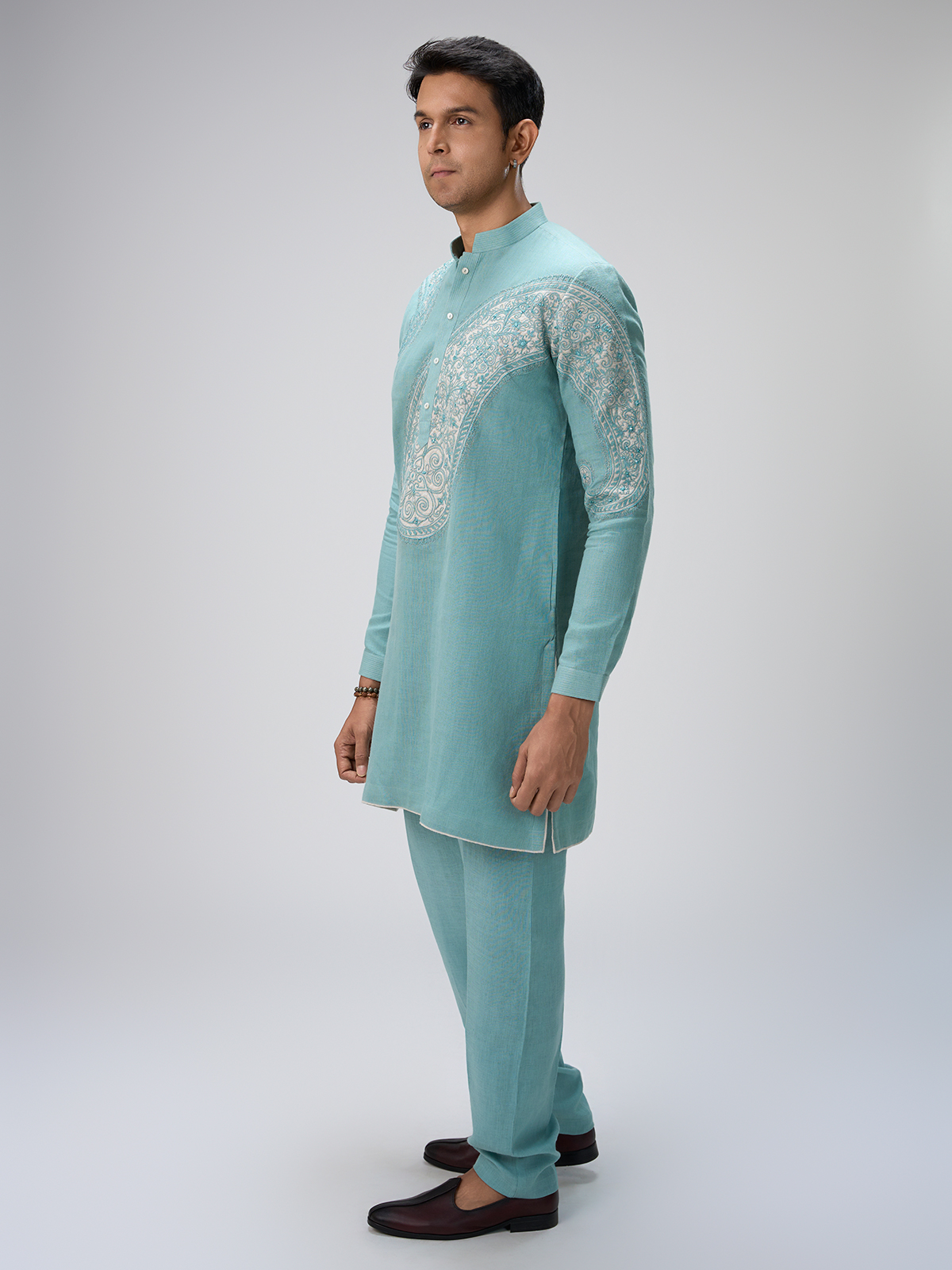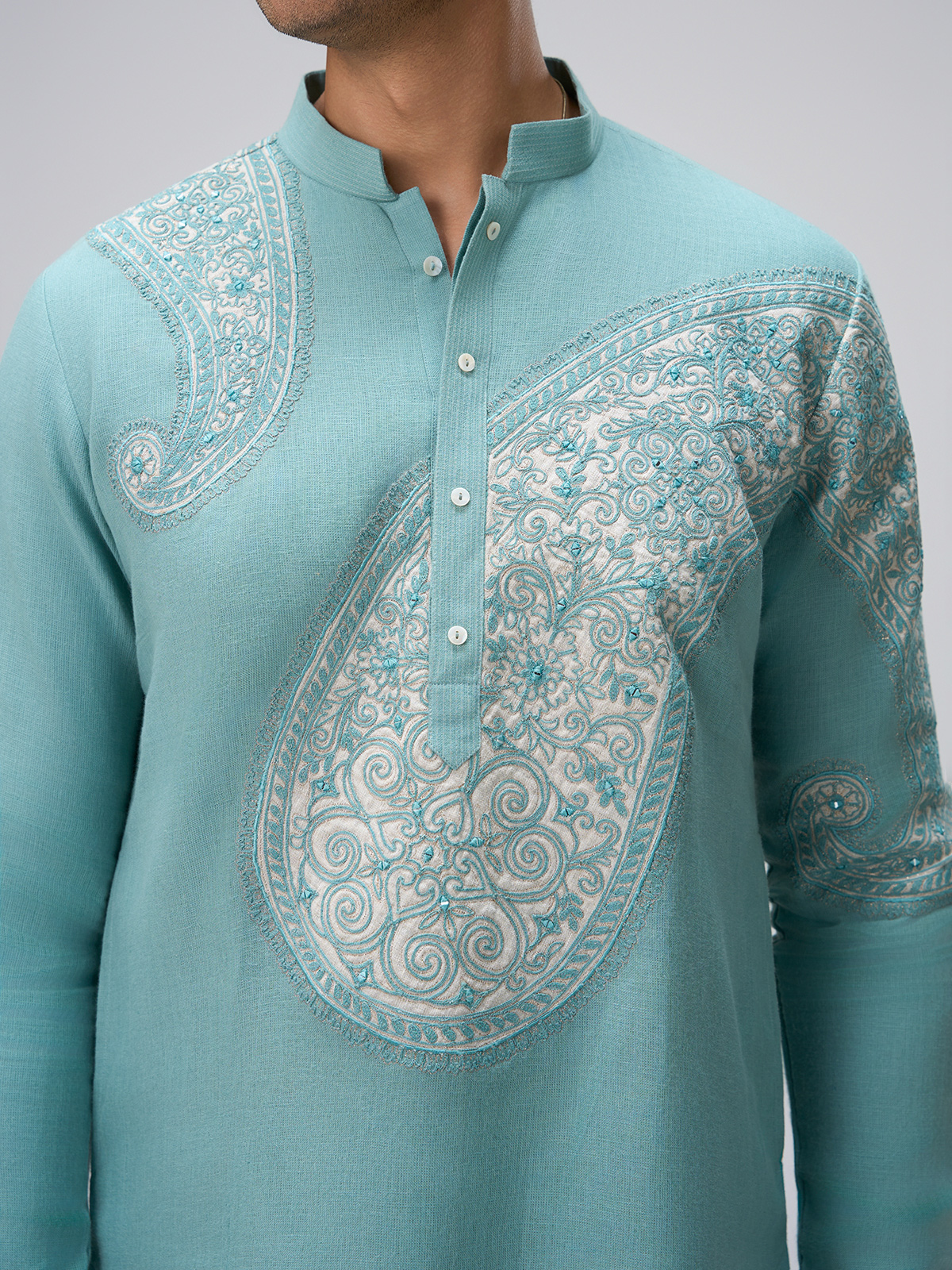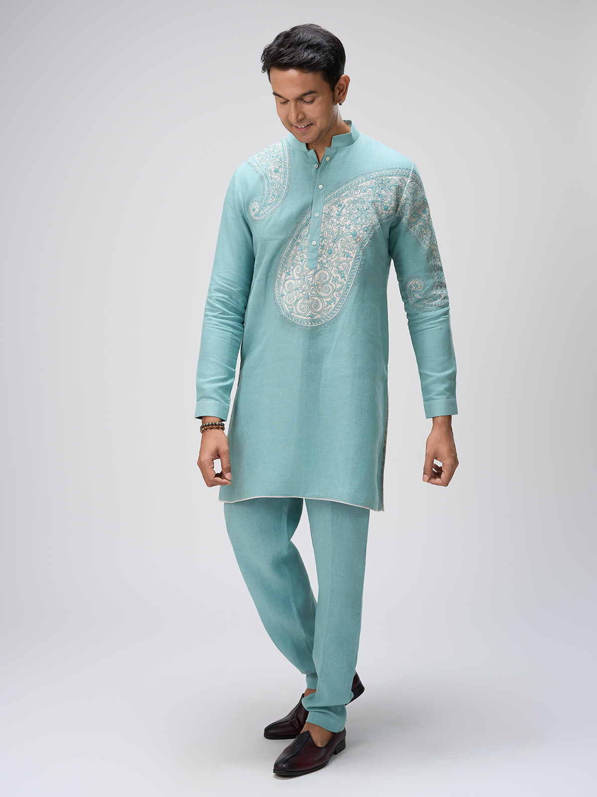 This sky blue linen kurta presents aabla, resham, thread and embroidery detailing that adds bright cultural charm. The chinese collar lends graceful structure ideal for weddings and receptions. Paired with a pant, it balances intricate work with comfortable wear.