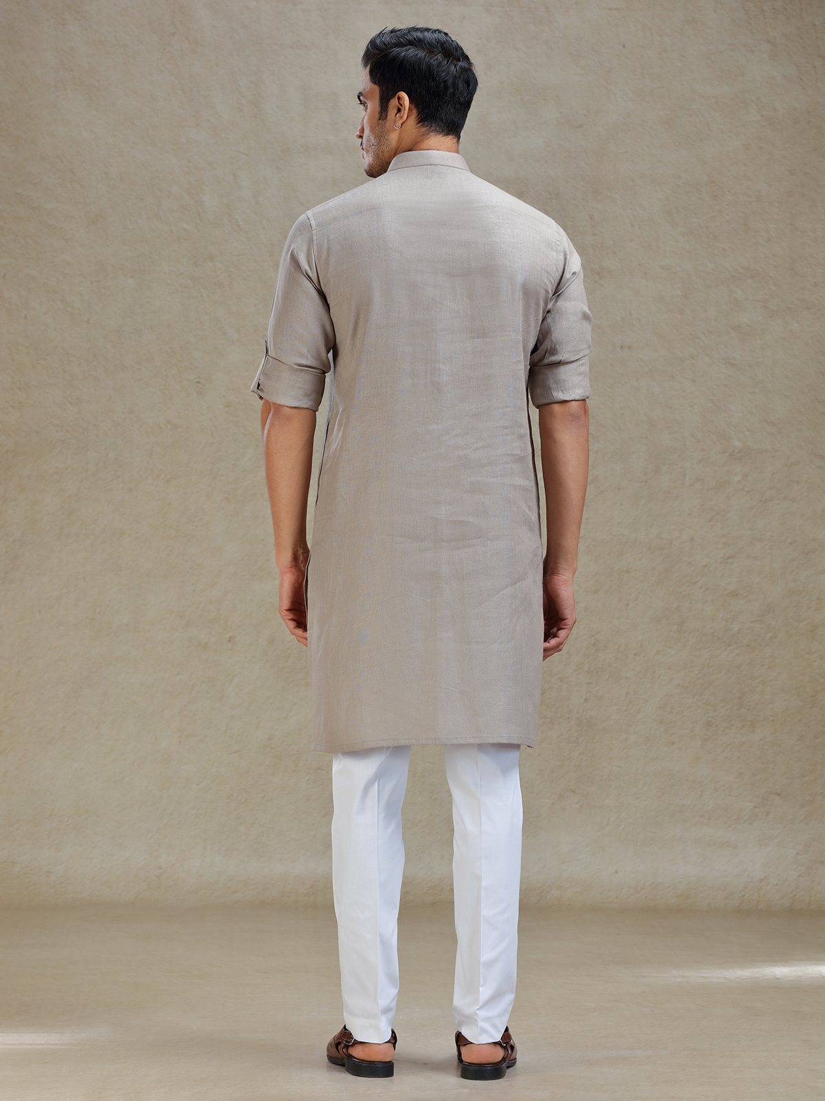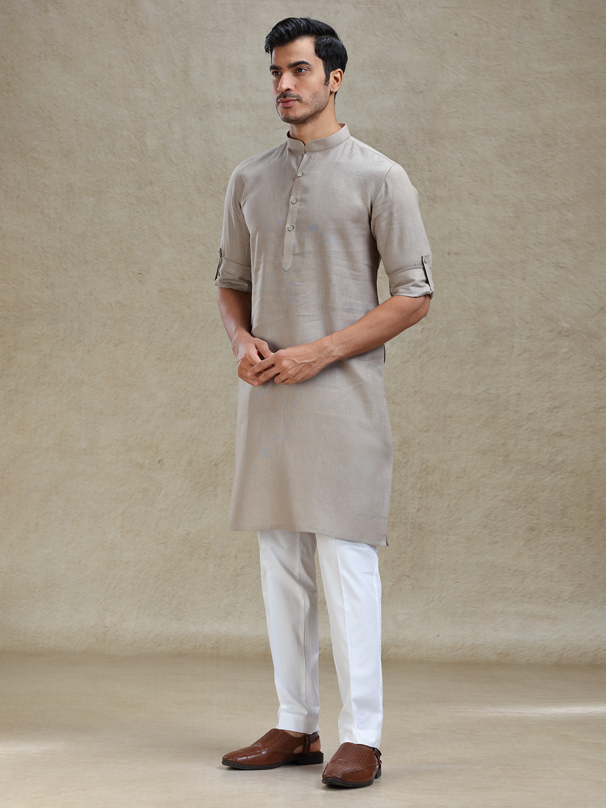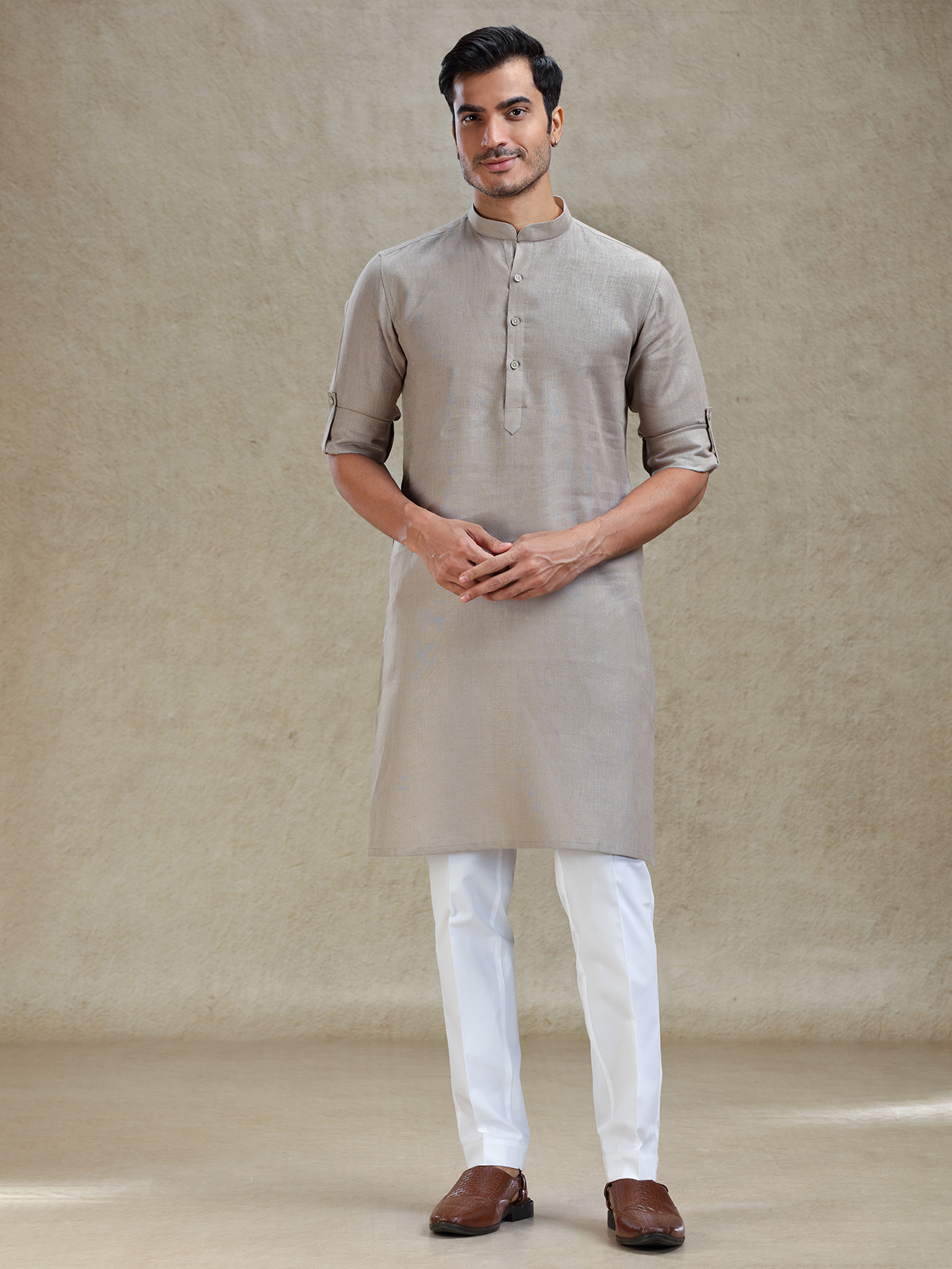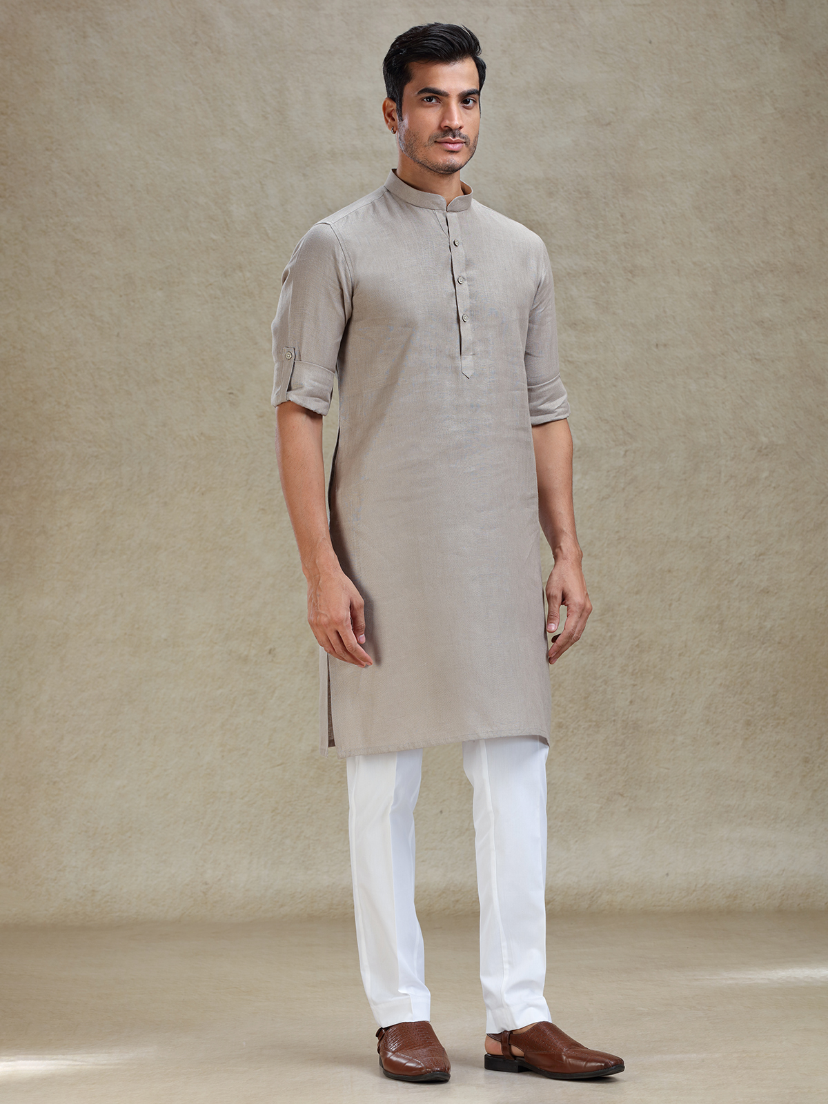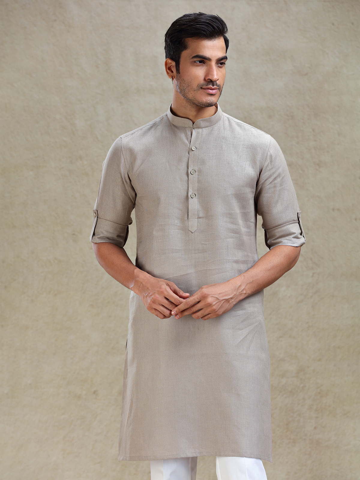 Stay chic and stylish this celebratory season in our stone grey kurta set. crafted on a luxurious linen base, this design features a timeless mandarin collar and full sleeves for a lightweight, comfortable fit perfect for pooja ceremonies and festive celebrations. the set includes the kurta and bottom.