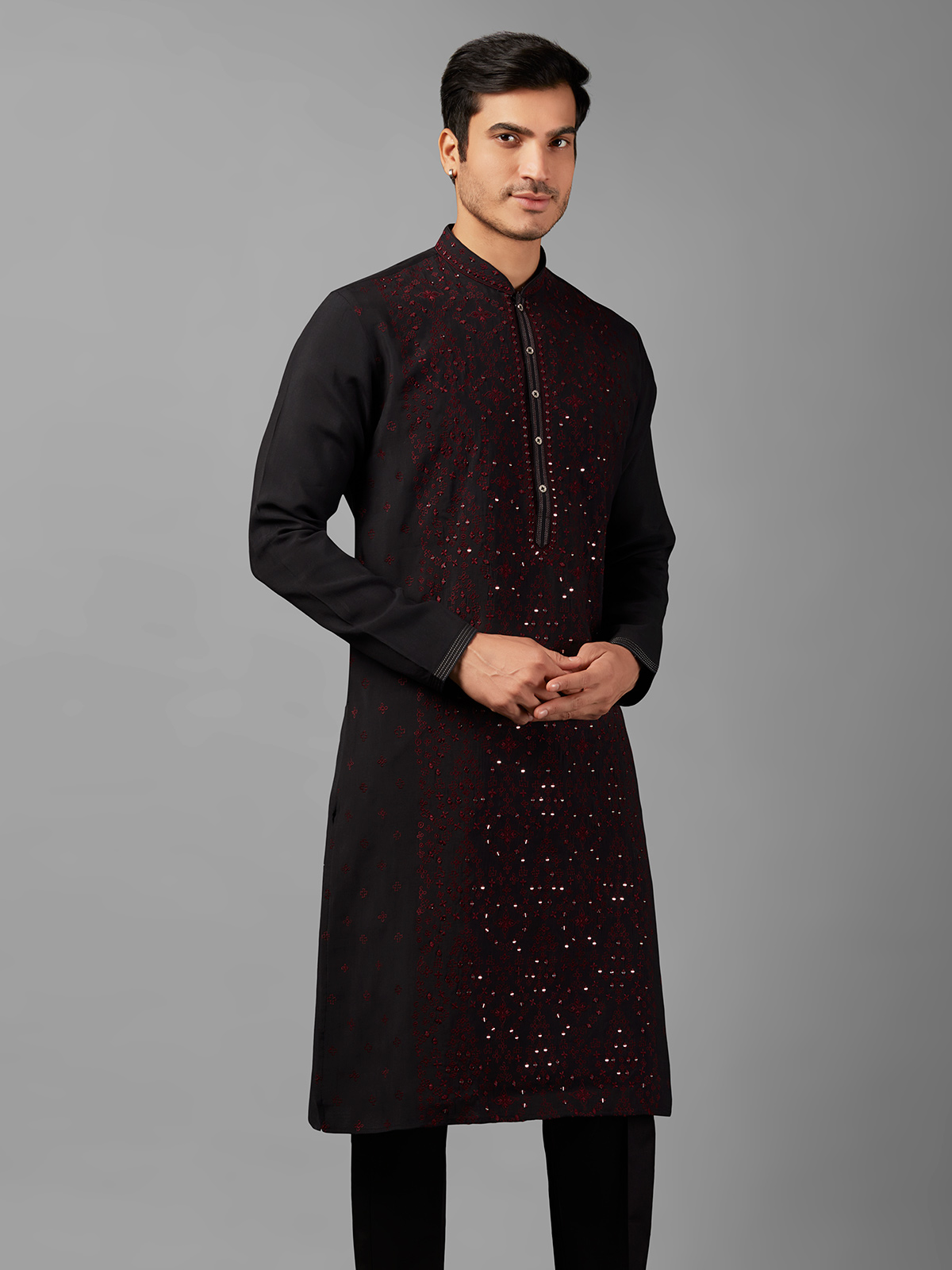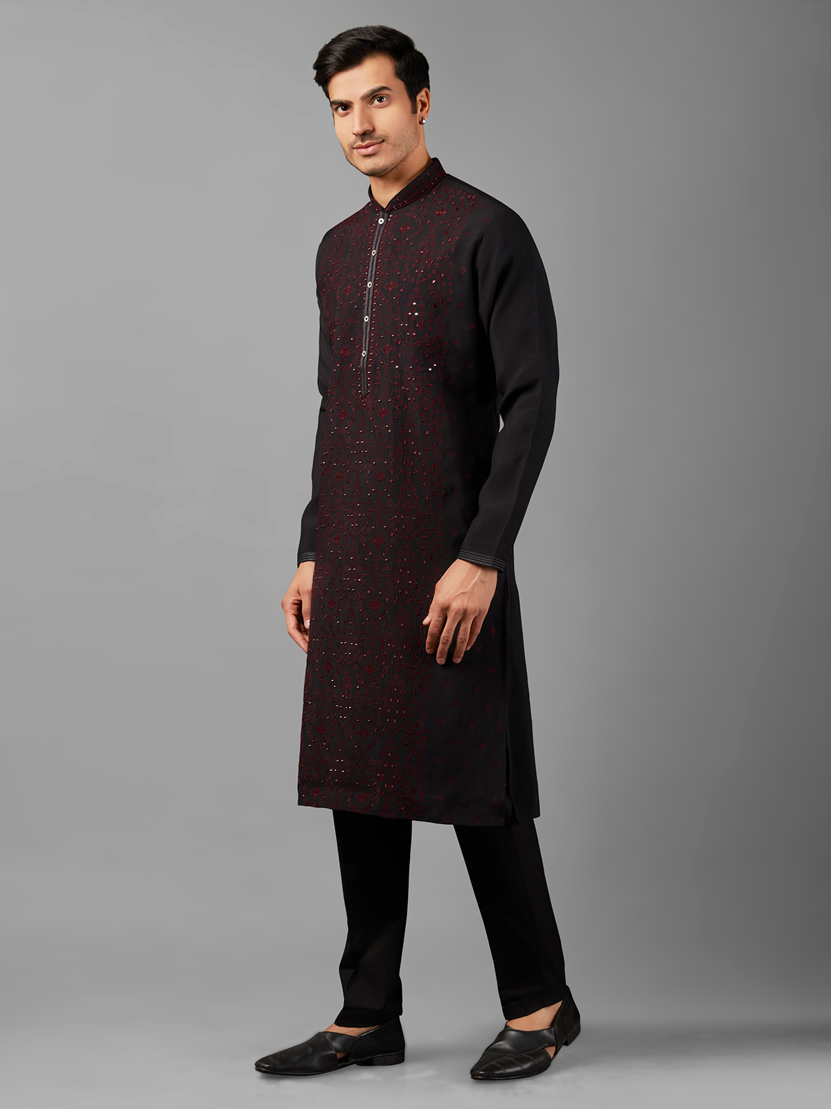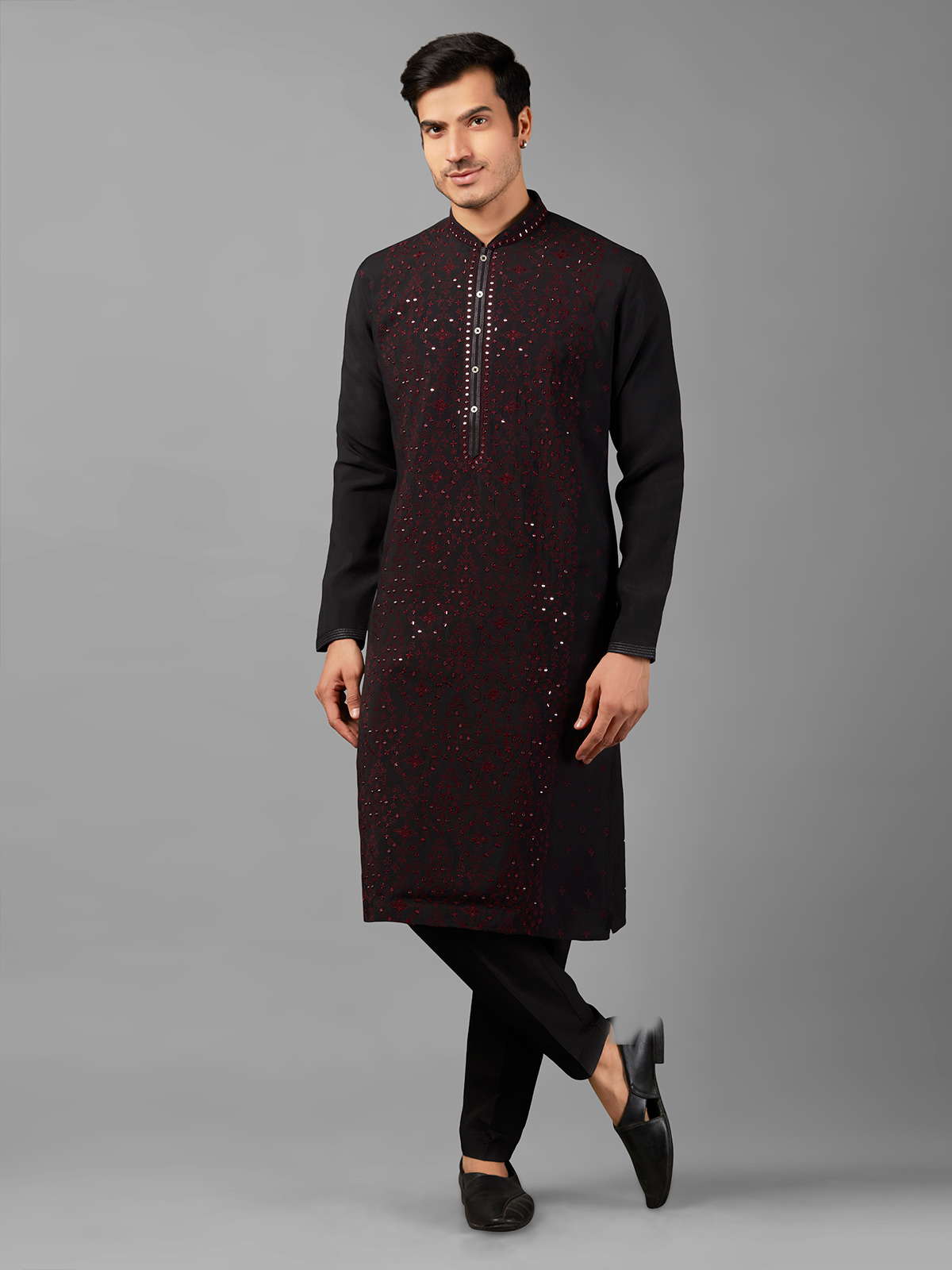 Make a statement with the trendy black silk kurta suit, featuring exquisite embroidery and mirror work. With its mandarin collar and full sleeves, it offers refined elegance and comes paired with a bottom for a complete look.