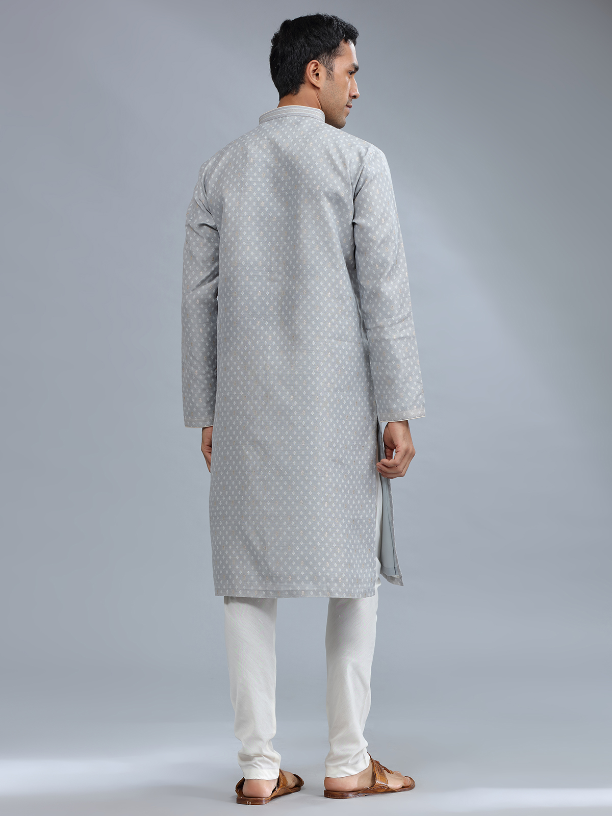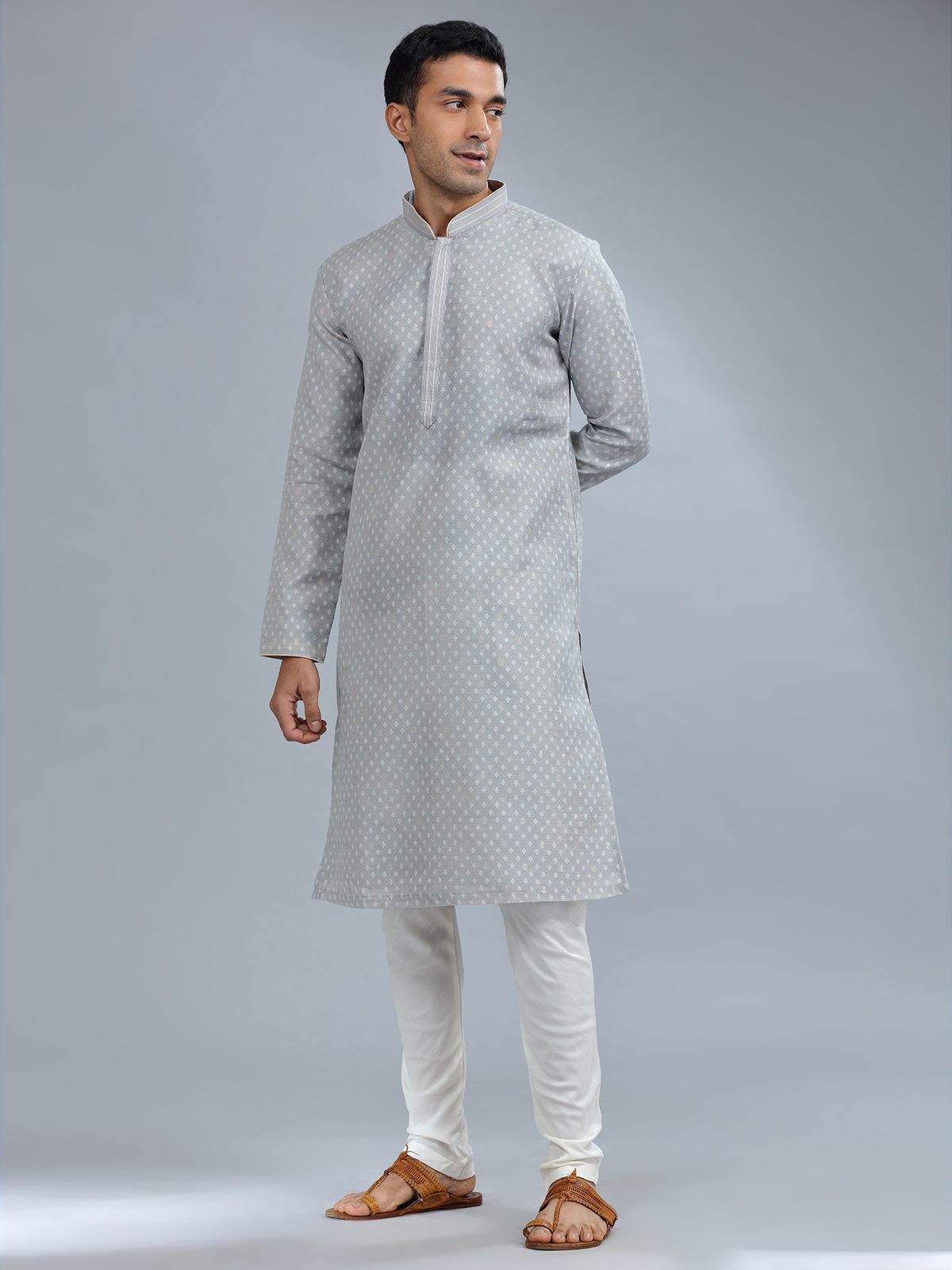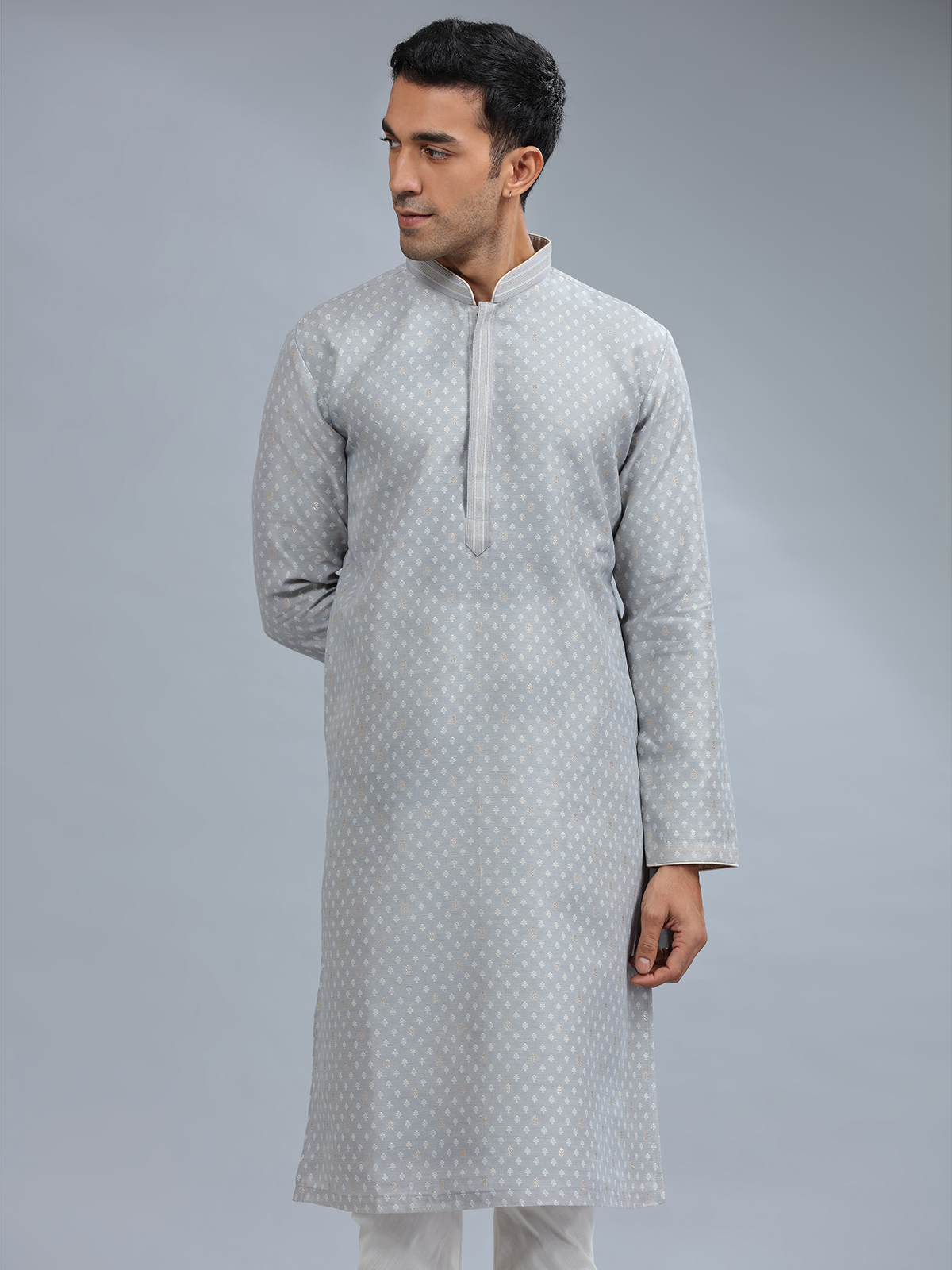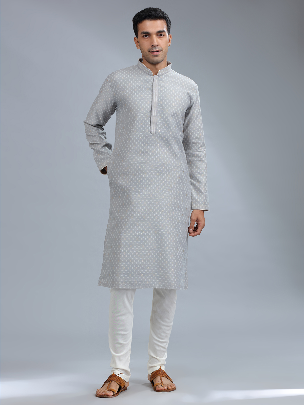 Discover ultimate comfort and traditional appeal with our grey silk kurta pajama. Adorned with captivating zari work, this ensemble features a mandarin collar and full sleeves, complete with a bottom.