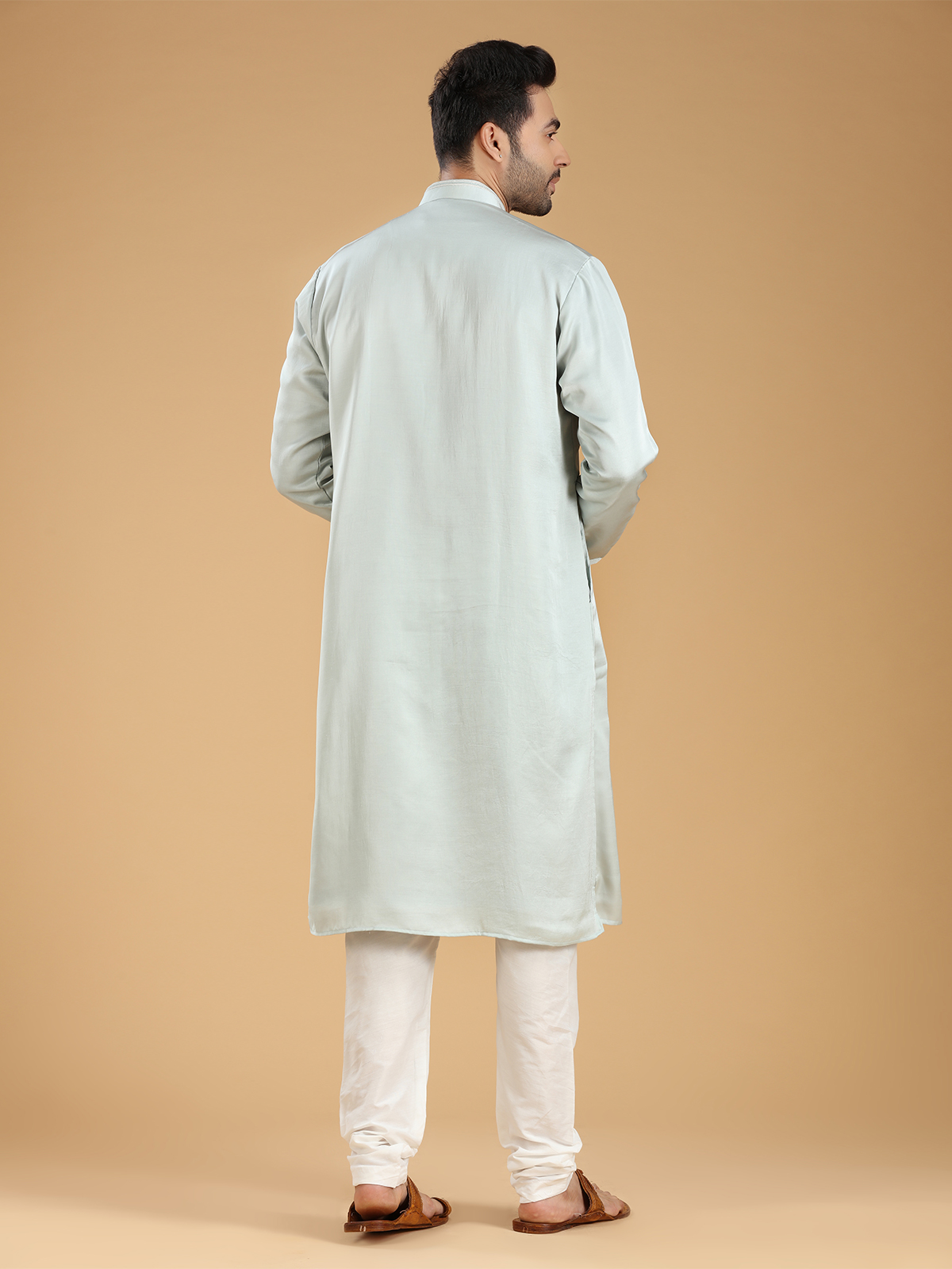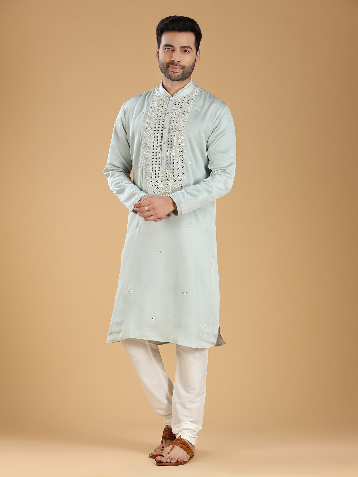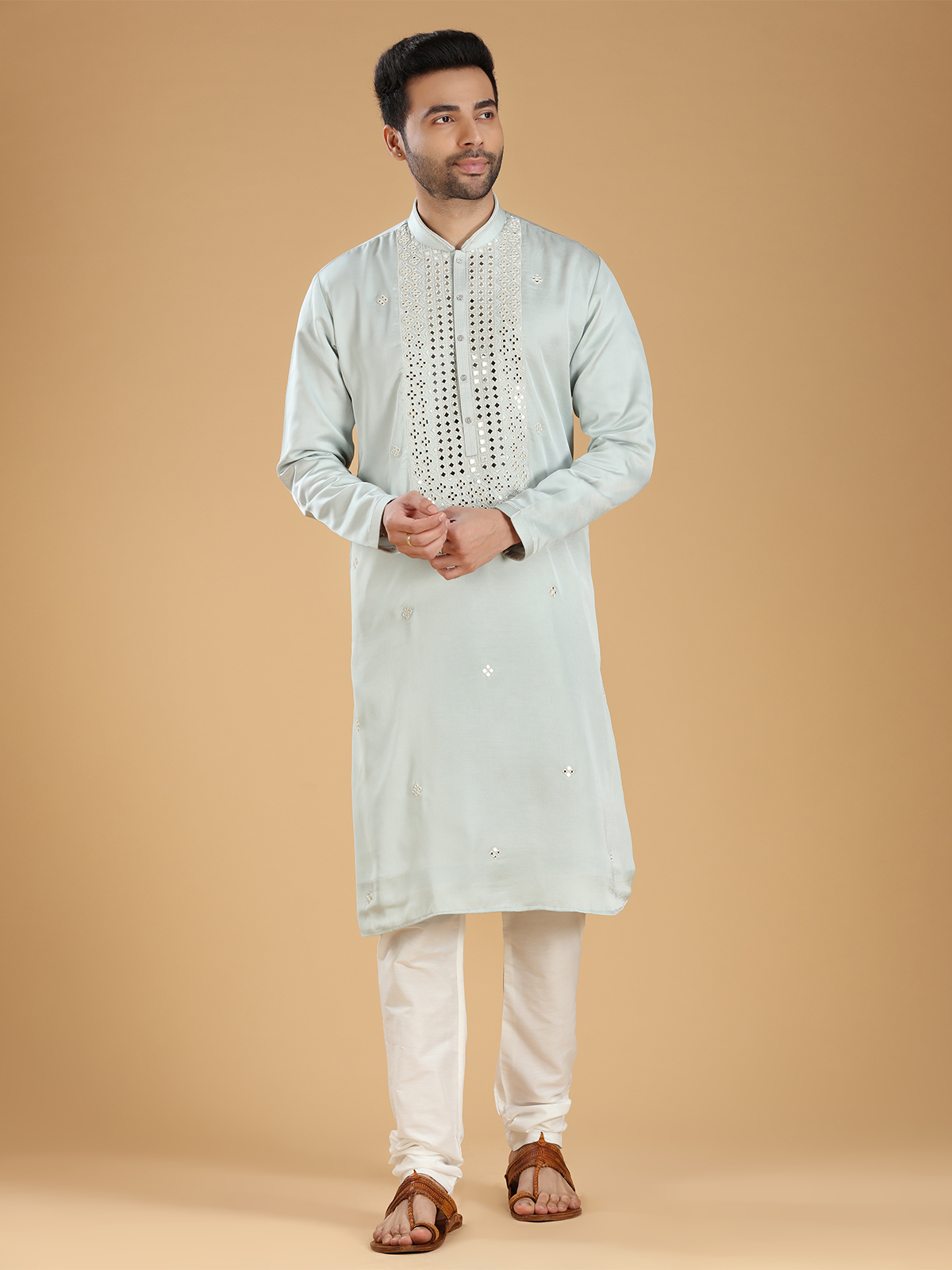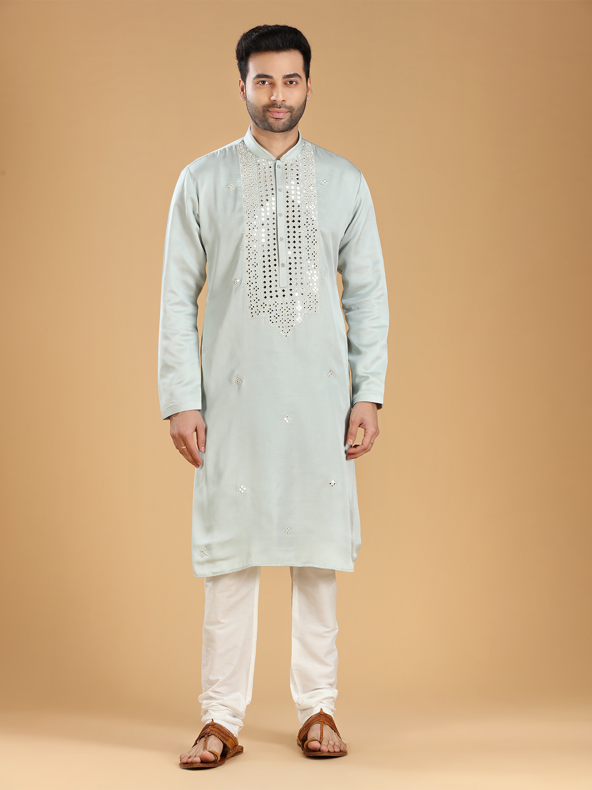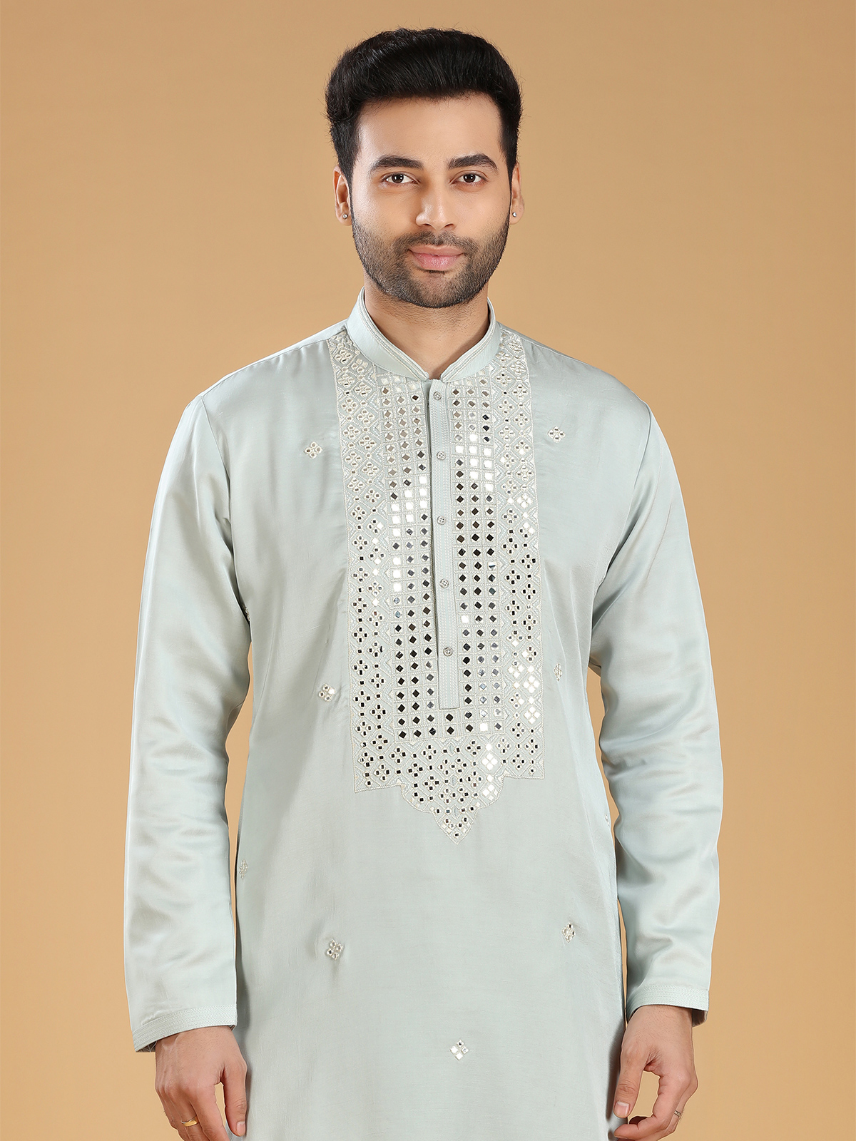 Stay in vogue with this latest light grey silk kurta suit crafted from silk fabric with mirror and resham work. Perfect for any time of day and season, it features a mandarin collar and full sleeves and comes with a bottom.
