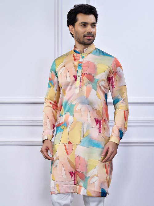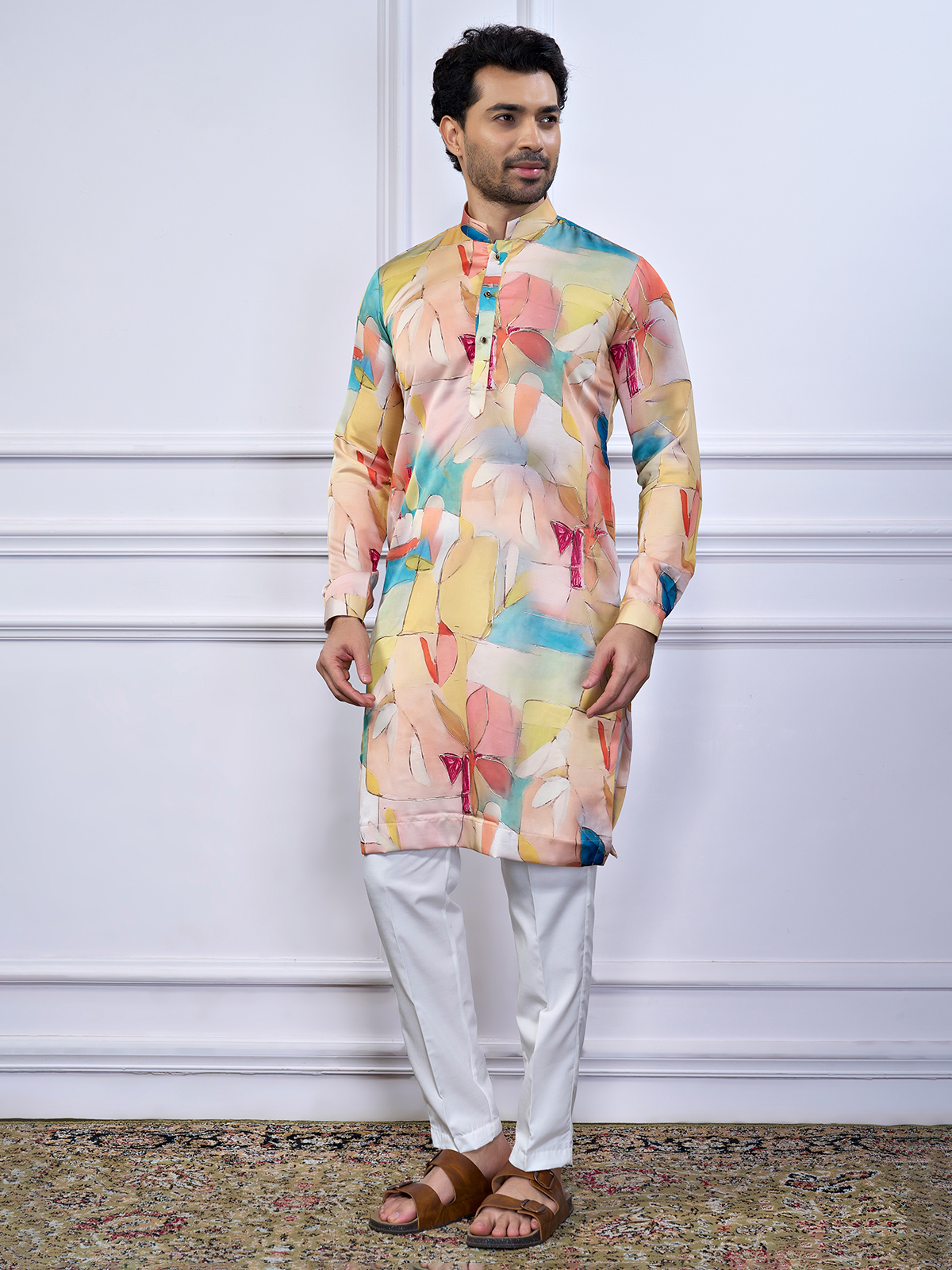 This multi-color thread-woven cotton kurta suit is a festive favorite. Comfortable and stylish with full sleeves and a mandarin collar. Comes with a bottom.