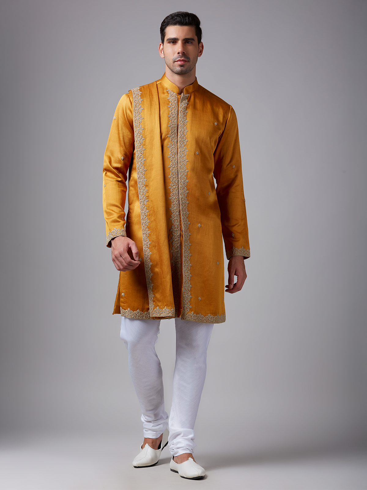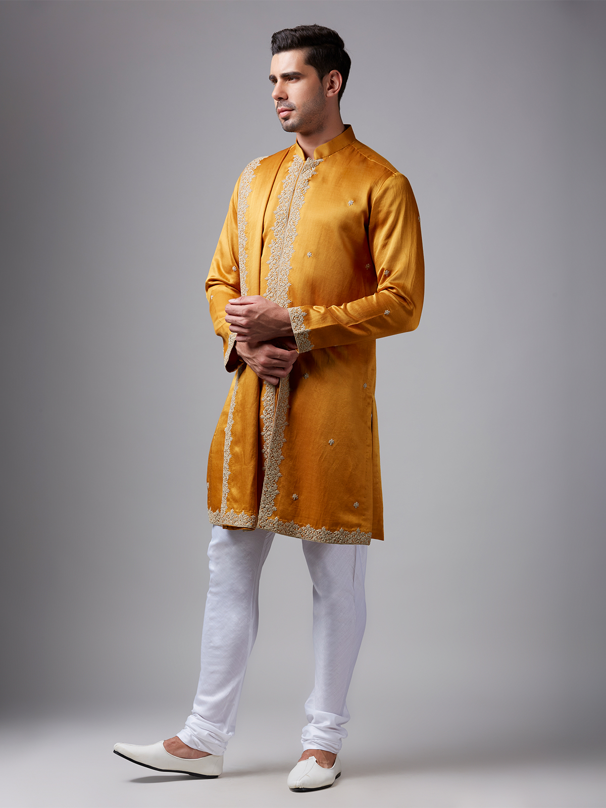 Embrace versatility with this classy mustard yellow silk kurta suit, boasting a mandarin collar, full sleeves, and intricate handwork design, perfect for any festive occasion.
