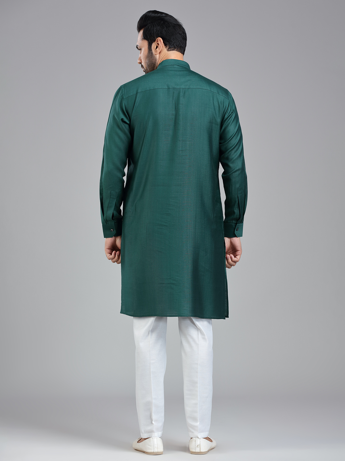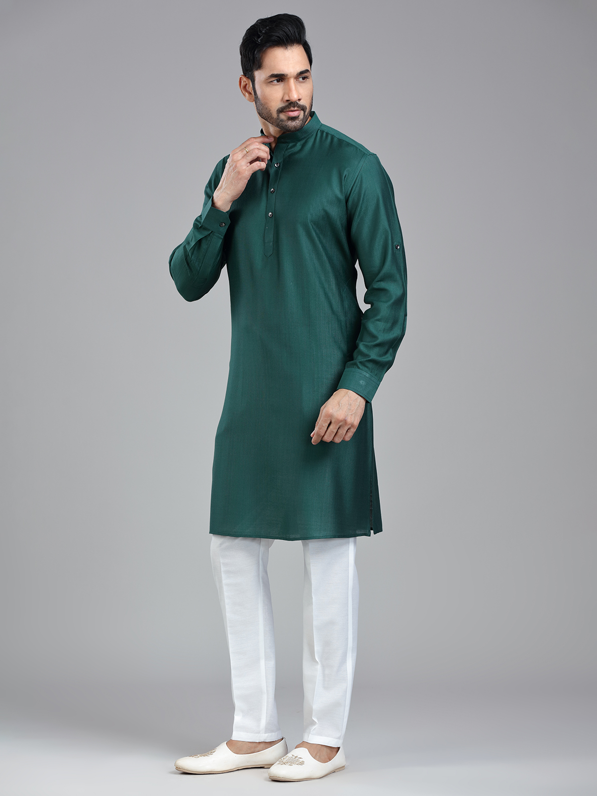 Add a cheerful vibe to your occasion with this pine green kurta suit. Made from rayon cotton fabric, its understated design is complemented by a mandarin collar for comfort. The white bottom ties the entire look together.
