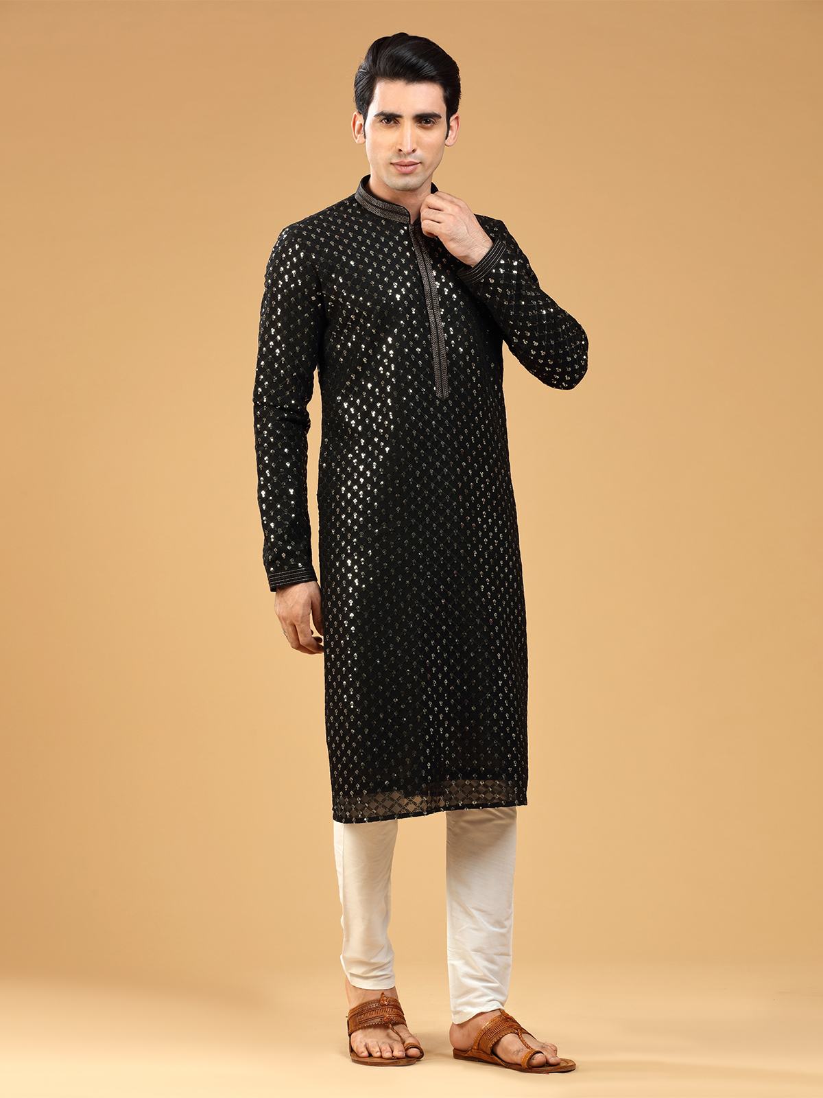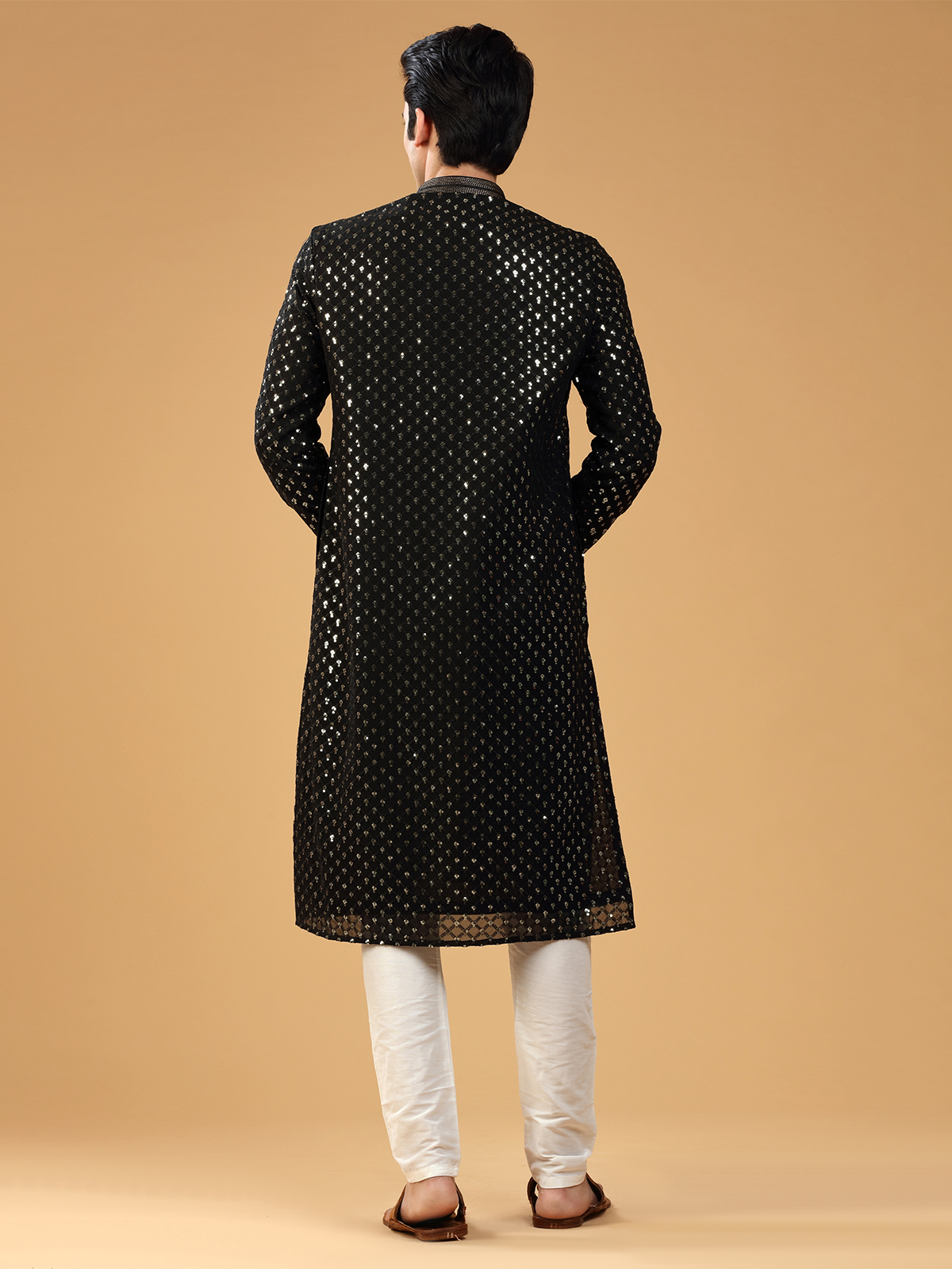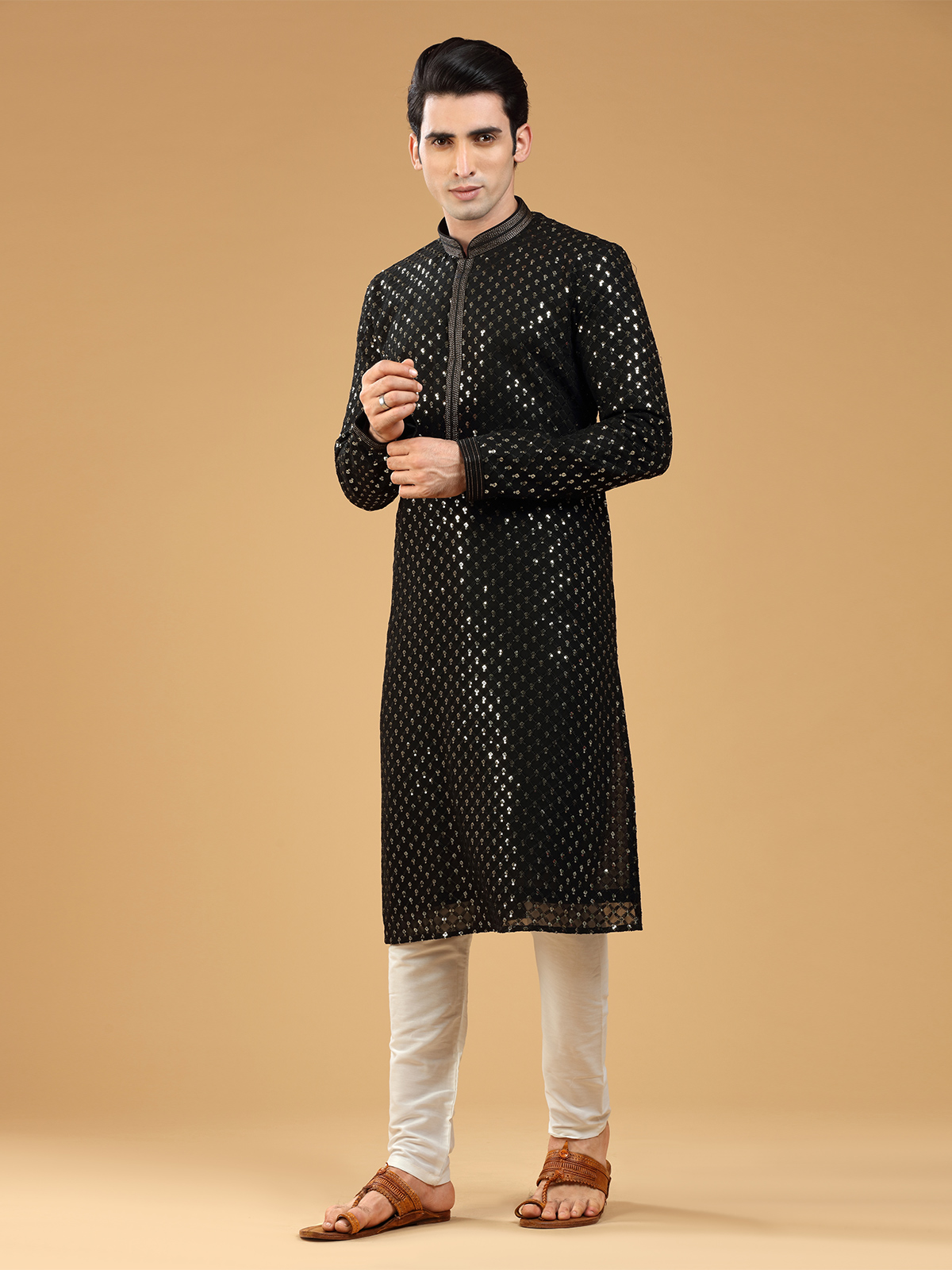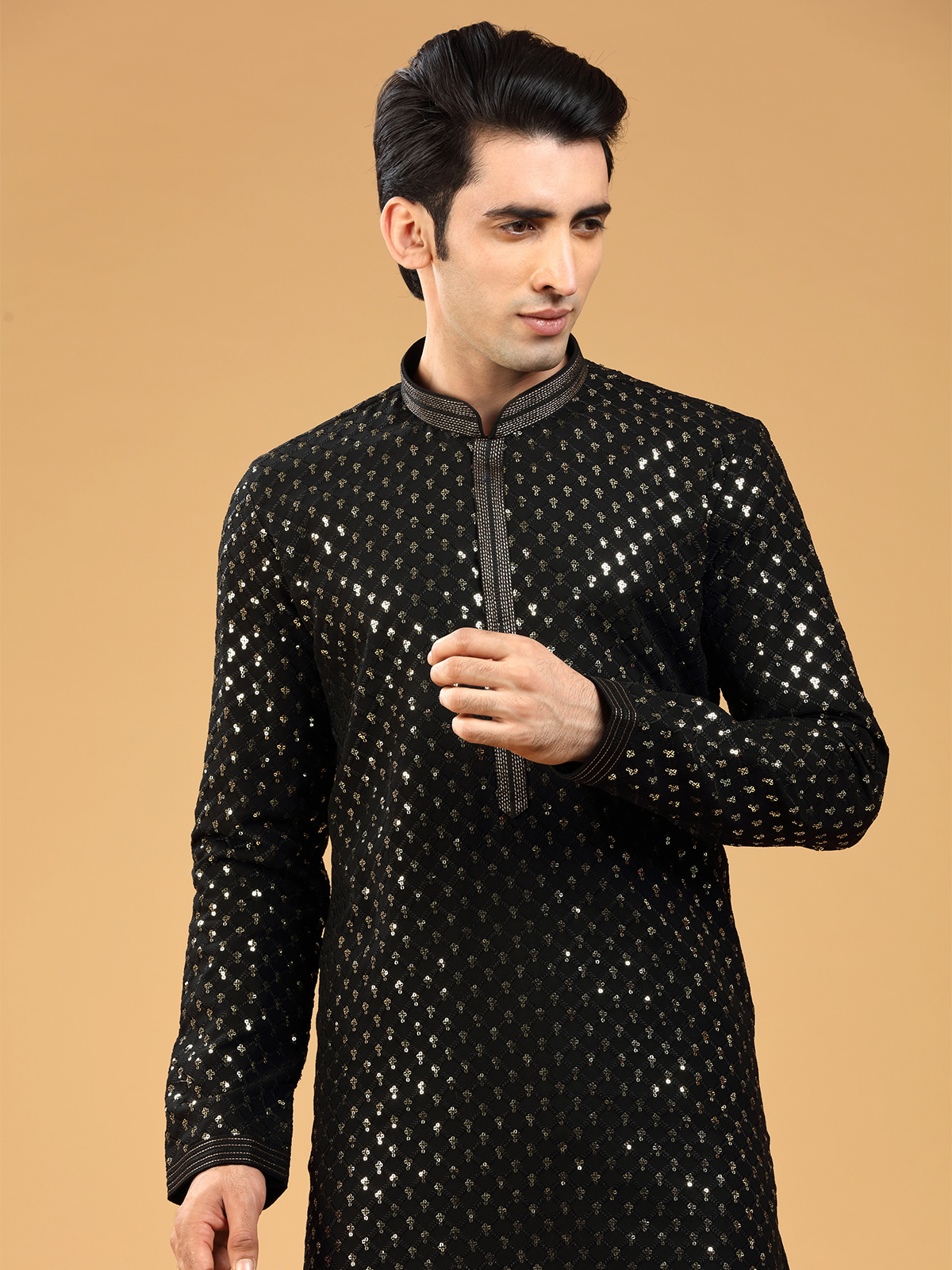 Add a trendy piece to your ethnic wardrobe with this black georgette kurta suit, embellished with resham and sequins work. It features a mandarin collar and full sleeves, and comes with a bottom.