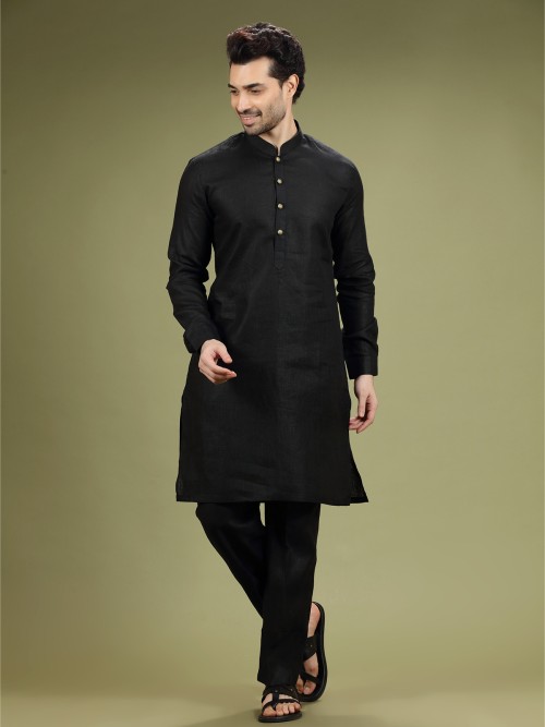 Make a fashion statement with this stylish black plain linen kurta suit. The mandarin collar and full sleeves add a touch of sophistication. Comes with a bottom.